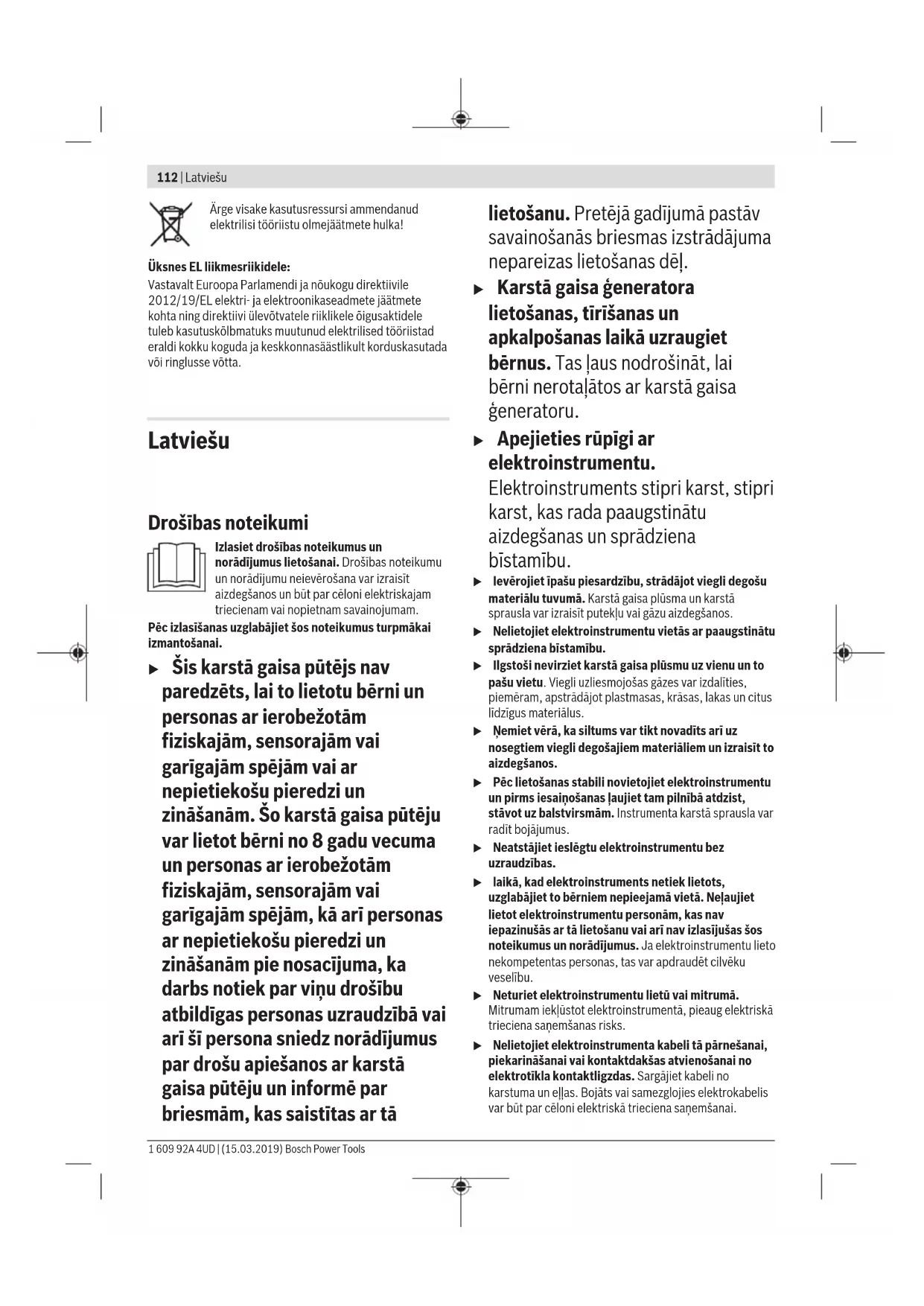 Bosch Power Tools 1 609 92A 4UD | (15.03.2019)114 | Latviešu Lietošana Uzsākot lietošanu u Nodrošiniet pareiza elektrotīkla sprieguma padevi! Elektrobarošanas avota spriegumam jāatbilst vērtībai, kas ir norādīta uz elektroinstrumenta marķējuma plāksnītes. Dūmu veidošanās, pirmo reizi iedarbinot instrumentu Rūpnīcā uz instrumenta metāla virsmām tiek uzklāts pretkorozijas aizsargslānis. Pirmo reizi iedarbinot instrumentu, šis aizsargslānis iztvaikojot rada dūmus. Ieslēgšana Pārvietojiet ieslēdzēju(2) augšup. Izslēgšana Pārvietojiet ieslēdzēju(2) lejup stāvoklī0. u Pēc elektroinstrumenta ilgstošas darbināšanas pie augstas temperatūras pirms izslēgšanas ļaujiet tam atdzist. Šim nolūkam ļaujiet elektroinstrumentam neilgu laiku darboties pie zemākās iestatāmās temperatūras vērtības. Gaisa plūsmas regulēšana Ar ieslēdzēju(2) var pakāpjveidā regulēt gaisa plūsmu: Gaisa plūsmas regulēšanas pakāpe l/min °C 150–300 50–630 300–500 50–630 Samaziniet gaisa plūsmu, ja jānovērš apstrādājamajam priekšmetam tuvu esošu virsmu pārkaršana vai viegla priekšmeta pārvietošanās, uz to iedarbojoties pārāk stiprai gaisa plūsmai. Temperatūras regulēšana Ar pirkstratu(5) var regulēt gaisa plūsmas temperatūru. Pirkstrata stāvokļiem atbilst šādas temperatūras vērtības: Pirkstrata stāvoklis Temperatūra, °C 1 50–80 2 130–160 3 210–240 4 280–310 5 340–370 6 410–440 7 480–510 8 550–580 9 620–630 Pirkstrata stāvoklis 1 ir izmantojams sakarsušu priekšmetu atdzesēšanai vai krāsojuma žāvēšanai. Tas noder arī elektroinstrumenta dzesēšanai pirms novietošanas uzglabāšanai vai pirms sprauslas nomaiņas. Norādījumi darbam u Pirms elektroinstrumenta apkopes vai apkalpošanas izvelciet tā elektrokabeļa kontaktdakšu no barojošā elektrotīkla kontaktligzdas. Norāde: netuviniet sprauslu(3) apstrādājamajam priekšmetam. Gaisa plūsma, kas atstarojas no apstrādājamā priekšmeta virsmas, var izraisīt elektroinstrumenta pārkaršanu. Termoizolējošās aptveres noņemšana Veicot darbu īpaši šaurās vietās, var noņemt termoizolējošo aptveri(4), to pagriežot. u Ievērojiet piesardzību, nepieskarieties karstajai sprauslai! Strādājot bez termoizolējošās aptveres, pieaug iespēja iegūt apdegumus. Pirms termoizolējošās aptveres(4) noņemšanas vai nostiprināšanas izslēdziet elektroinstrumentu un nogaidiet, līdz tas ir atdzisis. Lai panāktu ātrāku elektroinstrumenta atdzišanu, to var neilgu laiku darbināt pie zemākā regulējamās temperatūras iestatījuma. Elektroinstrumenta novietošana Novietojiet elektroinstrumentu uz novietošanas balstiem(1), lai ļautu tam atdzist vai arī, lai izbrīvētu darbam abas rokas. u Strādājot ar novietotu elektroinstrumentu, ievērojiet īpašu piesardzību! Šādā stāvoklī viegli var iegūt apdegumus, pieskaroties elektroinstrumenta karstajai sprauslai vai rokām nejauši nonākot karstajā gaisa plūsmā. Novietojiet elektroinstrumentu uz līdzenas, stabilas virsmas. Nodrošiniet novietoto elektroinstrumentu pret apgāšanos. Nodrošiniet, lai elektrokabelis atrastos ārpus darba zonas tā, lai elektroinstrumentu nevarētu apgāzt vai noraut. Ja elektroinstruments ilgāku laiku netiek lietots, izslēdziet to un izvelciet tā kontaktdakšu no elektrotīkla kontaktligzdas. Darba piemēri (attēliA–G) Darba operāciju piemēriem atbilstošie attēli ir sniegti grafiskajās lappusēs. Attālumam starp sprauslu un apstrādājamo priekšmetu jāatbilst apstrādājamā materiāla (metāla, plastmasas u.c.) īpašībām un paredzētajam apstrādes veidam. Optimālo temperatūru attiecīgajam pielietojumam var noteikt praktisku mēģinājumu ceļā. Vienmēr vispirms veiciet apstrādes mēģinājumu attiecībā uz gaisa plūsmu un temperatūru. Uzsāciet darbu, izvēloties lielāku attālumu un zemāko jaudas pakāpi. Piemeklējiet attālumu un jaudas pakāpi pēc vajadzības. Ja neesat pārliecināts par to, kāds materiāls tiek apstrādāts vai kāda ir karstā gaisa plūsmas iedarbība uz materiālu, pārbaudiet šo iedarbību kādā slēptā materiāla vietā. Visas darbības, kas parādītas darba piemēros, izņemot piemēru „Krāsas noņemšana no logu rāmjiem“, var veikt arī bez piederumiem. Taču šeit ieteikto piederumu izmantošana 1 609 92A 4UD | (15.03.2019) Bosch Power ToolsLatviešu | 115 vienkāršo darbu un ļauj ievērojami paaugstināt apstrādes kvalitāti. u Ievērojiet piesardzību, veicot sprauslu nomaiņu! Nepieskarieties karstajai sprauslai. Nogaidiet, līdz elektroinstruments ir atdzisis, un sprauslu nomaiņas laikā nēsājiet aizsargcimdus. Pieskaršanās karstajai sprauslai var izraisīt apdegumus. Lai panāktu ātrāku elektroinstrumenta atdzišanu, to var neilgu laiku darbināt pie zemākā regulējamās temperatūras iestatījuma. Krāsas noņemšana un līmvielu mīkstināšana (attēlsA) Nostipriniet uz instrumenta plakano sprauslu(6) (piederums). Mīkstiniet krāsu, īslaicīgi iedarbojoties uz to ar karstā gaisa plūsmu, un tad atdaliet krāsu no virsmas ar tīru špakteļlāpstiņu. Ilgstoša karstā gaisa iedarbība izraisa krāsas piedegšanu un apgrūtina tās noņemšanu. Daudzas līmes karstuma iedarbības rezultātā kļūst mīkstas. Pēc līmes uzkarsēšanas kļūst iespējams atdalīt salīmētās virsmas vai arī noņemt lieko līmes daudzumu. Krāsas noņemšana no logu rāmjiem (attēlsB) u Noteikti lietojiet sprauslu stikla aizsardzībai (7) (papildpiederums). Logu stikli karstumā var viegli saplīst. No profilētām rāmju virsmām krāsu var noņemt, to atdalot no virsmas ar piemērotas špakteļlāpstiņas palīdzību un tad notīrot krāsas paliekas ar mīkstu stiepļu suku. Ūdensvada cauruļu atkausēšana (attēlsC) u Pirms caurules karsēšanas pārliecinieties, ka tā tiešām ir ūdensvada caurule. Ūdensvada caurules nereti ir grūti atšķirt no gāzes