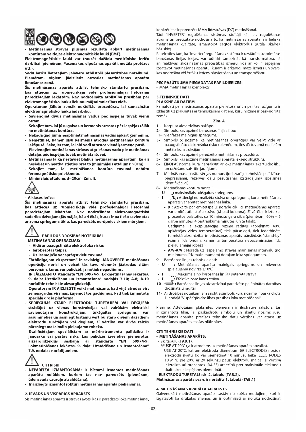 - METINĀŠANAS APARĀTS: - sk. tabulu (TAB.1). - %USE AT 20°C (ja ir atrodams uz metināšanas aparāta apvalka). USE AT 20°C, katram elektroda diametram (Ø ELECTRODE) norāda elektrodu skaitu, ko var piemetināt 10 minūšu laikā (ELECTRODES 10 MIN) pie 20°C ar 20 sekunžu pauzi elektrodu maiņai; šī vērtība ir izteikta arī procentos (%USE) attiecībā pret maksimālo elektrodu skaitu, ko ir iespējams piemetināt. - ELEKTRODU TURĒTĀJS: sk. 2. tabulu (TAB.2). Metināšanas aparāta svars ir norādīts 1. tabulā (TAB.1)