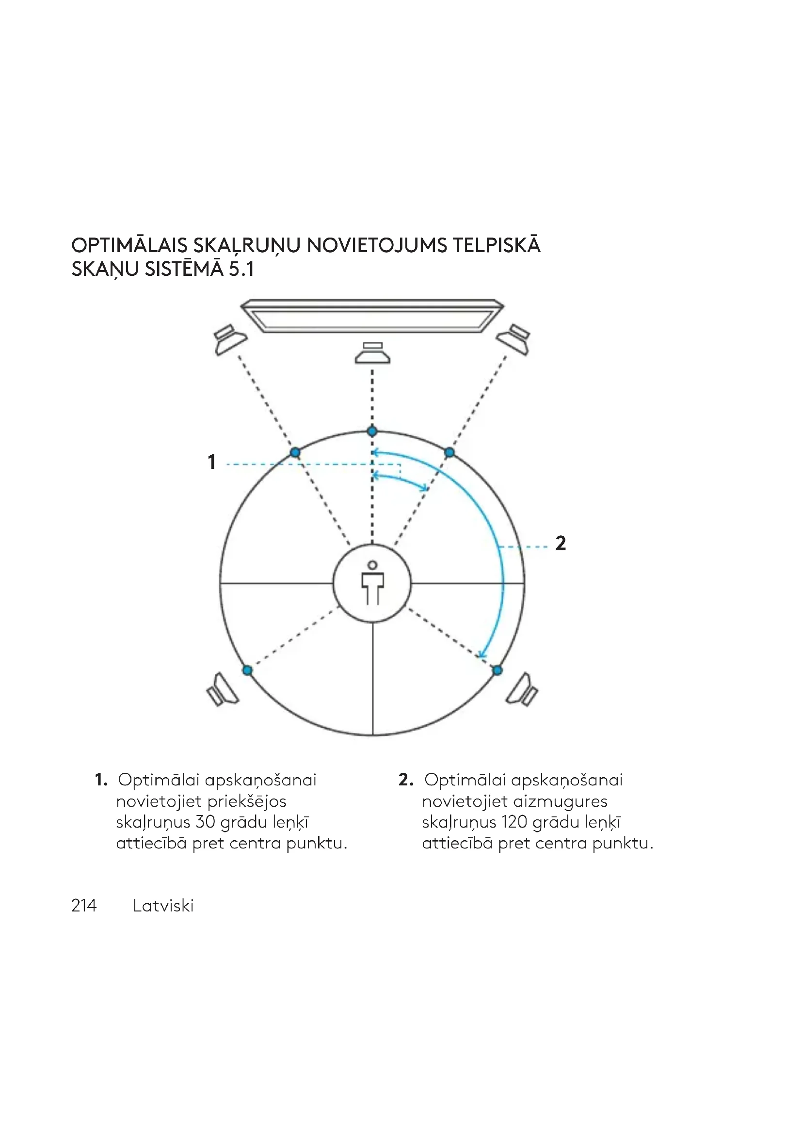 novietojiet aizmugures skaļruņus 120 grādu leņķī attiecībā pret centra punktu.Latviski 215