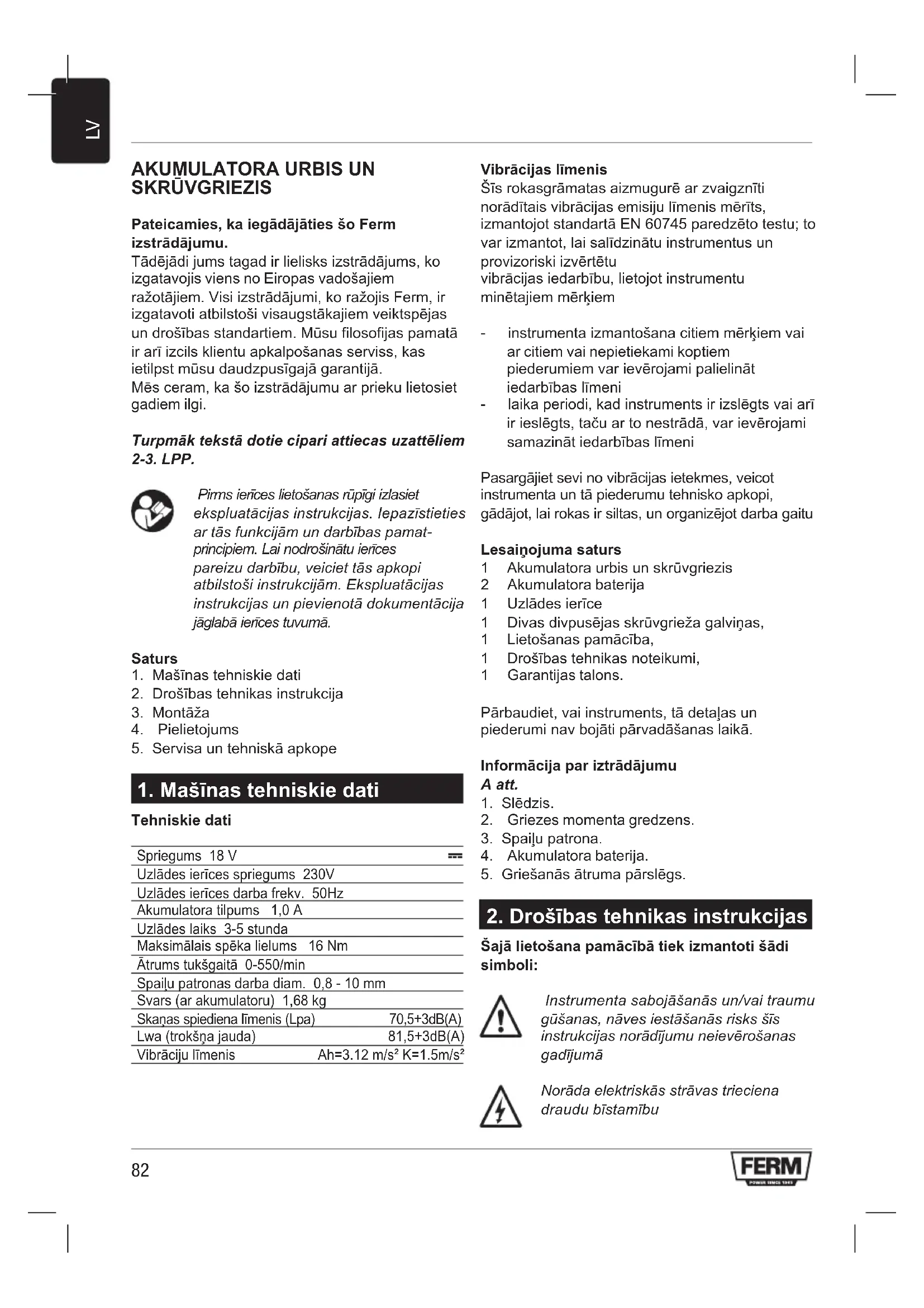 SKRŪVGRIEZIS Pateicamies, ka iegādājāties šo Ferm izstrādājumu. Tādējādi jums tagad ir lielisks izstrādājums, ko izgatavojis viens no Eiropas vadošajiem ražotājiem. Visi izstrādājumi, ko ražojis Ferm, ir izgatavoti atbilstoši visaugstākajiem veiktspējas un drošības standartiem. Mūsu filosofijas pamatā ir arī izcils klientu apkalpošanas serviss, kas ietilpst mūsu daudzpusīgajā garantijā. Mēs ceram, ka šo izstrādājumu ar prieku lietosiet gadiem ilgi. Turpmāk tekstā dotie cipari attiecas uzattēliem 2-3. LPP. Pirms ierīces lietošanas rūpīgi izlasiet ekspluatācijas instrukcijas. Iepazīstieties ar tās funkcijām un darbības pamat- principiem. Lai nodrošinātu ierīces pareizu darbību, veiciet tās apkopi atbilstoši instrukcijām. Ekspluatācijas instrukcijas un pievienotā dokumentācija jāglabā ierīces tuvumā. Saturs