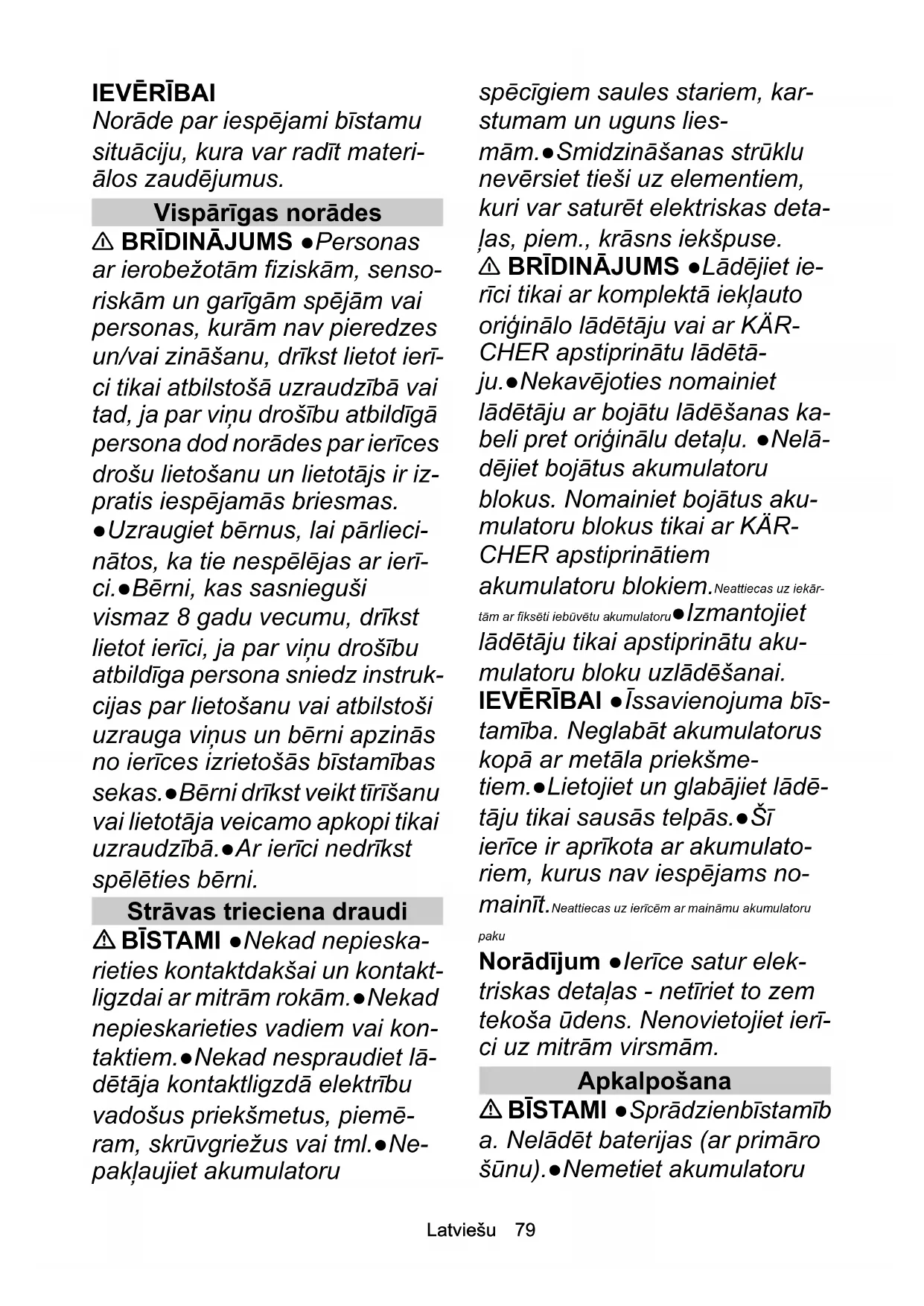 Norāde par iespējami bīstamu situāciju, kura var radīt materi- ālos zaudējumus. Vispārīgas norādes 몇 BRĪDINĀJUMS ●Personas ar ierobežotām fiziskām, senso- riskām un garīgām spējām vai personas, kurām nav pieredzes un/vai zināšanu, drīkst lietot ierī- ci tikai atbilstošā uzraudzībā vai tad, ja par viņu drošību atbildīgā persona dod norādes par ierīces drošu lietošanu un lietotājs ir iz- pratis iespējamās briesmas. ●Uzraugiet bērnus, lai pārlieci- nātos, ka tie nespēlējas ar ierī- ci.●Bērni, kas sasnieguši vismaz 8 gadu vecumu, drīkst lietot ier īci, ja par viņu drošību atbildīga persona sniedz instruk- cijas par lietošanu vai atbilstoši uzrauga viņus un bērni apzinās no ierīces izrietošās bīstamības sekas.●Bērni drīkst veikt tīrīšanu vai lietotāja veicamo apkopi tikai uzraudzībā.●Ar ierīci nedrīkst spēlēties bērni. Strāvas trieciena draudi BĪSTAMI ●Nekad nepieska- rieties kontaktdakšai un kontakt- ligzdai ar mitrām rokām.●Nekad nepieskarieties vadiem vai kon- taktiem.●Nekad nespraudiet lā- dētāja kontaktligzdā elektrību vadošus priekšmetus, piemē- ram, skrūvgriežus vai tml.●Ne- pakļaujiet akumulatoru spēcīgiem saules stariem, kar- stumam un uguns lies- mām.●Smidzināšanas strūklu nevērsiet tieši uz elementiem, kuri var saturēt elektriskas deta- ļas, piem., krāsns iekšpuse. 몇 BRĪDINĀJUMS ●Lādējiet ie- rīci tikai ar komplektā iekļauto oriģinālo lādētāju vai ar KÄR- CHER apstiprinātu lādētā- ju.●Nekavējoties nomainiet lādētāju ar bojātu lādēšanas ka- beli pret oriģinālu detaļu. ●Nelā- dējiet bojātus akumulatoru blokus. Nomainiet bojātus aku- mulatoru blokus tikai ar KÄR- CHER apstiprinātiem akumulatoru blokiem. Neattiecas uz iekār- tām ar fiksēti iebūvētu akumulatoru●Izmantojiet lādētāju tikai apstiprinātu aku- mulatoru bloku uzlādēšanai. IEVĒRĪBAI ●Īssavienojuma bīs- tamība. Neglabāt akumulatorus kopā ar metāla priekšme- tiem.●Lietojiet un glabājiet lādē- tāju tikai sausās telpās.●Šī ierīce ir aprīkota ar akumulato- riem, kurus nav iespējams no- mainīt.Neattiecas uz ierīcēm ar maināmu akumulatoru paku Norādījum ●Ierīce satur elek- triskas detaļas - netīriet to zem tekoša ūdens. Nenovietojiet ierī- ci uz mitrām virsmām. Apkalpošana BĪSTAMI ●Sprādzienbīstamīb a. Nelādēt baterijas (ar primāro šūnu).●Nemetiet akumulatoru80 Latviešu blokus ugunī vai sadzīves atkri- tumos.●Izvairieties no kontakta ar šķidrumu, kas izplūst no bojā- tiem akumulatoriem. Pēc saska- res nekavējoties noskalojiet šķidrumu ar ūdeni. Ja šķidrums nonācis saskarē ar acīm konsul- tējieties ar ārstu. 몇 BRĪDINĀJUMS ●Savainošan ās risks. Nevērsiet smidzināša- nas strūklu acīs. 몇 UZMANĪBU ●Neizmantojiet ierīci, ja tā pirms tam ir nokritusi, ir redzami bojāta vai nav hermē- tiska. IEVĒRĪBAI ●Pirms logu tīrītāja lietošanas uz jutīgām (glancē- tām) virsmām, izmēģiniet slaucī- šanas lupatiņu kādā neredzamā vietā.●Uzglabājiet ierīci tikai sausās telpās. Attiecas tikai uz WV IEVĒRĪBAI ●Neievietojiet gaisa izplūdes spraugā priekšmetus. ● Izslēdziet ierīci, tiklīdz ir sa- sniegts netīrā ūdens tvertnes MAX marķējums, un iztukšojiet netīrā ūdens tvertni. ●Uzglabā- jiet ierīci tikai novietotu stāvus. Noteikumiem atbilstoša lietošana Ierīci izmantojiet tikai sadzīves vajadzībām. Šī ar aku- mulatoru darbināmā ierīce ir paredzēta mitru, gludu virs- mu, kā, piemēram, logu, spoguļu vai flīžu tīrīšanai. Ievērojiet drošības norādījumus. Nekad neizmantojiet ierīci putekļu uzsūkšanai (at- tiecas tikai uz WV). Uzsūciet ne vairāk kā 25 ml šķidruma. Ierīce nav pa- redzēta lielāka daudzuma šķidrumu uzsūkšanai no horizontālām virsmām, piem., apgāzušās dzēriena glāzes (attiecas tikai uz WV). Izmantojiet šo ierīci tikai kopā ar tirdzniecībā pieeja- miem logu tīrīšanas līdzekļiem (nevis spirtu, putojo- šiem tīrītājiem). Ierīci izmantojiet tikai ar KÄRCHER atļautajiem pie- derumiem un rezerves daļām. Jebkurš pielietojums ārpus minētā ir uzskatāms par no- teikumiem neatbilstošu. Ražotājs nenes nekādu atbildī- bu par bojājumiem, kas radušies tā rezultātā, risks gulstas tikai un vienīgi uz lietotāju. Simboli Simboli uz ierīces Lietošanas instrukcijā izmantotie simboli Akumulatora uzlādi veiciet tikai ar komplektācijā iekļau- to oriģinālo lādētāju vai ar KÄRCHER apstiprinātu lādē- tāju. Akumulatora nominālais sprie- gums Ierīces nominālā jauda Enerģijas patēriņš Akumulatora kapacitāte Lādētāja izejas spriegums/iz- ejas strāva Aizsardzības klase (WV) Svars Netīrā ūdens tvertnes tilpums (WV) Tīrīšanas līdzekļa tvertnes til- pums (KV) Skaņas spiediena līmenis (EN 60704-2-1) Vibrācija (KV)Lietuviškai 81 Piegādes komplekts Ierīces piegādes komplekts ir attēlots uz iepakojuma. Iz- saiņojot pārbaudiet, vai saturs ir pilnīgs. Ja trūkst piede- rumi vai transportēšanas laikā radušies bojājumi, lūdzu, informējiet tirgotāju. Vides aizsardzība Iepakojuma materiālus ir iespējams pārstrādāt at- kārtoti. Utilizējiet iepakojumus videi draudzīgā veidā. Elektriskās un elektroniskās ierīces satur noderī- gus pārstrādājumus materiālus un bieži vien tā- das sastāvdaļas kā baterijas, akumulatorus un eļļu, kuras to nepareizas izmantošanas vai neat- bilstošas utilizācijas gadījumā var radīt potenciālu ap- draudējumu cilvēku veselībai un videi. Tomēr šīs sastāvdaļas ir nepieciešamas ierīces pareizai darbībai. Ierīces, kas apzīmētas ar šo simbolu, nedrīkst izmest kopā ar sadzīves atkritumiem. Informācija par sastāvdaļām (REACH) Aktuālo informāciju par sastāvdaļām atradīsiet: www.kaercher.com/REACH Transportēšana Akumulators ir pārbaudīts atbilstoši sva