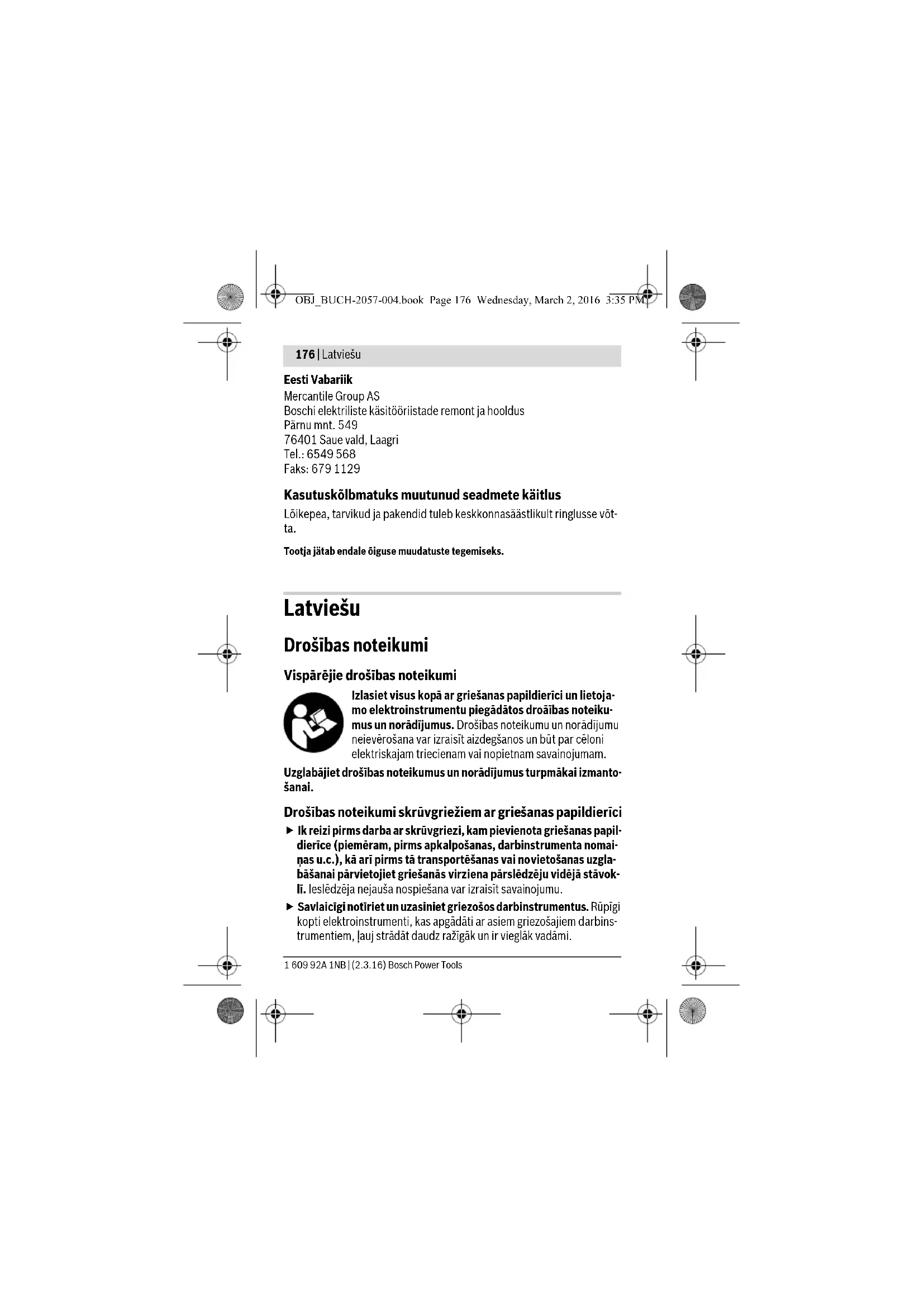 OBJ_BUCH-2057-004.book Page 174 Wednesday, March 2, 2016 3:35 PMEesti | 175 Bosch Power Tools 1 609 92A 1NB | (2.3.16) Tööjuhised Ärge rakendage seadmele nii suurt koormust, et see seiskub. Seadme lõikevõimsus sõltub lõigatavast materjalist ja aku laetuse ast- mest. Liigne ettenihe vähendab olenevalt aku laetuse astmest võimsust tundu- valt. Hoidke lõiketera alati vabana ja puhtana materjalijääkidest. Juhttald 2 ei tohi lõikamisel vajuda kaldu ja peab olema paralleelne lõike- pinnaga. Asjatundmatu kasutamise korral läheb lõiketera nüriks. Õhukesed materjalid võivad jääda lõikamisel seadmesse kinni. Seetõttu ärge avaldage selliste materjalide lõikamisel liiga suurt survet. Veenduge õiges pinges ja lõigake aeglaselt. Optimaalsete lõiketulemuste saavutamiseks tehke kõigepealt proovilõi- ked. Hooldus ja teenindus Hooldus ja puhastus Tõhusa ja ohutu töö tagamiseks hoidke lõikepea puhas. Puhastamiseks võtke lõikepea kruvikeeraja küljest lahti. Lüliti (sis- se/välja) soovimatul käsitsemisel esineb vigastuste oht. Lõiketera puhastamisel olge ettevaatlik. Lõiketeral on teravad ser- vad, mis võivad Teid vigastada. Lõikamisel võib kettakaitse alla koguneda materjalijääke. – Puhastage kaitsekatet 3 regulaarselt pintsliga. Klienditeenindus ja müügijärgne nõustamine Päringute esitamisel ja varuosade tellimisel näidake kindlasti ära lõikepea andmesildil olev 10-kohaline tootenumber. Klienditeeninduses vastatakse toote paranduse ja hoolduse ning varuosa- de kohta esitatud küsimustele. Joonised ja teabe varuosade kohta leiate ka veebisaidilt: www.bosch-pt.com Boschi nõustajad osutavad Teile toodete ja tarvikute küsimustes meeleldi abi. OBJ_BUCH-2057-004.book Page 175 Wednesday, March 2, 2016 3:35 PM176 | Latviešu 1 609 92A 1NB | (2.3.16) Bosch Power Tools Eesti Vabariik Mercantile Group AS Boschi elektriliste käsitööriistade remont ja hooldus Pärnu mnt. 549 76401 Saue vald, Laagri Tel.: 6549 568 Faks: 679 1129 Kasutuskõlbmatuks muutunud seadmete käitlus Lõikepea, tarvikud ja pakendid tuleb keskkonnasäästlikult ringlusse võt- ta. Tootja jätab endale õiguse muudatuste tegemiseks. Latviešu Drošības noteikumi Vispārējie drošības noteikumi Izlasiet visus kopā ar griešanas papildierīci un lietoja- mo elektroinstrumentu piegādātos droāības noteiku- mus un norādījumus. Drošības noteikumu un norādījumu neievērošana var izraisīt aizdegšanos un būt par cēloni elektriskajam triecienam vai nopietnam savainojumam. Uzglabājiet drošības noteikumus un norādījumus turpmākai izmanto- šanai. Drošības noteikumi skrūvgriežiem ar griešanas papildierīci Ik reizi pirms darba ar skrūvgriezi, kam pievienota griešanas papil- dierīce (piemēram, pirms apkalpošanas, darbinstrumenta nomai- ņas u.c.), kā arī pirms tā transportēšanas vai novietošanas uzgla- bāšanai pārvietojiet griešanās virziena pārslēdzēju vidējā stāvok- lī. Ieslēdzēja nejauša nospiešana var izraisīt savainojumu. Savlaicīgi notīriet un uzasiniet griezošos darbinstrumentus. Rūpīgi kopti elektroinstrumenti, kas apgādāti ar asiem griezošajiem darbins- trumentiem, ļauj strādāt daudz ražīgāk un ir vieglāk vadāmi. OBJ_BUCH-2057-004.book Page 176 Wednesday, March 2, 2016 3:35 PMLatviešu | 177 Bosch Power Tools 1 609 92A 1NB | (2.3.16) Pie griešanas papildierīces piederošais aizsargpārsegs nedrīkst būt bojāts. Aizsargpārsegam jāpasargā lietotājs no nejaušas saskarša- nās ar griezējasmeni. Neapstrādājiet materiālus, kas satur azbestu. Azbestam piemīt kan- cerogēnas īpašības. Gtiešanas laikā sekojiet, lai griezējasmens nesaskartos ar sprie- gumnesošiem vadiem. Tas var radīt elektriskā trieciena briesmas. Griešanas laikā nenovietojiet rokas griezējasmens priekšā. Tas var radīt savainojumus. Nepieļaujiet elektroinstrumenta patvaļīgu ieslēgšanos. Turot pirk- stu uz elektroinstrumenta ieslēdzēja tā pārnešanas laikā, viegli var no- tikt nelaimes gadījums. Uzraugiet bērnus. Tas ļaus nodrošināt, lai b ērni nerotaļātos ar grieša- nas papildierīci vai ar skrūvgriezi, kuram ir pievienota griešanas papil- dierīce. Šis skrūvgriezis ar tam pievienotu griešanas papildierīci nav pare- dzēts, lai to lietotu bērni un personas ar ierobežotām fiziskajām, sensorajām vai garīgajām spējām vai ar nepietiekošu pieredzi un zināšanām. Šo skrūvgriezi ar tam pievienotu griešanas papildierīci var lietot bērni no 8 gadu vecuma un personas ar ierobežotām psihiskajām, sensorajām vai garīgajām spējām un nepietiekošu pieredzi vai zi- nāšanām pie nosacījuma, ka darbs notiek par viņu drošību atbildī- gas personas uzraudzībā vai arī šī persona sniedz norādījumus par drošu apiešanos ar skrūvgriezi un tam pievienoto griešanas papil- dierīci un inform ē par briesmām, kas saistītas ar tā lietošanu. Pre- tējā gadījumā pastāv savainošanās briesmas elektroinstrumenta nepa- reizas lietošanas dēļ. Izstrādājuma un tā darbības apraksts Pielietojums Griešanas papildierīce, to lietojot kopā ar akumulatora skrūvgriezi IXO, ir paredzēta līdz 6 mm biezu lokanu un mīkstu materiālu, piemēram, paklā- ju, PVC, kartona, dažādu ādas šķirņu, audumu un citu līdzīgu materiālu griešanai. OBJ_BUCH-2057-004.book Page 177 Wednesday, March 2, 2016 3:35 PM178 | Latviešu 1 609 92A 1NB | (2.3.16) Bosch Power Tools Griešanas papildierīce ir paredzēta tikai personīgai lietošanai mājsaim- niecībā, un to drīkst izmantot vienīgi kopā ar šādiem elektroinstrumen- tiem: – Bosch IXO (3 603 J81 0.., 3 603 J59 3.., 3 603 JA8 0..) Attēlotās sastāvdaļas Attēloto sastāvdaļu numerācija atbilst grafiskajās lappusēs sniegtajiem attēliem. 1 Griešanas papildierīce 2 Vadotnes sliede 3 Aizsargpārsegs 4 Fiksējošais gredzens 5 Griešanās virziena pārslēdzējs 6 Ieslēdzējs 7 Skrūve asmens stiprināšanai 8 Griezējasmens 9 Gumijas 