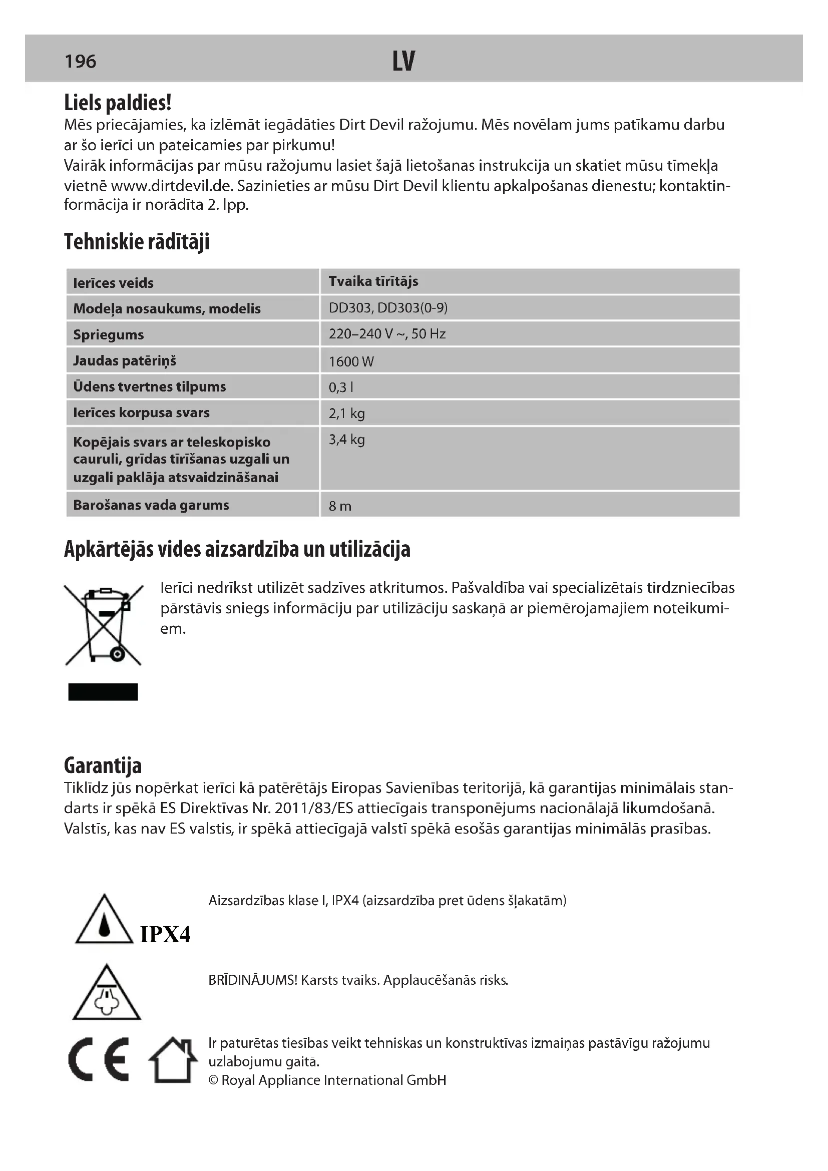195IPX4 Apkārtējās vides aizsardzība un utilizācija Ierīci nedrīkst utilizēt sadzīves atkritumos. Pašvaldība vai specializētais tirdzniecības pārstāvis sniegs informāciju par utilizāciju saskaņā ar piemērojamajiem noteikumi- em. Garantija Tiklīdz jūs nopērkat ierīci kā patērētājs Eiropas Savienības teritorijā, kā garantijas minimālais stan- darts ir spēkā ES Direktīvas Nr.2011/83/ES attiecīgais transponējums nacionālajā likumdošanā. Valstīs, kas nav ES valstis, ir spēkā attiecīgajā valstī spēkā esošās garantijas minimālās prasības. Ir paturētas tiesības veikt tehniskas un konstruktīvas izmaiņas pastāvīgu ražojumu uzlabojumu gaitā.© Royal Appliance International GmbH Liels paldies! Mēs priecājamies, ka izlēmāt iegādāties Dirt Devil ražojumu. Mēs novēlam jums patīkamu darbu ar šo ierīci un pateicamies par pirkumu! Vairāk informācijas par mūsu ražojumu lasiet šajā lietošanas instrukcija un skatiet mūsu tīmekļa vietnē www.dirtdevil.de. Sazinieties ar mūsu Dirt Devil klientu apkalpošanas dienestu; kontaktin- formācija ir norādīta 2.lpp. Tehniskie rādītāji Ierīces veidsTvaika tīrītājsModeļa nosaukums, modelisDD303, DD303(0-9)Spriegums220–240 V ~, 50 HzJaudas patēriņš1600 WŪdens tvertnes tilpums0,3 lIerīces korpusa svars2,1 kgKopējais svars ar teleskopisko cauruli, grīdas tīrīšanas uzgali un uzgali paklāja atsvaidzināšanai3,4 kgBarošanas vada garums 8 m BRĪDINĀJUMS! Karsts tvaiks. Applaucēšanās risks. Aizsardzības klaseI, IPX4 (aizsardzība pret ūdens šļakatām)