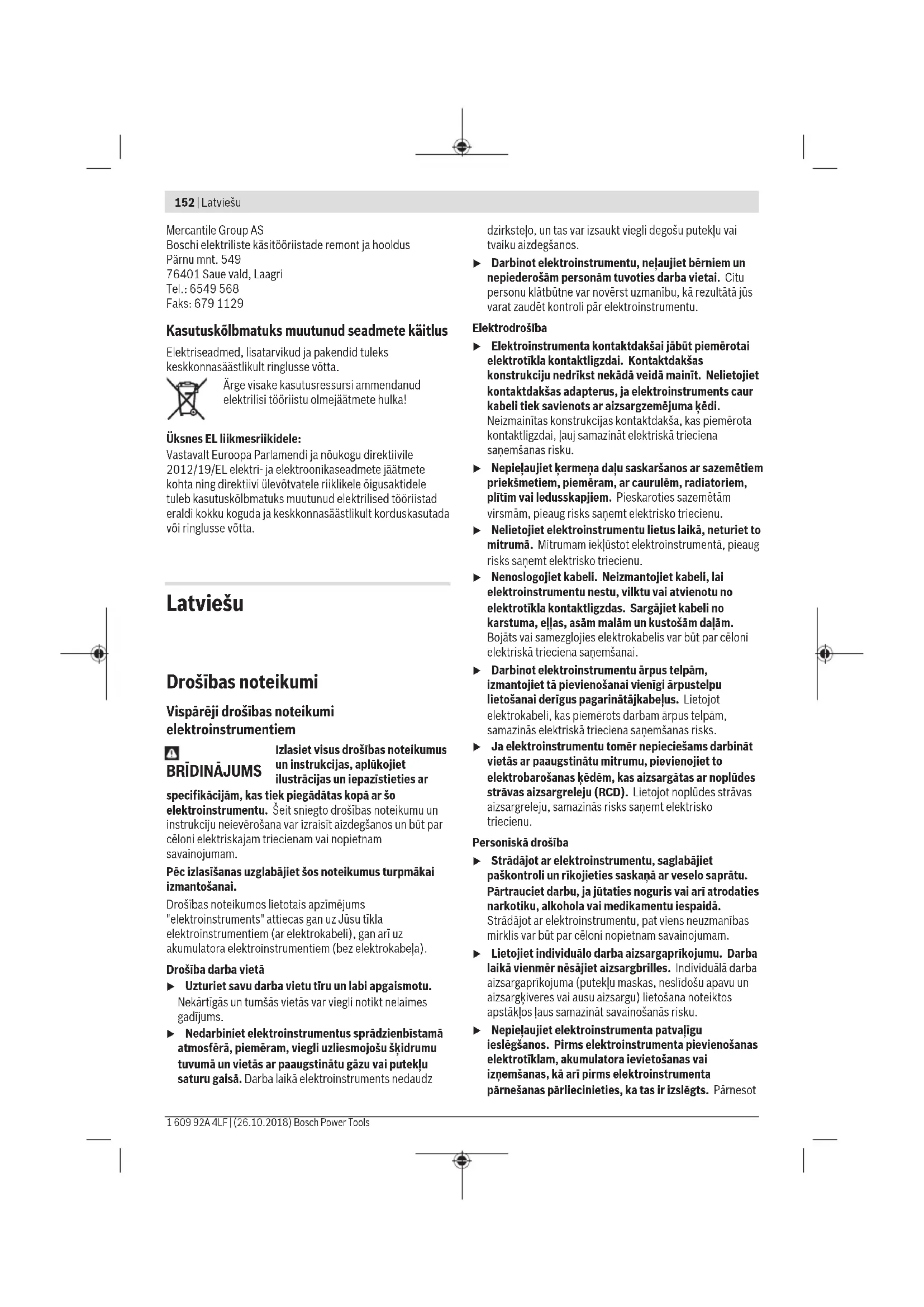 Izlasiet visus drošības noteikumus un instrukcijas, aplūkojiet ilustrācijas un iepazīstieties ar specifikācijām, kas tiek piegādātas kopā ar šo elektroinstrumentu. Šeit sniegto drošības noteikumu un instrukciju neievērošana var izraisīt aizdegšanos un būt par cēloni elektriskajam triecienam vai nopietnam savainojumam. Pēc izlasīšanas uzglabājiet šos noteikumus turpmākai izmantošanai. Drošības noteikumos lietotais apzīmējums "elektroinstruments" attiecas gan uz Jūsu tīkla elektroinstrumentiem (ar elektrokabeli), gan arī uz akumulatora elektroinstrumentiem (bez elektrokabeļa). Drošība darba vietā u Uzturiet savu darba vietu tīru un labi apgaismotu. Nekārtīgās un tumšās vietās var viegli notikt nelaimes gadījums. u Nedarbiniet elektroinstrumentus sprādzienbīstamā atmosfērā, piemēram, viegli uzliesmojošu šķidrumu tuvumā un vietās ar paaugstinātu gāzu vai putekļu saturu gaisā. Darba laikā elektroinstruments nedaudz dzirksteļo, un tas var izsaukt viegli degošu putekļu vai tvaiku aizdegšanos. u Darbinot elektroinstrumentu, neļaujiet bērniem un nepiederošām personām tuvoties darba vietai. Citu personu klātbūtne var novērst uzmanību, kā rezultātā jūs varat zaudēt kontroli pār elektroinstrumentu. Elektrodrošība u Elektroinstrumenta kontaktdakšai jābūt piemērotai elektrotīkla kontaktligzdai. Kontaktdakšas konstrukciju nedrīkst nekādā veidā mainīt. Nelietojiet kontaktdakšas adapterus, ja elektroinstruments caur kabeli tiek savienots ar aizsargzemējuma ķēdi. Neizmainītas konstrukcijas kontaktdakša, kas piemērota kontaktligzdai, ļauj samazināt elektriskā trieciena saņemšanas risku. u Nepieļaujiet ķermeņa daļu saskaršanos ar sazemētiem priekšmetiem, piemēram, ar caurulēm, radiatoriem, plītīm vai ledusskapjiem. Pieskaroties sazemētām virsmām, pieaug risks saņemt elektrisko triecienu. u Nelietojiet elektroinstrumentu lietus laikā, neturiet to mitrumā. Mitrumam iekļūstot elektroinstrumentā, pieaug risks saņemt elektrisko triecienu. u Nenoslogojiet kabeli. Neizmantojiet kabeli, lai elektroinstrumentu nestu, vilktu vai atvienotu no elektrotīkla kontaktligzdas. Sargājiet kabeli no karstuma, eļļas, asām malām un kustošām daļām. Bojāts vai samezglojies elektrokabelis var būt par cēloni elektriskā trieciena saņemšanai. u Darbinot elektroinstrumentu ārpus telpām, izmantojiet tā pievienošanai vienīgi ārpustelpu lietošanai derīgus pagarinātājkabeļus. Lietojot elektrokabeli, kas piemērots darbam ārpus telpām, samazinās elektriskā trieciena saņemšanas risks. u Ja elektroinstrumentu tomēr nepieciešams darbināt vietās ar paaugstinātu mitrumu, pievienojiet to elektrobarošanas ķēdēm, kas aizsargātas ar noplūdes strāvas aizsargreleju (RCD). Lietojot noplūdes strāvas aizsargreleju, samazinās risks saņemt elektrisko triecienu. Personiskā drošība u Strādājot ar elektroinstrumentu, saglabājiet paškontroli un rīkojieties saskaņā ar veselo saprātu. Pārtrauciet darbu, ja jūtaties noguris vai arī atrodaties narkotiku, alkohola vai medikamentu iespaidā. Strādājot ar elektroinstrumentu, pat viens neuzmanības mirklis var būt par cēloni nopietnam savainojumam. u Lietojiet individuālo darba aizsargaprīkojumu. Darba laikā vienmēr nēsājiet aizsargbrilles. Individuālā darba aizsargaprīkojuma (putekļu maskas, neslīdošu apavu un aizsargķiveres vai ausu aizsargu) lietošana noteiktos apstākļos ļaus samazināt savainošanās risku. u Nepieļaujiet elektroinstrumenta patvaļīgu ieslēgšanos. Pirms elektroinstrumenta pievienošanas elektrotīklam, akumulatora ievietošanas vai izņemšanas, kā arī pirms elektroinstrumenta pārnešanas pārliecinieties, ka tas ir izslēgts. Pārnesotelektroinstrumentu, ja pirksts atrodas uz ieslēdzēja, kā arī pievienojot to elektrobarošanas avotam laikā, kad elektroinstruments ir ieslēgts, var viegli notikt nelaimes gadījums. u Pirms elektroinstrumenta ieslēgšanas izņemiet no tā regulējošos rīkus vai atslēgas. Regulējošais rīks vai atslēga, kas ieslēgšanas brīdī atrodas elektroinstrumenta kustīgajās daļās, var radīt savainojumu. u Nesniedzieties pārāk tālu. Jebkurā situācijā saglabājiet līdzsvaru un stingru stāju. Tas atvieglos elektroinstrumenta vadīšanu neparedzētās situācijās. u Nēsājiet darbam piemērotu apģērbu. Darba laikā nenēsājiet brīvi plandošas drēbes un rotaslietas. Netuviniet garus matus un drēbes kustošām daļām. Vaļīgas drēbes, rotaslietas un gari mati var ieķerties kustošajās daļās. u Ja elektroinstrumenta konstrukcija ļauj tam pievienot putekļu uzsūkšanas vai savākšanas, nodrošiniet, lai tā būtu pievienota un tiktu pareizi lietota. Pielietojot putekļu savākšanu, samazinās to kaitīgā ietekme uz veselību. u Nepaļaujieties uz iemaņām, kas iegūtas, bieži lietojot instrumentus, neieslīgstiet pašapmierinātībā un neignorējiet instrumenta drošas lietošanas principus. Neuzmanīgas rīcības dēļ dažās sekundes daļās var gūt nopietnu savainojumu. Saudzīga apiešanās un darbs ar elektroinstrumentiem u Nepārslogojiet elektroinstrumentu. Ikvienam darbam izvēlieties piemērotu elektroinstrumentu. Elektroinstruments darbojas labāk un drošāk pie nominālās slodzes. u Nelietojiet elektroinstrumentu, ja to ar ieslēdzēja palīdzību nevar ieslēgt un izslēgt. Elektroinstruments, ko nevar ieslēgt un izslēgt, ir bīstams lietošanai un to nepieciešams remontēt. u Pirms elektroinstrumenta regulēšanas, piederumu nomaiņas vai novietošanas uzglabāšanai atvienojiet tā elektrokabeļa kontaktdakšu no barojošā elektrotīkla vai izņemiet no tā akumulatoru, ja tas ir izņemams. Šādi iespējams novērst elektroinstrumenta nejaušu ieslēgšanos. u Ja elektroinstruments netiek lietots, uzglabājiet to piemērotā vietā, kur elektroinstruments nav sasniedzams bērniem un personām, kur