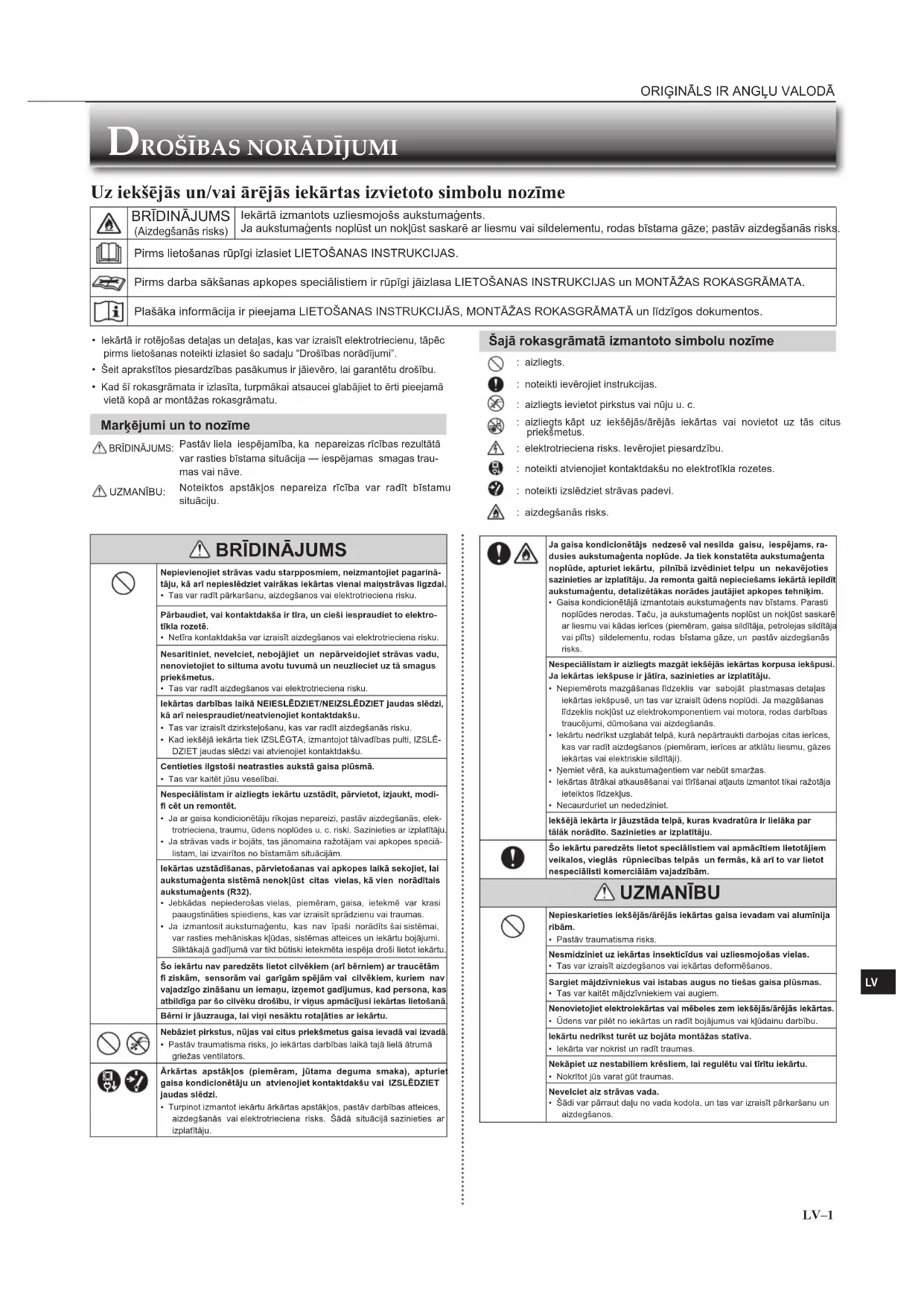 Nepievienojiet strāvas vadu starpposmiem, neizmantojiet pagarinā-tāju, kā arī nepieslēdziet vairākas iekārtas vienai maiņstrāvas ligzdai.• Tas var radīt pārkaršanu, aizdegšanos vai elektrotrieciena risku.Pārbaudiet, vai kontaktdakša ir tīra, un cieši iespraudiet to elektro-tīkla rozetē.• Netīra kontaktdakša var izraisīt aizdegšanos vai elektrotrieciena risku.Nesaritiniet, nevelciet, nebojājiet un nepārveidojiet strāvas vadu, nenovietojiet to siltuma avotu tuvumā un neuzlieciet uz tā smagus priekšmetus.• Tas var radīt aizdegšanos vai elektrotrieciena risku.Iekārtas darbības laikā NEIESLĒDZIET/NEIZSLĒDZIET jaudas slēdzi, kā arī neiespraudiet/neatvienojiet kontaktdakšu.• Tas var izraisīt dzirksteļošanu, kas var radīt aizdegšanās risku.• Kad iekšējā iekārta tiek IZSLĒGTA, izmantojot tālvadības pulti, IZSLĒ-DZIET jaudas slēdzi vai atvienojiet kontaktdakšu. Centieties ilgstoši neatrasties aukstā gaisa plūsmā.• Tas var kaitēt jūsu veselībai.Nespeciālistam ir aizliegts iekārtu uzstādīt, pārvietot, izjaukt, modi-fi cēt un remontēt.• Ja ar gaisa kondicionētāju rīkojas nepareizi, pastāv aizdegšanās, elek-trotrieciena, traumu, ūdens noplūdes u. c. riski. Sazinieties ar izplatītāju.• Ja strāvas vads ir bojāts, tas jānomaina ražotājam vai apkopes speciā-listam, lai izvairītos no bīstamām situācijām.Iekārtas uzstādīšanas, pārvietošanas vai apkopes laikā sekojiet, lai aukstumaģenta sistēmā nenokļūst citas vielas, kā vien norādītais aukstumaģents (R32).• Jebkādas nepiederošas vielas, piemēram, gaisa, ietekmē var krasi paaugstināties spiediens, kas var izraisīt sprādzienu vai traumas.• Ja izmantosit aukstumaģentu, kas nav īpaši norādīts šai sistēmai, var rasties mehāniskas kļūdas, sistēmas atteices un iekārtu bojājumi. Sliktākajā gadījumā var tikt būtiski ietekmēta iespēja droši lietot iekārtu.Šo iekārtu nav paredzēts lietot cilvēkiem (arī bērniem) ar traucētām fi ziskām, sensorām vai garīgām spējām vai cilvēkiem, kuriem nav vajadzīgo zināšanu un iemaņu, izņemot gadījumus, kad persona, kas atbildīga par šo cilvēku drošību, ir viņus apmācījusi iekārtas lietošanā.Bērni ir jāuzrauga, lai viņi nesāktu rotaļāties ar iekārtu. Nebāziet pirkstus, nūjas vai citus priekšmetus gaisa ievadā vai izvadā.• Pastāv traumatisma risks, jo iekārtas darbības laikā tajā lielā ātrumā griežas ventilators. Ārkārtas apstākļos (piemēram, jūtama deguma smaka), apturiet gaisa kondicionētāju un atvienojiet kontaktdakšu vai IZSLĒDZIET jaudas slēdzi.• Turpinot izmantot iekārtu ārkārtas apstākļos, pastāv darbības atteices, aizdegšanās vai elektrotrieciena risks. Šādā situācijā sazinieties ar izplatītāju. Ja gaisa kondicionētājs nedzesē vai nesilda gaisu, iespējams, ra-dusies aukstumaģenta noplūde. Ja tiek konstatēta aukstumaģenta noplūde, apturiet iekārtu, pilnībā izvēdiniet telpu un nekavējoties sazinieties ar izplatītāju. Ja remonta gaitā nepieciešams iekārtā iepildīt aukstumaģentu, detalizētākas norādes jautājiet apkopes tehniķim.• Gaisa kondicionētājā izmantotais aukstumaģents nav bīstams. Parasti noplūdes nerodas. Taču, ja aukstumaģents noplūst un nokļūst saskarē ar liesmu vai kādas ierīces (piemēram, gaisa sildītāja, petrolejas sildītāja vai plīts) sildelementu, rodas bīstama gāze, un pastāv aizdegšanās risks.Nespeciālistam ir aizliegts mazgāt iekšējās iekārtas korpusa iekšpusi. Ja iekārtas iekšpuse ir jātīra, sazinieties ar izplatītāju.• Nepiemērots mazgāšanas līdzeklis var sabojāt plastmasas detaļas iekārtas iekšpusē, un tas var izraisīt ūdens noplūdi. Ja mazgāšanas līdzeklis nokļūst uz elektrokomponentiem vai motora, rodas darbības traucējumi, dūmošana vai aizdegšanās.• Iekārtu nedrīkst uzglabāt telpā, kurā nepārtraukti darbojas citas ierīces, kas var radīt aizdegšanos (piemēram, ierīces ar atklātu liesmu, gāzes iekārtas vai elektriskie sildītāji).• Ņemiet vērā, ka aukstumaģentiem var nebūt smaržas.• Iekārtas ātrākai atkausēšanai vai tīrīšanai atļauts izmantot tikai ražotāja ieteiktos līdzekļus.• Necaurduriet un nededziniet.Iekšējā iekārta ir jāuzstāda telpā, kuras kvadratūra ir lielāka par tālāk norādīto. Sazinieties ar izplatītāju.Šo iekārtu paredzēts lietot speciālistiem vai apmācītiem lietotājiem veikalos, vieglās rūpniecības telpās un fermās, kā arī to var lietot nespeciālisti komerciālām vajadzībām. UZMANĪBU Nepieskarieties iekšējās/ārējās iekārtas gaisa ievadam vai alumīnija ribām.• Pastāv traumatisma risks.Nesmidziniet uz iekārtas insekticīdus vai uzliesmojošas vielas.• Tas var izraisīt aizdegšanos vai iekārtas deformēšanos.Sargiet mājdzīvniekus vai istabas augus no tiešas gaisa plūsmas.• Tas var kaitēt mājdzīvniekiem vai augiem.Nenovietojiet elektroiekārtas vai mēbeles zem iekšējās/ārējās iekārtas.• Ūdens var pilēt no iekārtas un radīt bojājumus vai kļūdainu darbību.Iekārtu nedrīkst turēt uz bojāta montāžas statīva.• Iekārta var nokrist un radīt traumas.Nekāpiet uz nestabiliem krēsliem, lai regulētu vai tīrītu iekārtu.• Nokrītot jūs varat gūt traumas.Nevelciet aiz strāvas vada.• Šādi var pārraut daļu no vada kodola, un tas var izraisīt pārkaršanu un aizdegšanos. JG79Y423L01_21Lv.indd 1 8/23/2018 5:06:39 PMLV–2 Lai iekārtu varētu izmantot droši un pareizi, pirms lietošanas izlasiet šīs lietošanas instrukcijas.