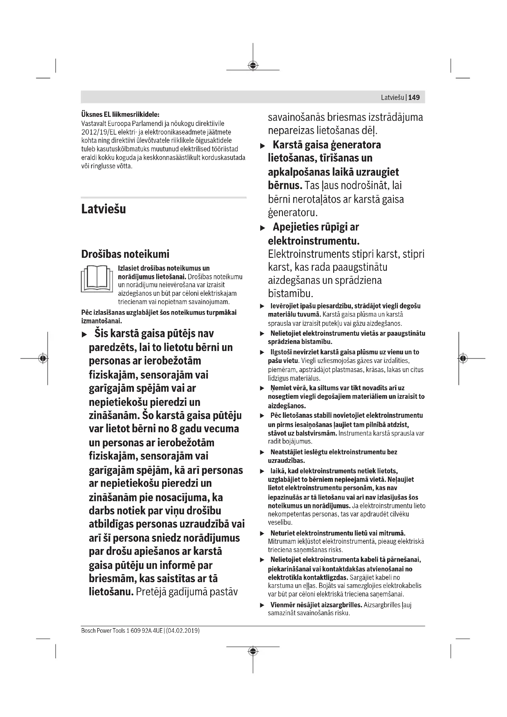 50 150 – Apstrādājamā priekšmeta dzesēšana – Krāsas žāvēšana 1 250 350 Plastmasas cauruļu formēšana 2 350 400 Plastmasas metināšana 3 450 500 Lakas noņemšana 4 550 400 Lodēšana ar mīkstlodi A) netiek parādīts uz displeja Lai izsauktu kādu no kombinācijām, vairākkārt nospiediet atmiņas taustiņu(11), līdz indikatorā(5) parādās vēlamais atmiņas vietas numurs. Paša izvēlēto vērtību kombinācijas saglabāšana atmiņā: – Vairākkārt nospiežot atmiņas taustiņu(11), izvēlieties vajadzīgo atmiņas vietu. – Iestatiet vēlamās temperatūras un gaisa plūsmas vērtības. Atmiņas vietas indikatorā(5) parādītais numurs mirgo, norādot, ka saglabātā vērtību kombinācija tiks izmainīta. – Nospiediet atmiņas taustiņu(11) un turiet to nospiestu. Atmiņas vietas indikators(5) mirgo aptuveni 2sekundes. Līdzko tas iedegas pastāvīgi, jaunā vērtību kombinācija ir saglabāta atmiņā. Norādījumi darbam u Pirms elektroinstrumenta apkopes vai apkalpošanas izvelciet tā elektrokabeļa kontaktdakšu no barojošā elektrotīkla kontaktligzdas. 1 609 92A 4UE | (04.02.2019) Bosch Power ToolsLatviešu | 153 Norāde: netuviniet sprauslu(1) apstrādājamajam priekšmetam. Gaisa plūsma, kas atstarojas no apstrādājamā priekšmeta virsmas, var izraisīt elektroinstrumenta pārkaršanu. Termoizolējošās aptveres noņemšana Veicot darbu īpaši šaurās vietās, var noņemt termoizolējošo aptveri(2), to pagriežot. u Ievērojiet piesardzību, nepieskarieties karstajai sprauslai! Strādājot bez termoizolējošās aptveres, pieaug iespēja iegūt apdegumus. Pirms termoizolējošās aptveres(2) noņemšanas vai nostiprināšanas izslēdziet elektroinstrumentu un nogaidiet, līdz tas ir atdzisis. Lai panāktu ātrāku elektroinstrumenta atdzišanu, to var neilgu laiku darbināt pie zemākā regulējamās temperatūras iestatījuma. Elektroinstrumenta novietošana Novietojiet elektroinstrumentu uz novietošanas balstiem(3), lai ļautu tam atdzist vai arī, lai izbrīvētu darbam abas rokas. u Strādājot ar novietotu elektroinstrumentu, ievērojiet īpašu piesardzību! Šādā stāvoklī viegli var iegūt apdegumus, pieskaroties elektroinstrumenta karstajai sprauslai vai rokām nejauši nonākot karstajā gaisa plūsmā. Novietojiet elektroinstrumentu uz līdzenas, stabilas virsmas. Nodrošiniet novietoto elektroinstrumentu pret apgāšanos. Nodrošiniet, lai elektrokabelis atrastos ārpus darba zonas tā, lai elektroinstrumentu nevarētu apgāzt vai noraut. Ja elektroinstruments ilgāku laiku netiek lietots, izslēdziet to un izvelciet tā kontaktdakšu no elektrotīkla kontaktligzdas. Darba piemēri (attēliA–G) Darba operāciju piemēriem atbilstošie attēli ir sniegti grafiskajās lappusēs. Attālumam starp sprauslu un apstrādājamo priekšmetu jāatbilst apstrādājamā materiāla (metāla, plastmasas u.c.) īpašībām un paredzētajam apstrādes veidam. Optimālo temperatūru attiecīgajam pielietojumam var noteikt praktisku mēģinājumu ceļā. Vienmēr vispirms veiciet apstrādes mēģinājumu attiecībā uz gaisa plūsmu un temperatūru. Uzsāciet darbu, izvēloties lielāku attālumu un zemāko jaudas pakāpi. Piemeklējiet attālumu un jaudas pakāpi pēc vajadzības. Ja neesat pārliecināts par to, kāds materiāls tiek apstrādāts vai kāda ir karstā gaisa plūsmas iedarbība uz materiālu, pārbaudiet šo iedarbību kādā slēptā materiāla vietā. Visas darbības, kas parādītas darba piemēros, izņemot piemēru „Krāsas noņemšana no logu rāmjiem“, var veikt arī bez piederumiem. Taču šeit ieteikto piederumu izmantošana vienkāršo darbu un ļauj ievērojami paaugstināt apstrādes kvalitāti. u Ievērojiet piesardzību, veicot sprauslu nomaiņu! Nepieskarieties karstajai sprauslai. Nogaidiet, līdz elektroinstruments ir atdzisis, un sprauslu nomaiņas laikā nēsājiet aizsargcimdus. Pieskaršanās karstajai sprauslai var izraisīt apdegumus. Lai panāktu ātrāku elektroinstrumenta atdzišanu, to var neilgu laiku darbināt pie zemākā regulējamās temperatūras iestatījuma. Krāsas noņemšana un līmvielu mīkstināšana (attēlsA) Nostipriniet uz instrumenta plakano sprauslu(14) (piederums). Mīkstiniet krāsu, īslaicīgi iedarbojoties uz to ar karstā gaisa plūsmu, un tad atdaliet krāsu no virsmas ar tīru špakteļlāpstiņu. Ilgstoša karstā gaisa iedarbība izraisa krāsas piedegšanu un apgrūtina tās noņemšanu. Daudzas līmes karstuma iedarbības rezultātā kļūst mīkstas. Pēc līmes uzkarsēšanas kļūst iespējams atdalīt salīmētās virsmas vai arī noņemt lieko līmes daudzumu. Krāsas noņemšana no logu rāmjiem (attēlsB) u Noteikti lietojiet sprauslu stikla aizsardzībai (15) (papildpiederums). Logu stikli karstumā var viegli saplīst. No profilētām rāmju virsmām krāsu var noņemt, to atdalot no virsmas ar piemērotas špakteļlāpstiņas palīdzību un tad notīrot krāsas paliekas ar mīkstu stiepļu suku. Ūdensvada cauruļu atkausēšana (attēlsC) u Pirms caurules karsēšanas pārliecinieties, ka tā tiešām ir ūdensvada caurule. Ūdensvada caurules nereti ir grūti atšķirt no gāzes caurulēm. Gāzes caurules nekādā gadījumā nedrīkst karsēt. Nostipriniet uz instrumenta leņķa sprauslu(16) (papildpiederums). Karsējiet caurules aizsalušās vietas, pārvietojot sprauslu virzienā no noteces vietas pieteci. Lai novērstu iespējamos bojājumus, ievērojiet īpašu piesardzību, karsējot plastmasas caurules un savienojumus starp cauruļu posmiem. Plastmasas cauruļu formēšana (attēlsD) Nostipriniet uz instrumenta atstarojošo sprauslu(17) (papildpiederums). Lai novērstu plastmasas caurules salūšanu, piepildiet to ar smiltīm un noslēdziet abus caurules galus. Uzmanīgi uzkarsējiet cauruli, vienmērīgi pārvietojot gaisa plūsmu uz priekšu un atpakaļ uz abām pusēm. Plastmasas metināšana (attēlsE) Nostipriniet uz instrumenta samazi