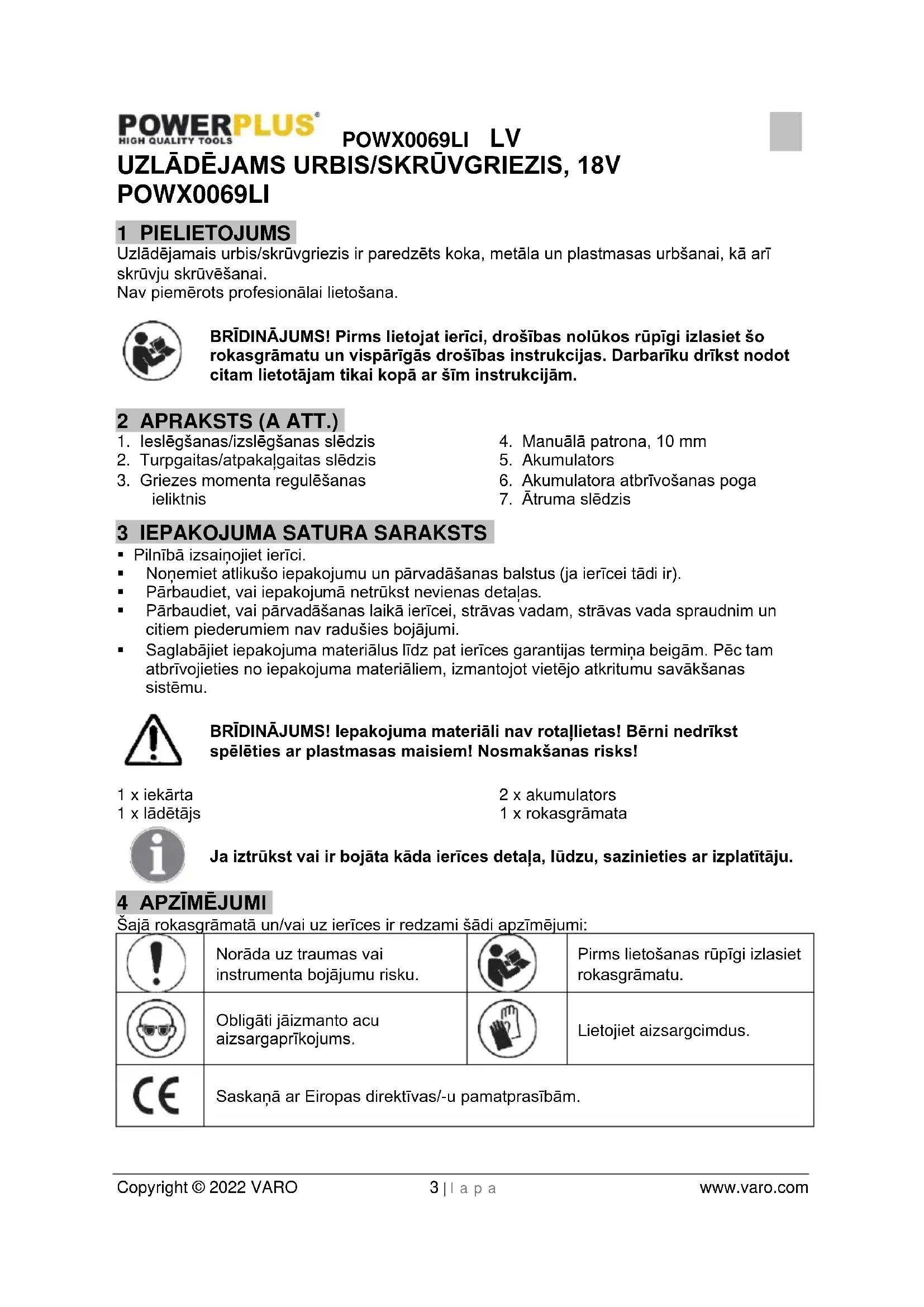 Copyright © 2022 VARO 2 | l a p a www.varo.com 16 AKUMULATORS .............................................................................. 9 17 ATBILSTĪBAS DEKLARĀCIJA ..................................................... 10POWX0069LI LV Copyright © 2022 VARO 3 | l a p a www.varo.com UZLĀDĒJAMS URBIS/SKRŪVGRIEZIS, 18V POWX0069LI 1 PIELIETOJUMS Uzlādējamais urbis/skrūvgriezis ir paredzēts koka, metāla un plastmasas urbšanai, kā arī skrūvju skrūvēšanai. Nav piemērots profesionālai lietošana. BRĪDINĀJUMS! Pirms lietojat ierīci, drošības nolūkos rūpīgi izlasiet šo rokasgrāmatu un vispārīgās drošības instrukcijas. Darbarīku drīkst nodot citam lietotājam tikai kopā ar šīm instrukcijām. 2 APRAKSTS (A ATT.)