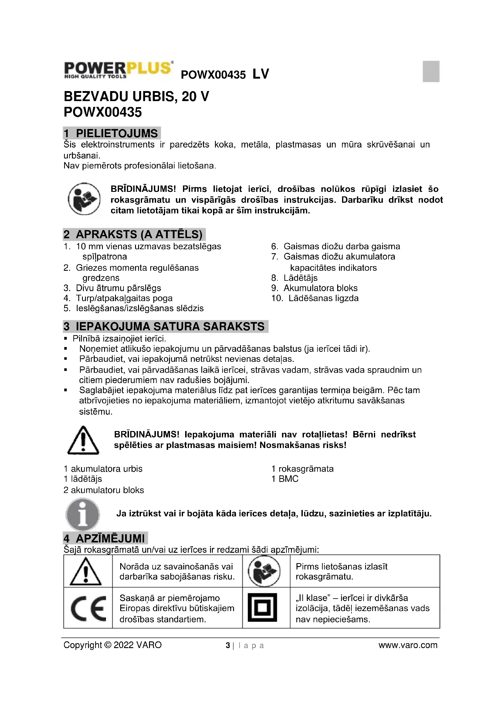 - Neizraisiet īssavienojumus. Ja starp pozitīvo (+) un negatīvo (-) polu tiek izveidots savienojums tieši vai nejaušā kontaktā ar metāla priekšmetiem, akumulatorā notiek īssavienojums, un tiek vadīta strāva, kas izraisa uzkaršanu, kuras rezultātā var tikt bojāts ietvars vai izcelties uguns.POWX00435 LV Copyright © 2022 VARO 6 | l a p a www.varo.com