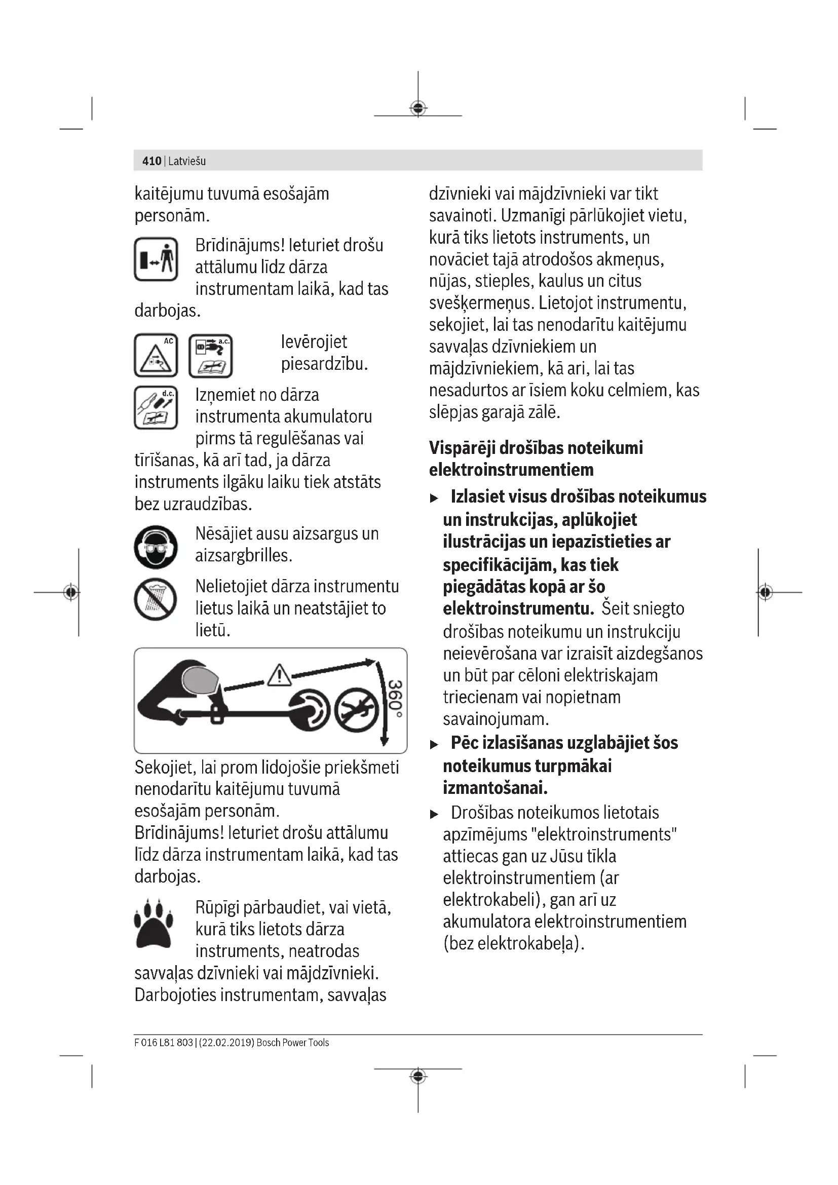 a.c. Ievērojiet piesardzību. d.c. Izņemiet no dārza instrumenta akumulatoru pirms tā regulēšanas vai tīrīšanas, kā arī tad, ja dārza instruments ilgāku laiku tiek atstāts bez uzraudzības. Nēsājiet ausu aizsargus un aizsargbrilles. Nelietojiet dārza instrumentu lietus laikā un neatstājiet to lietū. Sekojiet, lai prom lidojošie priekšmeti nenodarītu kaitējumu tuvumā esošajām personām. Brīdinājums! Ieturiet drošu attālumu līdz dārza instrumentam laikā, kad tas darbojas. Rūpīgi pārbaudiet, vai vietā, kurā tiks lietots dārza instruments, neatrodas savvaļas dzīvnieki vai mājdzīvnieki. Darbojoties instrumentam, savvaļas dzīvnieki vai mājdzīvnieki var tikt savainoti. Uzmanīgi pārlūkojiet vietu, kurā tiks lietots instruments, un novāciet tajā atrodošos akmeņus, nūjas, stieples, kaulus un citus svešķermeņus. Lietojot instrumentu, sekojiet, lai tas nenodarītu kaitējumu savvaļas dzīvniekiem un mājdzīvniekiem, kā ari, lai tas nesadurtos ar īsiem koku celmiem, kas slēpjas garajā zālē. Vispārēji drošības noteikumi elektroinstrumentiem u Izlasiet visus drošības noteikumus un instrukcijas, aplūkojiet ilustrācijas un iepazīstieties ar specifikācijām, kas tiek piegādātas kopā ar šo elektroinstrumentu. Šeit sniegto drošības noteikumu un instrukciju neievērošana var izraisīt aizdegšanos un būt par cēloni elektriskajam triecienam vai nopietnam savainojumam. u Pēc izlasīšanas uzglabājiet šos noteikumus turpmākai izmantošanai. u Drošības noteikumos lietotais apzīmējums "elektroinstruments" attiecas gan uz Jūsu tīkla elektroinstrumentiem (ar elektrokabeli), gan arī uz akumulatora elektroinstrumentiem (bez elektrokabeļa). F 016 L81 803 | (22.02.2019) Bosch Power ToolsLatviešu | 411 Drošība darba vietā u Uzturiet savu darba vietu tīru un labi apgaismotu. Nekārtīgās un tumšās vietās var viegli notikt nelaimes gadījums. u Nedarbiniet elektroinstrumentus sprādzienbīstamā atmosfērā, piemēram, viegli uzliesmojošu šķidrumu tuvumā un vietās ar paaugstinātu gāzu vai putekļu saturu gaisā. Darba laikā elektroinstruments nedaudz dzirksteļo, un tas var izsaukt viegli degošu putekļu vai tvaiku aizdegšanos. u Darbinot elektroinstrumentu, neļaujiet bērniem un nepiederošām personām tuvoties darba vietai. Citu personu klātbūtne var novērst uzmanību, kā rezultātā jūs varat zaudēt kontroli pār elektroinstrumentu. Elektrodrošība u Elektroinstrumenta kontaktdakšai jābūt piemērotai elektrotīkla kontaktligzdai. Kontaktdakšas konstrukciju nedrīkst nekādā veidā mainīt. Nelietojiet kontaktdakšas adapterus, ja elektroinstruments caur kabeli tiek savienots ar aizsargzemējuma ķēdi. Neizmainītas konstrukcijas kontaktdakša, kas piemērota kontaktligzdai, ļauj samazināt elektriskā trieciena saņemšanas risku. u Nepieļaujiet ķermeņa daļu saskaršanos ar sazemētiem priekšmetiem, piemēram, ar caurulēm, radiatoriem, plītīm vai ledusskapjiem. Pieskaroties sazemētām virsmām, pieaug risks saņemt elektrisko triecienu. u Nelietojiet elektroinstrumentu lietus laikā, neturiet to mitrumā. Mitrumam iekļūstot elektroinstrumentā, pieaug risks saņemt elektrisko triecienu. u Nenoslogojiet kabeli. Neizmantojiet kabeli, lai elektroinstrumentu nestu, vilktu vai atvienotu no elektrotīkla kontaktligzdas. Sargājiet kabeli no karstuma, eļļas, asām malām un kustošām daļām. Bojāts vai samezglojies elektrokabelis var būt par cēloni elektriskā trieciena saņemšanai. u Darbinot elektroinstrumentu ārpus telpām, izmantojiet tā pievienošanai vienīgi ārpustelpu lietošanai derīgus pagarinātājkabeļus. Lietojot elektrokabeli, kas piemērots darbam ārpus telpām, samazinās elektriskā trieciena saņemšanas risks. u Ja elektroinstrumentu tomēr nepieciešams darbināt vietās ar paaugstinātu mitrumu, pievienojiet to elektrobarošanas ķēdēm, kas aizsargātas ar noplūdes strāvas aizsargreleju (RCD). Lietojot noplūdes strāvas Bosch Power Tools F 016 L81 803 | (22.02.2019)412 | Latviešu aizsargreleju, samazinās risks saņemt elektrisko triecienu. Personiskā drošība u Strādājot ar elektroinstrumentu, saglabājiet paškontroli un rīkojieties saskaņā ar veselo saprātu. Pārtrauciet darbu, ja jūtaties noguris vai arī atrodaties narkotiku, alkohola vai medikamentu iespaidā. Strādājot ar elektroinstrumentu, pat viens neuzmanības mirklis var būt par cēloni nopietnam savainojumam. u Lietojiet individuālo darba aizsargaprīkojumu. Darba laikā vienmēr nēsājiet aizsargbrilles. Individuālā darba aizsargaprīkojuma (putekļu maskas, neslīdošu apavu un aizsargķiveres vai ausu aizsargu) lietošana noteiktos apstākļos ļaus samazināt savainošanās risku. u Nepieļaujiet elektroinstrumenta patvaļīgu ieslēgšanos. Pirms elektroinstrumenta pievienošanas elektrotīklam, akumulatora ievietošanas vai izņemšanas, kā arī pirms elektroinstrumenta pārnešanas pārliecinieties, ka tas ir izslēgts. Pārnesot elektroinstrumentu, ja pirksts atrodas uz ieslēdzēja, kā arī pievienojot to elektrobarošanas avotam laikā, kad elektroinstruments ir ieslēgts, var viegli notikt nelaimes gadījums. u Pirms elektroinstrumenta ieslēgšanas izņemiet no tā regulējošos rīkus vai atslēgas. Regulējošais rīks vai atslēga, kas ieslēgšanas brīdī atrodas elektroinstrumenta kustīgajās daļās, var radīt savainojumu. u Nesniedzieties pārāk tālu. Jebkurā situācijā saglabājiet līdzsvaru un stingru stāju. Tas atvieglos elektroinstrumenta vadīšanu neparedzētās situācijās. u Nēsājiet darbam piemērotu apģērbu. Darba laikā nenēsājiet brīvi plandošas drēbes un rotaslietas. Netuviniet garus matus un drēbes kustošām daļām. Vaļīgas drēbes, rotaslietas un gari mati var ieķerties kustošajās daļās. u Ja elektroinstrumenta konstrukcija ļauj tam pievienot putekļu uzsūkšanas vai savākšanas, nodrošiniet, lai