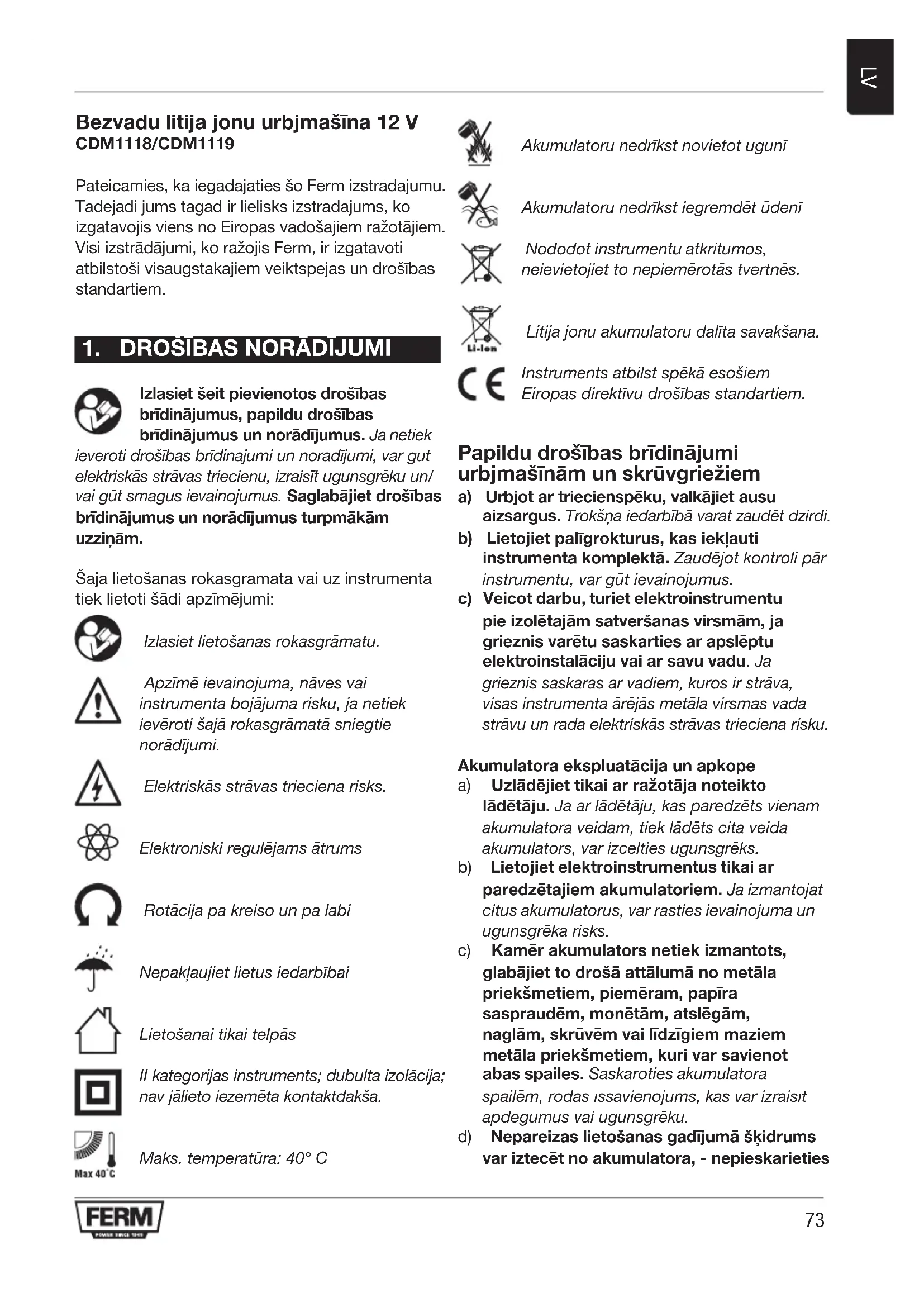 Bezvadu litija jonu urbjmašīna 12 V CDM1118/CDM1119 Pateicamies,kaiegādājātiesšoFermizstrādājumu. Tādējādijumstagadirlielisksizstrādājums,ko izgatavojisviensnoEiropasvadošajiemražotājiem. Visiizstrādājumi,koražojisFerm,irizgatavoti atbilstošivisaugstākajiemveiktspējasundrošības standartiem.