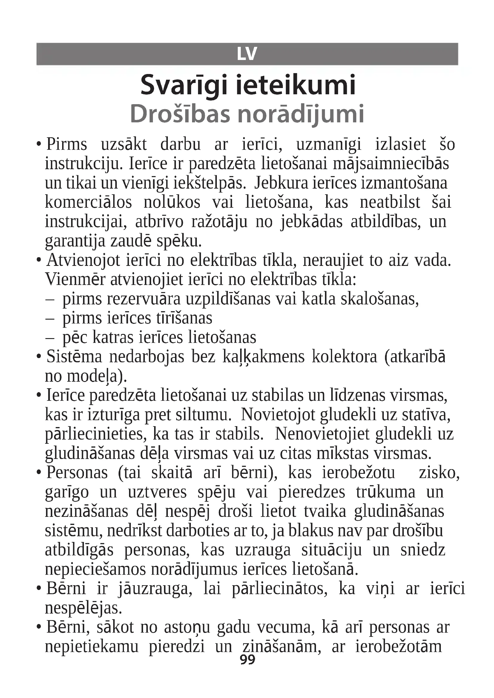 - Pirms uzsākt darbu ar ierīci, uzmanīgi izlasiet šo instrukciju. Ierīce ir paredzēta lietošanai mājsaimniecībās un tikai un vienīgi iekštelpās. Jebkura ierīces izmantošana komerciālos nolūkos vai lietošana, kas neatbilst šai instrukcijai, atbrīvo ražotāju no jebkādas atbildības, un garantija zaudē spēku.