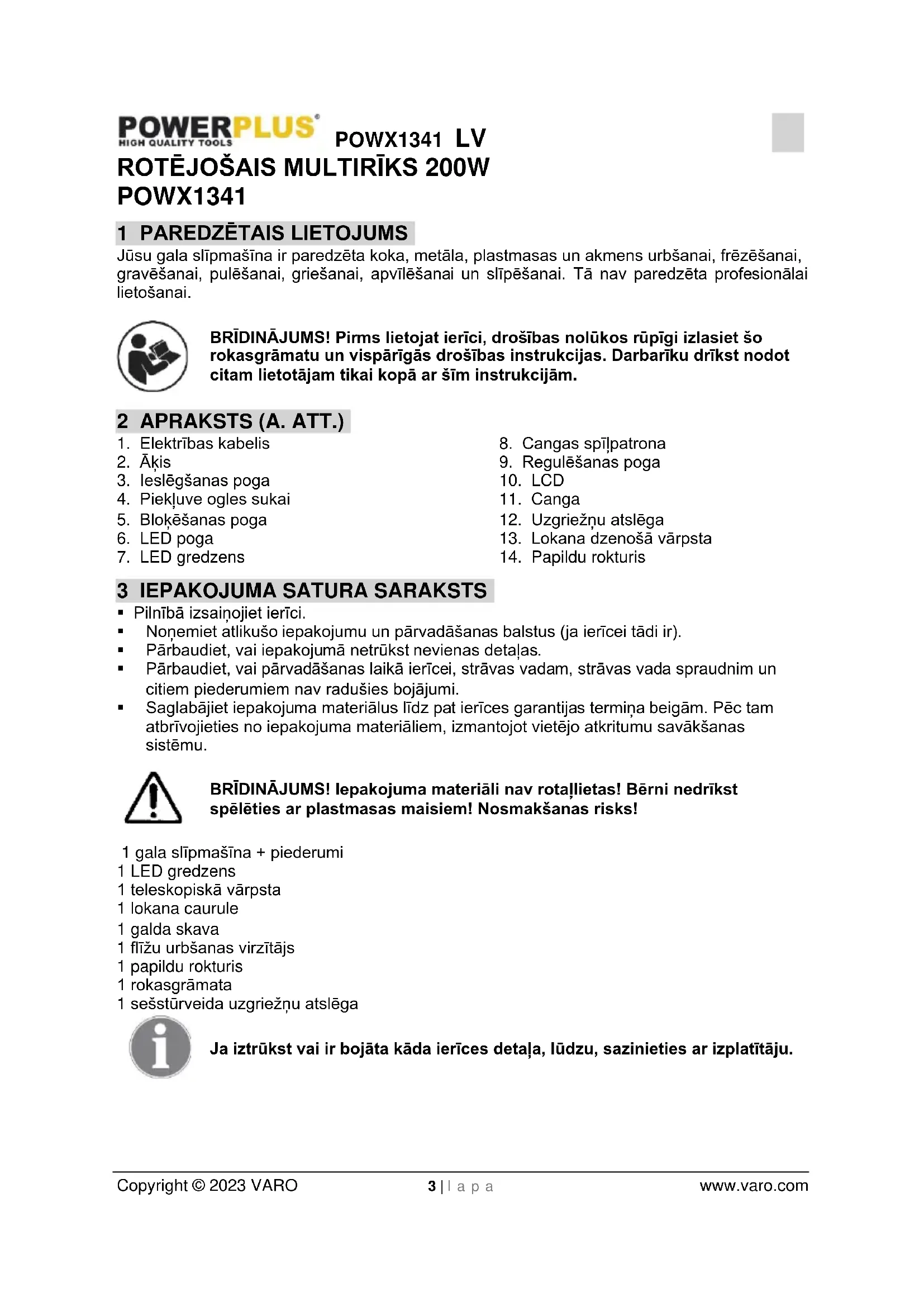 - Pārliecinieties, vai izmantojamie piederumi ir piemēroti tehnisko datu lapā norādītajam maksimālajam ātrumam.POWX1341 LV Copyright © 2023 VARO 7 | l a p a www.varo.com