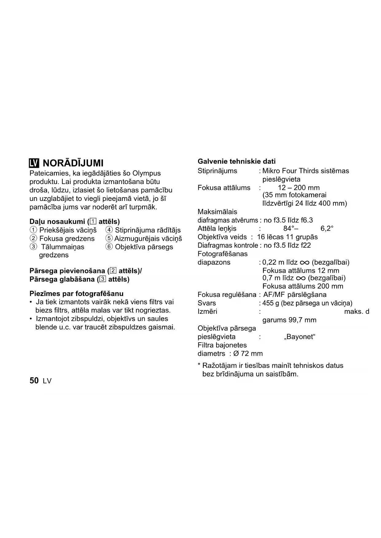 - Izmantojot zibspuldzi, objektīvs un saules blende u.c. var traucēt zibspuldzes gaismai. Galvenie tehniskie dati Stiprinājums : Mikro Four Thirds sistēmas pieslēgvieta Fokusa attālums : 12 – 200 mm (35 mm fotokamerai līdzvērtīgi 24 līdz 400 mm) Maksimālais diafragmas atvērums : no f3.5 līdz f6.3 Attēla leņķis : 84°– 6,2° Objektīva veids : 16 lēcas 11 grupās Diafragmas kontrole : no f3.5 līdz f22 Fotografēšanas diapazons : 0,22 m līdz ) (bezgalībai) Fokusa attālums 12 mm 0,7 m līdz ) (bezgalībai) Fokusa attālums 200 mm Fokusa regulēšana : AF/MF pārslēgšana Svars : 455 g (bez pārsega un vāciņa) Izmēri : maks. diam. Ø 77,5 × garums 99,7 mm Objektīva pārsega pieslēgvieta : „Bayonet“ Filtra bajonetes diametrs : Ø 72 mm