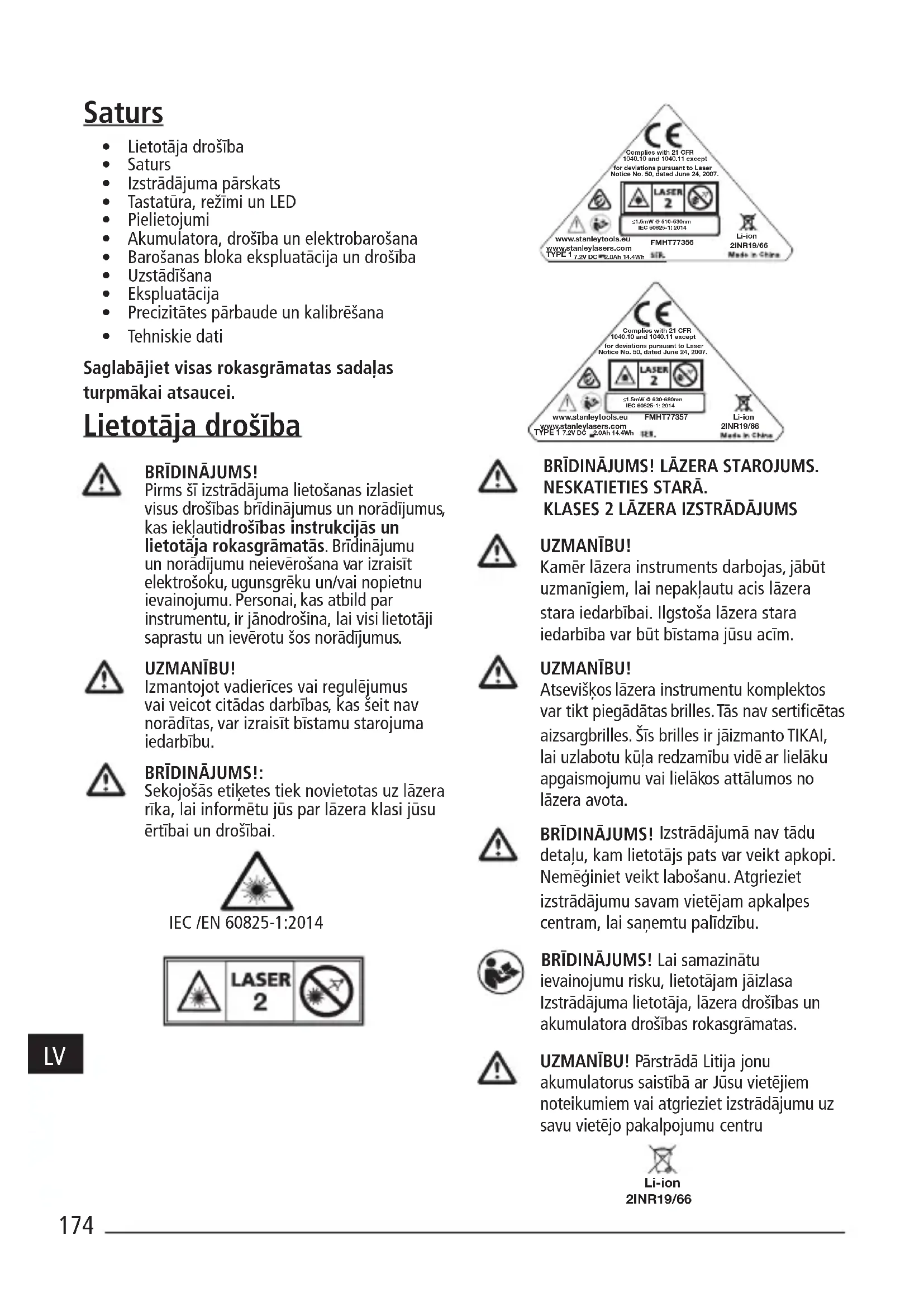 - Lāzera izstrādājums nav lietotājam apkopjams un atteices vai bojājuma gadījumā jāatgriež savam izplatītājam vai Stanley garantijas/ apkopes centram. Jebkura ierīces apkalpošana jāveic kvalicētai personai, kas izmanto tikai identiskas rezerves daļas. Tas nodrošinās, ka tiek uzturēta izstrādājuma drošība.177