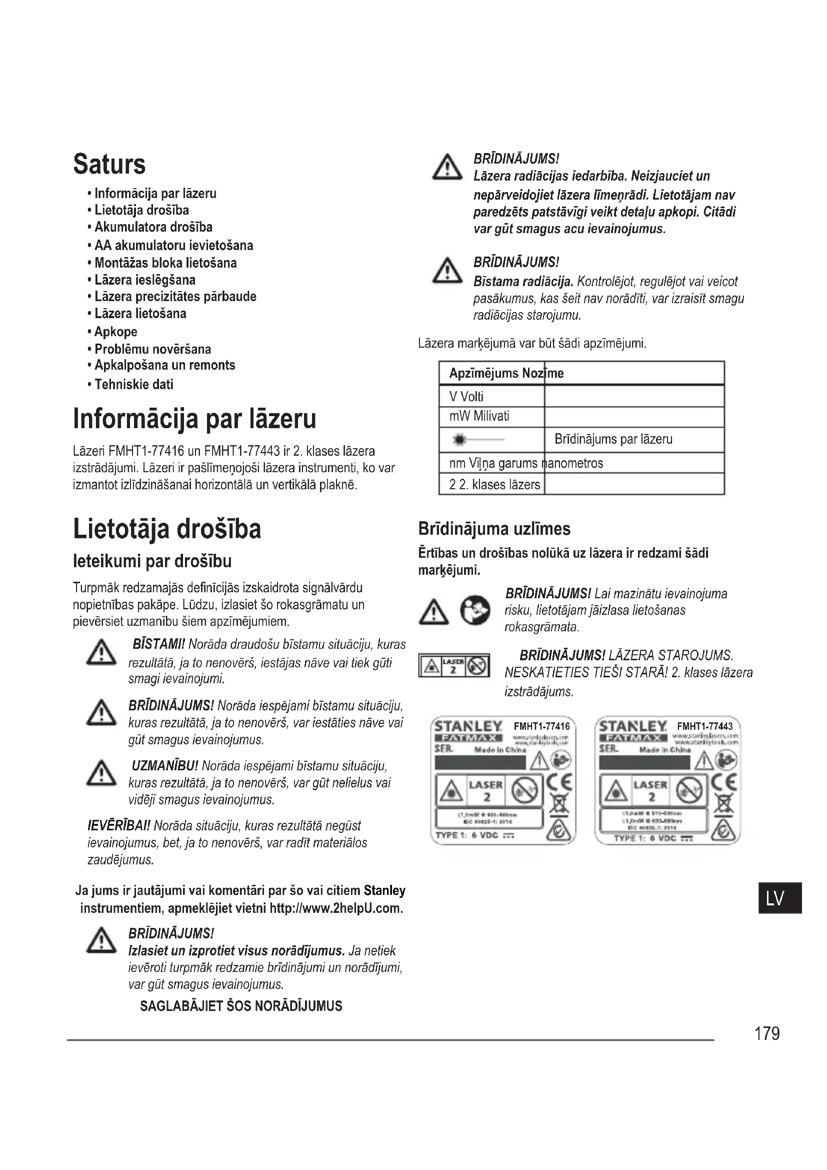 - Tehniskie dati Informācija par lāzeru Lāzeri FMHT1-77416 un FMHT1-77443 ir 2. klases lāzera izstrādājumi. Lāzeri ir pašlīmeņojoši lāzera instrumenti, ko var izmantot izlīdzināšanai horizontālā un vertikālā plaknē. Lietotāja drošība Ieteikumi par drošību Turpmāk redzamajās denīcijās izskaidrota signālvārdu nopietnības pakāpe. Lūdzu, izlasiet šo rokasgrāmatu un pievērsiet uzmanību šiem apzīmējumiem. BĪSTAMI! Norāda draudošu bīstamu situāciju, kuras rezultātā, ja to nenovērš, iestājas nāve vai tiek gūti smagi ievainojumi. BRĪDINĀJUMS! Norāda iespējami bīstamu situāciju, kuras rezultātā, ja to nenovērš, var iestāties nāve vai gūt smagus ievainojumus. UZMANĪBU! Norāda iespējami bīstamu situāciju, kuras rezultātā, ja to nenovērš, var gūt nelielus vai vidēji smagus ievainojumus. IEVĒRĪBAI! Norāda situāciju, kuras rezultātā negūst ievainojumus, bet, ja to nenovērš, var radīt materiālos zaudējumus. Ja jums ir jautājumi vai komentāri par šo vai citiem Stanley instrumentiem, apmeklējiet vietni http://www.2helpU.com. BRĪDINĀJUMS! Izlasiet un izprotiet visus norādījumus. Ja netiek ievēroti turpmāk redzamie brīdinājumi un norādījumi, var gūt smagus ievainojumus.