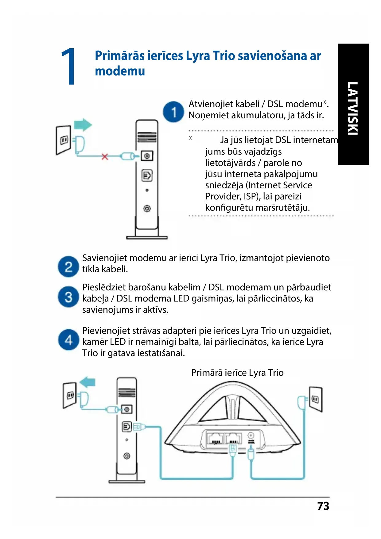 Savienojiet modemu ar ierīci Lyra Trio, izmantojot pievienoto tīkla kabeli.Atvienojiet kabeli / DSL modemu*. Noņemiet akumulatoru, ja tāds ir.* Ja jūs lietojat DSL internetam, jums būs vajadzīgs lietotājvārds / parole no jūsu interneta pakalpojumu sniedzēja (Internet Service Provider, ISP), lai pareizi kongurētu maršrutētāju.Pieslēdziet barošanu kabelim / DSL modemam un pārbaudiet kabeļa / DSL modema LED gaismiņas, lai pārliecinātos, ka savienojums ir aktīvs. Pievienojiet strāvas adapteri pie ierīces Lyra Trio un uzgaidiet, kamēr LED ir nemainīgi balta, lai pārliecinātos, ka ierīce Lyra Trio ir gatava iestatīšanai. LAN Primārā ierīce Lyra Trio74 LATVISKI Ierīces Lyra Trio WiFi sistēmas iestatīšana Palaidiet ASUS Lyra lietotni savā mobilajā ierīcē un izpildiet norādījumus tikai pāris mirkļos.
