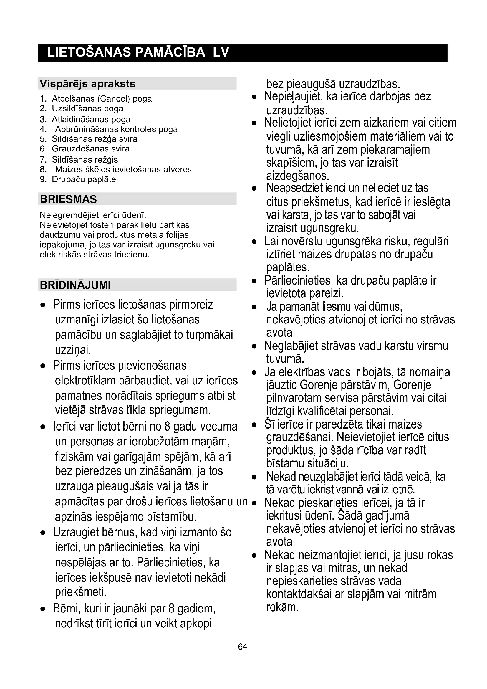 Ja elektribas vads ir bojats, ta nomaina jauztic Gorenje pärstavim, Gorenje pilnvarotam servisa pärstavim vai citai lidzigi kvalificetai personai. - Sī ierīce ir paredzēta tikai maizes grauzdēšanai. Neievietojiet ierīcē citrus produktus, jo šāda rīcība var radīt bīstamu situāciju.