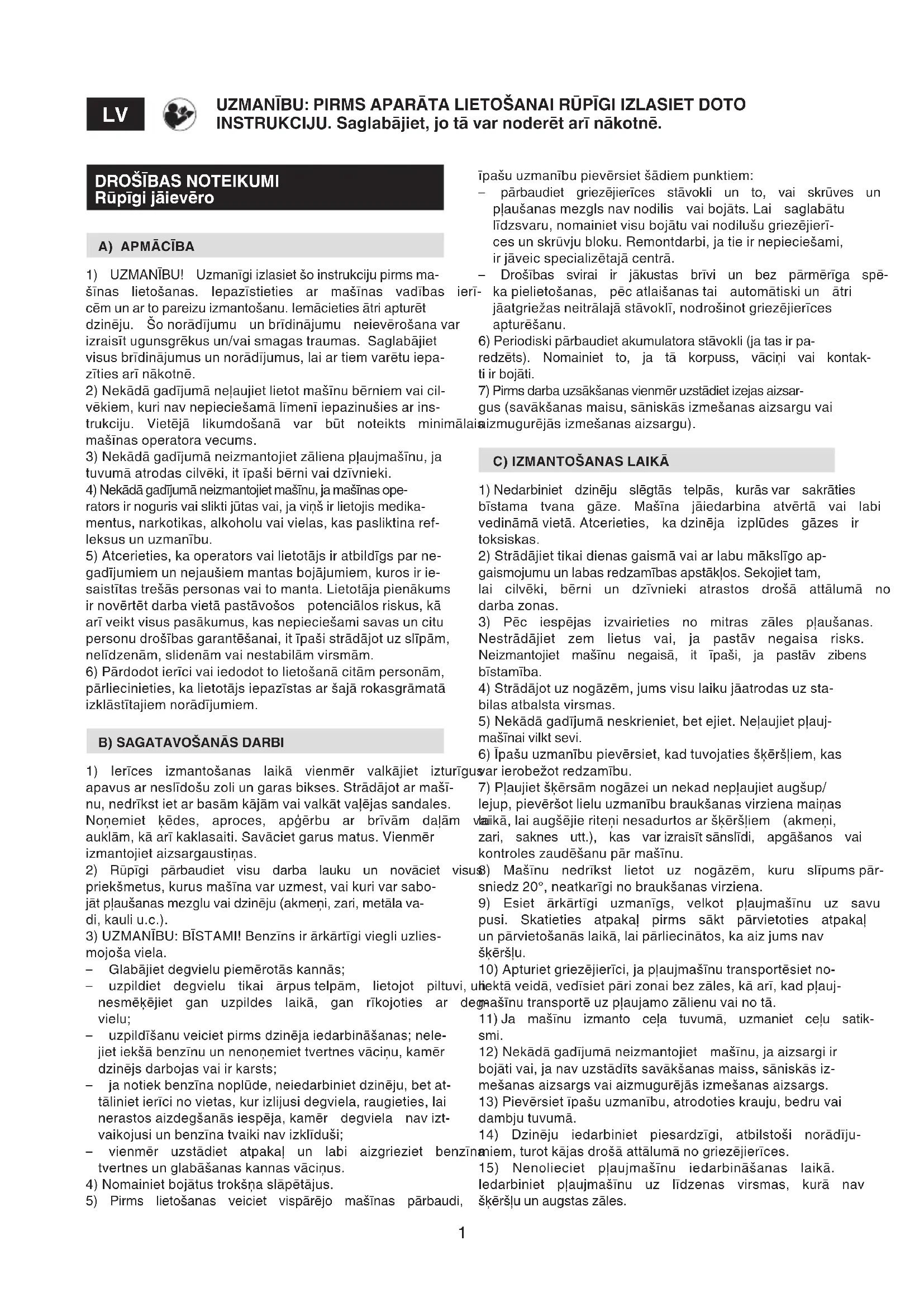 1) Ierīces izmantošanas laikā vienmēr valkājiet izturīgus apavus ar neslīdošu zoli un garas bikses. Strādājot ar mašī- nu, nedrīkst iet ar basām kājām vai valkāt vaļējas sandales. Noņemiet ķēdes, aproces, apģērbu ar brīvām daļām vai auklām, kā arī kaklasaiti. Savāciet garus matus. Vienmēr izmantojiet aizsargaustiņas. 2) Rūpīgi pārbaudiet visu darba lauku un novāciet visus priekšmetus, kurus mašīna var uzmest, vai kuri var sabo- jāt pļaušanas mezglu vai dzinēju (akmeņi, zari, metāla va- di, kauli u.c.). 3) UZMANĪBU: BĪSTAMI! Benzīns ir ārkārtīgi viegli uzlies- mojoša viela. – Glabājiet degvielu piemērotās kannās; – uzpildiet degvielu tikai ārpus telpām, lietojot piltuvi, un nesmēķējiet gan uzpildes laikā, gan rīkojoties ar deg- vielu; – uzpildīšanu veiciet pirms dzinēja iedarbināšanas; nele- jiet iekšā benzīnu un nenoņemiet tvertnes vāciņu, kamēr dzinējs darbojas vai ir karsts; – ja notiek benzīna noplūde, neiedarbiniet dzinēju, bet at- tāliniet ierīci no vietas, kur izlijusi degviela, raugieties, lai nerastos aizdegšanās iespēja, kamēr degviela nav izt- vaikojusi un benzīna tvaiki nav izklīduši; – vienmēr uzstādiet atpakaļ un labi aizgrieziet benzīna tvertnes un glabāšanas kannas vāciņus. 4) Nomainiet bojātus trokšņa slāpētājus. 5) Pirms lietošanas veiciet vispārējo mašīnas pārbaudi,
