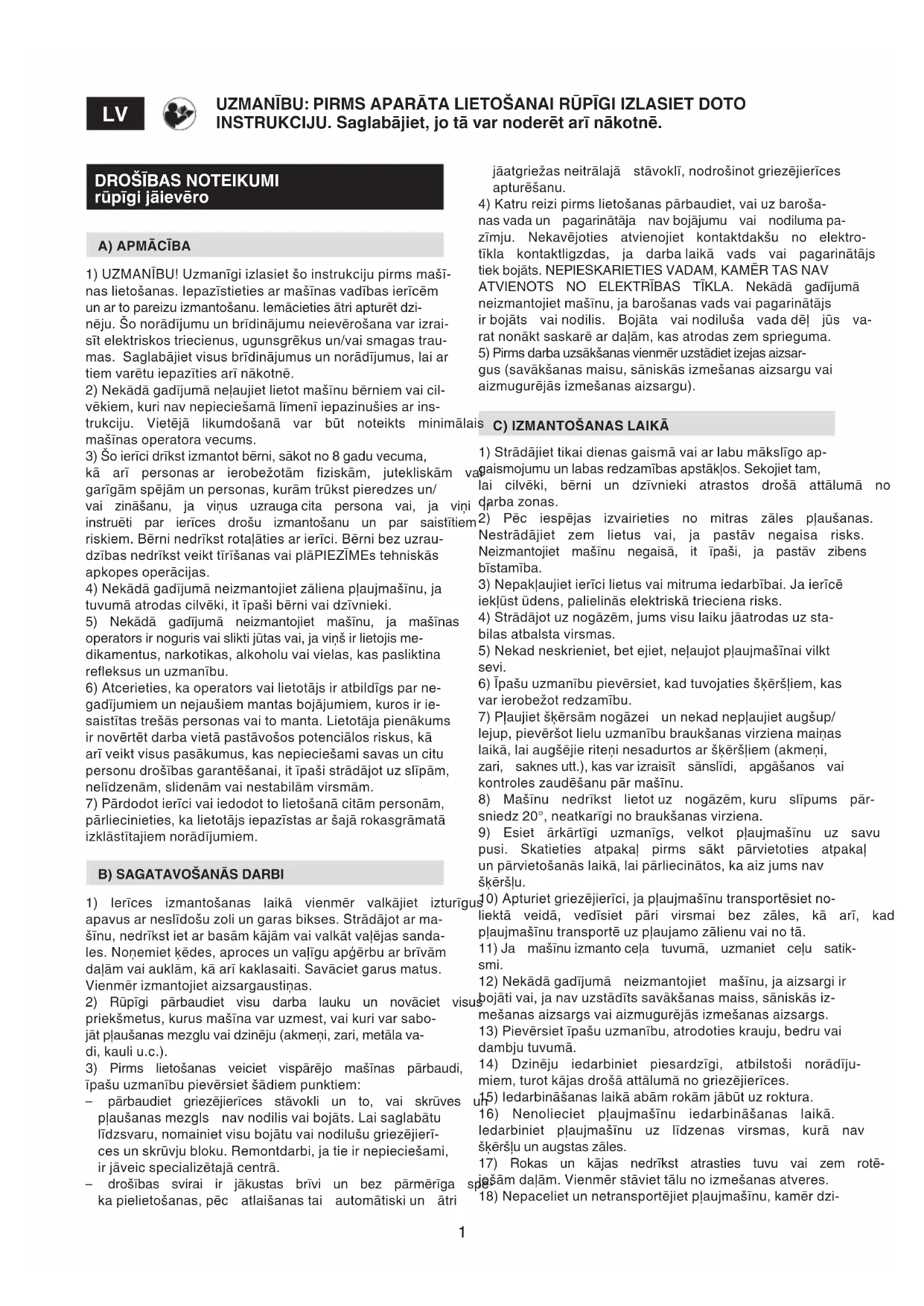 UZMANĪBU: PIRMS APARĀTA LIETOŠANAI RŪPĪGI IZLASIET DOTO INSTRUKCIJU. Saglabājiet, jo tā var noderēt arī nākotnē. jāatgriežas neitrālajā stāvoklī, nodrošinot griezējierīces apturēšanu. 4) Katru reizi pirms lietošanas pārbaudiet, vai uz baroša- nas vada un pagarinātāja nav bojājumu vai nodiluma pa- zīmju. Nekavējoties atvienojiet kontaktdakšu no elektro- tīkla kontaktligzdas, ja darba laikā vads vai pagarinātājs tiek bojāts. NEPIESKARIETIES VADAM, KAMĒR TAS NAV ATVIENOTS NO ELEKTRĪBAS TĪKLA. Nekādā gadījumā neizmantojiet mašīnu, ja barošanas vads vai pagarinātājs ir bojāts vai nodilis. Bojāta vai nodiluša vada dēļ jūs va- rat nonākt saskarē ar daļām, kas atrodas zem sprieguma. 5) Pirms darba uzsākšanas vienmēr uzstādiet izejas aizsar- gus (savākšanas maisu, sāniskās izmešanas aizsargu vai aizmugurējās izmešanas aizsargu).