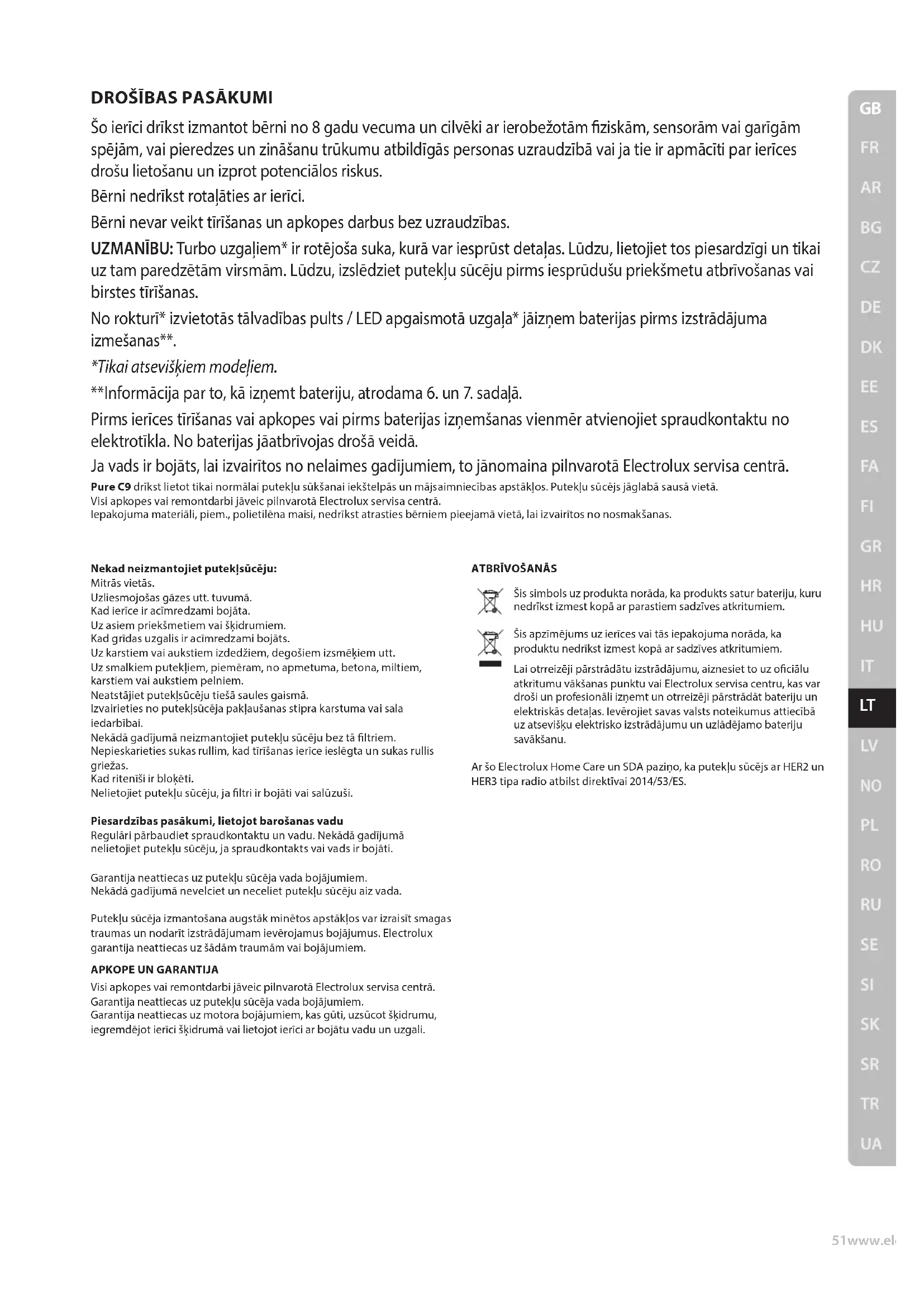 Šis simbols uz produkta norāda, ka produkts satur bateriju, kuru nedrīkst izmest kopā ar parastiem sadzīves atkritumiem. Šis apzīmējums uz ierīces vai tās iepakojuma norāda, ka produktu nedrīkst izmest kopā ar sadzīves atkritumiem. Lai otrreizēji pārstrādātu izstrādājumu, aiznesiet to uz ociālu atkritumu vākšanas punktu vai Electrolux servisa centru, kas var droši un profesionāli izņemt un otrreizēji pārstrādāt bateriju un elektriskās detaļas. Ievērojiet savas valsts noteikumus attiecībā uz atsevišķu elektrisko izstrādājumu un uzlādējamo bateriju savākšanu. Ar šo Electrolux Home Care un SDA paziņo, ka putekļu sūcējs ar HER2 un HER3 tipa radio atbilst direktīvai 2014/53/ES.