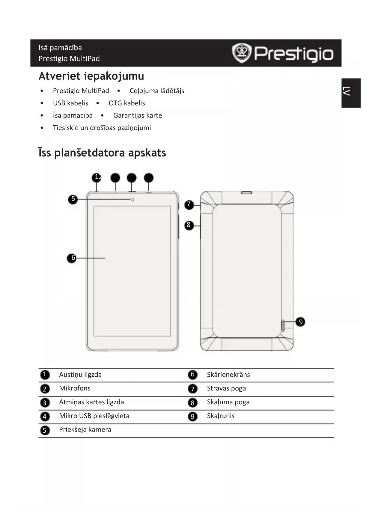 PriekšējākameraLV Īsā pamācība Prestigio MultiPad Pogas Poga Definīcija Funkcija Strāvaspoga