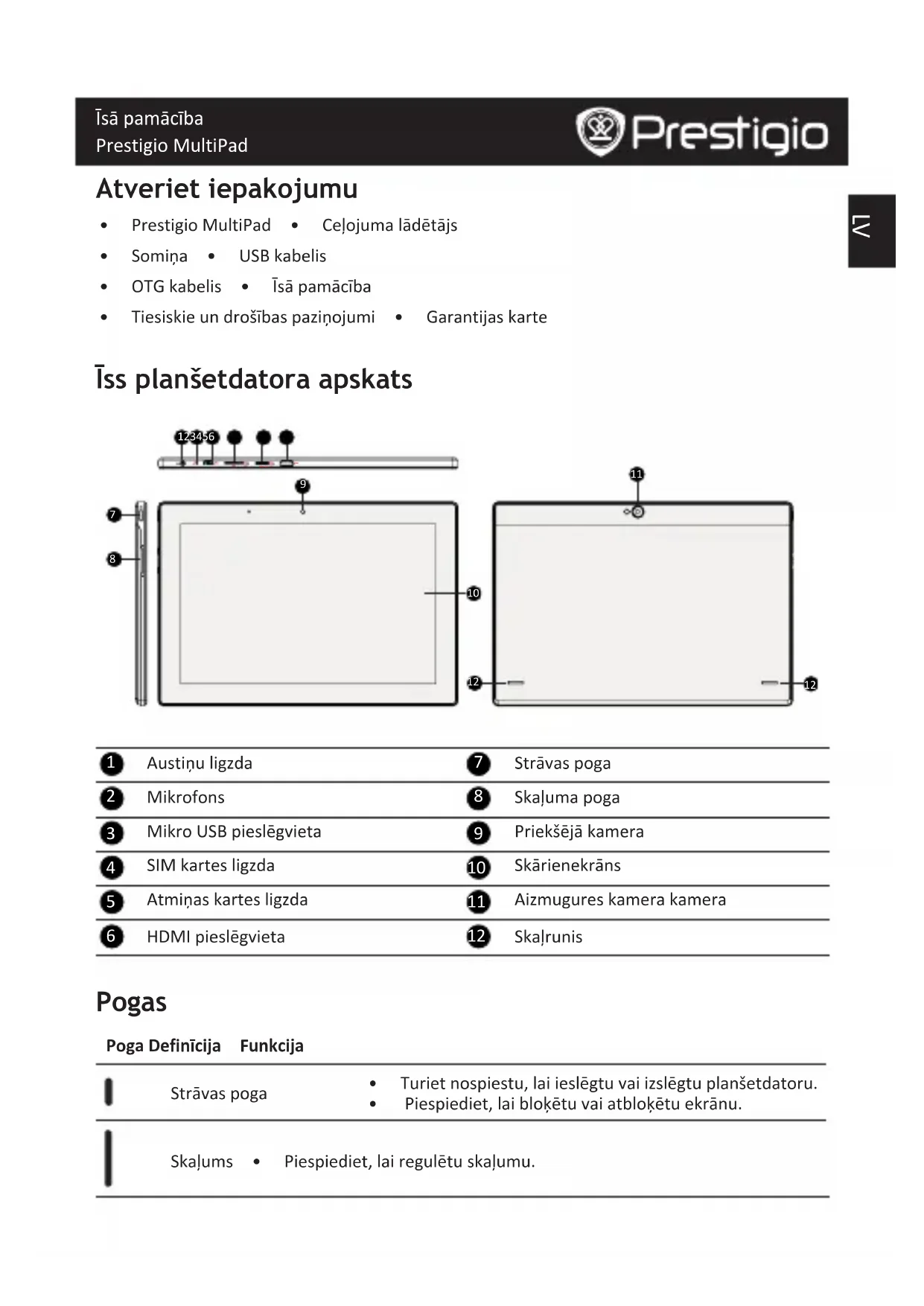 - Piespiediet,laibloķētuvaiatbloķētuekrānu. Skaļums • Piespiediet,lairegulētuskaļumu.LV Īsā pamācība Prestigio MultiPad Atpakaļ