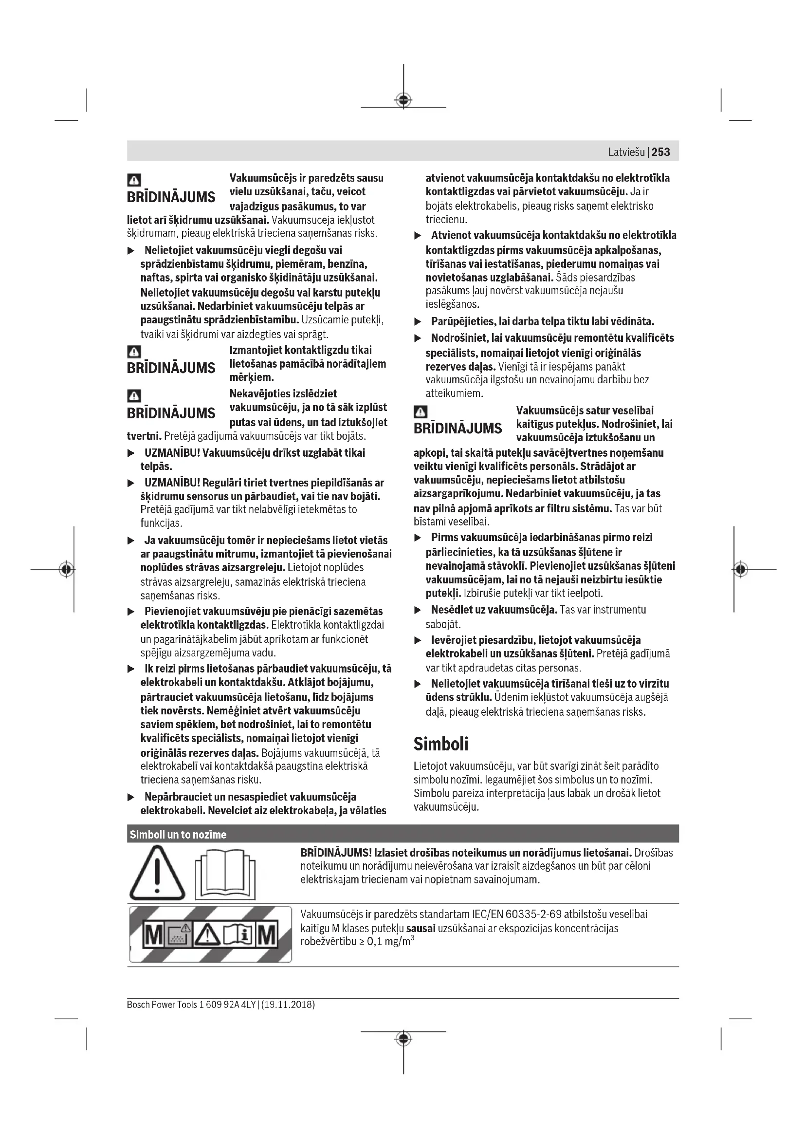 Latviešu | 253 Bosch Power Tools 1 609 92A 4LY | (19.11.2018)254 | Latviešu 1 609 92A 4LY | (19.11.2018) Bosch Power Tools Simboli un to nozīme BRĪDINĀJUMS! Vakuumsūcējs satur veselībai kaitīgus putekļus. Nodrošiniet, lai vakuumsūcēja iztukšošanu un apkopi, tai skaitā putekļu savācējtvertnes noņemšanu veiktu vienīgi kvalificēts personāls. Strādājot ar vakuumsūcēju, nepieciešams lietot atbilstošu aizsargaprīkojumu. Nedarbiniet vakuumsūcēju, ja tas nav pilnā apjomā aprīkots ar filtru sistēmu. Tas var būt bīstami veselībai. Pievienojiet vakuumsūcējam ne vairāk, kā vienu konteineri L-Boxx. Konteinera L-Boxx un tā satura kopējais svars nedrīkst pārsniegt 15kg. Neuzkariniet vakuumsūcēju uz āķa, piemēram, transportēšanas laikā. Vakuumsūcējs nav paredzēts piekarināšanai. Tas var radīt savainojumus un materiālo vērtību bojājumus. Nelietojiet vakuumsūcēju kā sēdekli, kāpnes vai kāpsli. Vakuumsūcējs var apgāzties un tikt bojāts. Šādā gadījumā var rasties savainojumi. Automātiska ieslēgšanās un izslēgšanās Ļauj uzsūkt putekļus no darbināmajiem elektroinstrumentiem Vakuumsūcējs automātiski ieslēdzas un pēc tam izslēdzas ar zināmu laika aizturi Izslēgšana Uzsūkšana Nosēdušos putekļu uzsūkšana