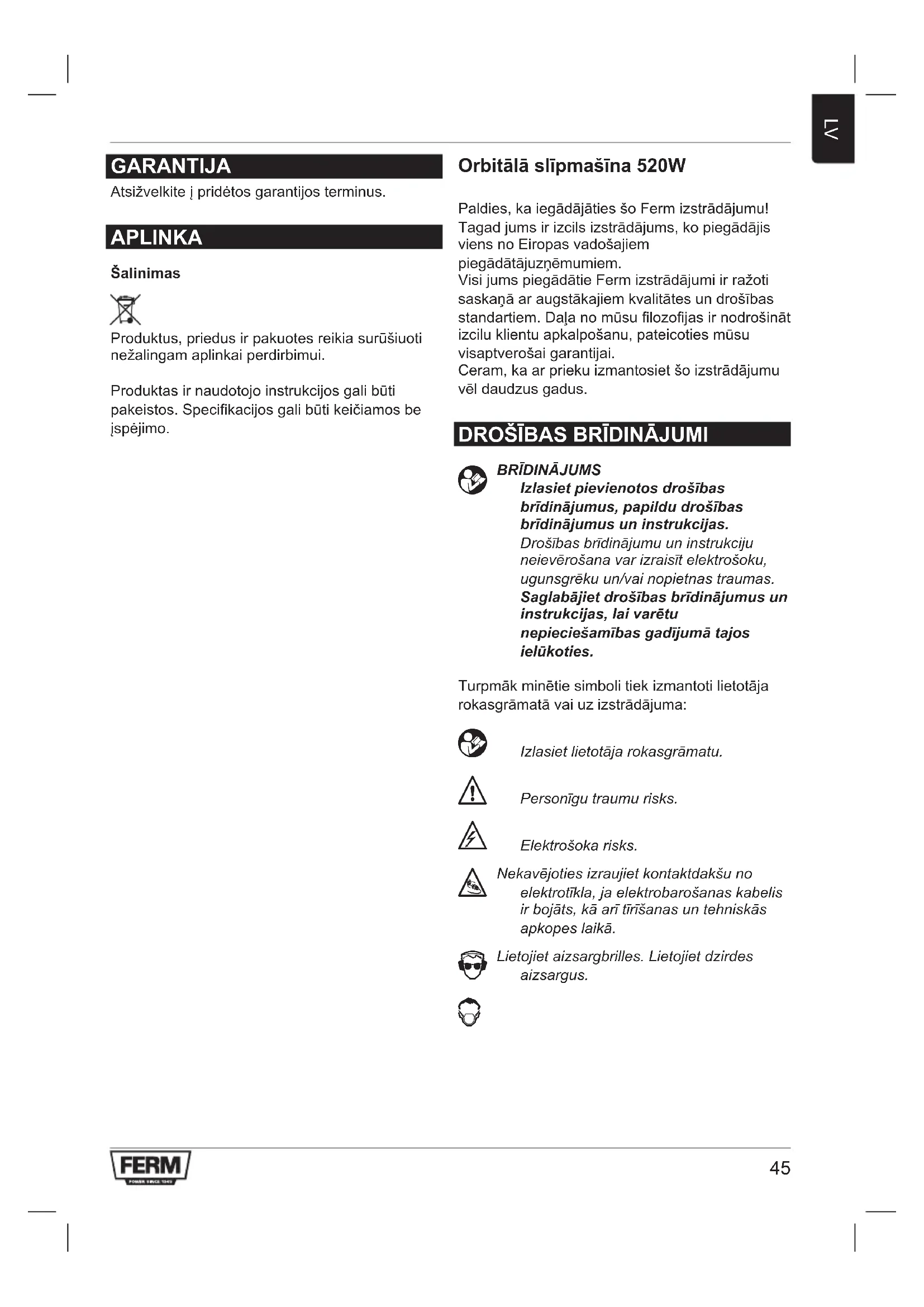 GARANTIJA Atsižvelkiteįpridėtosgarantijosterminus. APLINKA Šalinimas Produktus,priedusirpakuotesreikiasurūšiuoti nežalingamaplinkaiperdirbimui. Produktasirnaudotojoinstrukcijosgalibūti pakeistos.Specikacijosgalibūtikeičiamosbe įspėjimo. Orbitālā slīpmašīna 520W Paldies,kaiegādājātiesšoFermizstrādājumu! Tagadjumsirizcilsizstrādājums,kopiegādājis viensnoEiropasvadošajiem piegādātājuzņēmumiem. VisijumspiegādātieFermizstrādājumiirražoti saskaņāaraugstākajiemkvalitātesundrošības standartiem.Daļanomūsulozojasirnodrošināt izciluklientuapkalpošanu,pateicotiesmūsu visaptverošaigarantijai. Ceram,kaarpriekuizmantosietšoizstrādājumu vēldaudzusgadus.