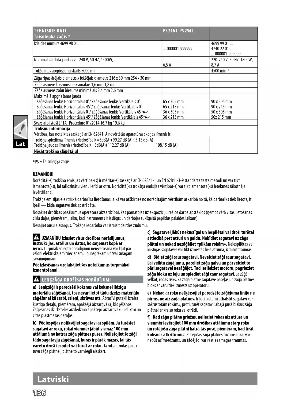 Zāģa ripas ārējais diametrs x iekšējais diametrs 216 x 30 mm 254 x 30 mm Zāģa asmens biezums maksimālais 1,6 mm 1,8 mm Zāģa asmens zobu biezums minimālais 2,4 mm 2,6 mm Maksimālā apgriešanas jauda Zāģēšanas leņķis Horizontālais 0°/ Zāģēšanas leņķis Vertikālais 0° Zāģēšanas leņķis Horizontālais 45°/ Zāģēšanas leņķis Vertikālais 0° Zāģēšanas leņķis Horizontālais 0°/ Zāģēšanas leņķis Vertikālais 45° Zāģēšanas leņķis Horizontālais 45°/ Zāģēšanas leņķis Vertikālais 45° 65 x 305 mm 65 x 215 mm 36 x 305 mm 36 x 215 mm 90 x 305 mm 90 x 215 mm 50 x 305 mm 50x 215 mm Svars atbilstoši EPTA -Procedure 01/2014 16,7 kg 19,6 kg Trokšņu informācija Vērtības, kas noteiktas saskaņā ar EN 62841. A novērtētās aparatūras skaņas līmenis ir: Trokšņa spiediena līmenis (Nedrošība K=3dB(A)) 99,27 dB (A) 95,15 dB (A) Trokšņa jaudas līmenis (Nedrošība K=3dB(A)) 112,27 dB (A) 108,15 dB (A) Nēsāt trokšņa slāpētāju! *PS