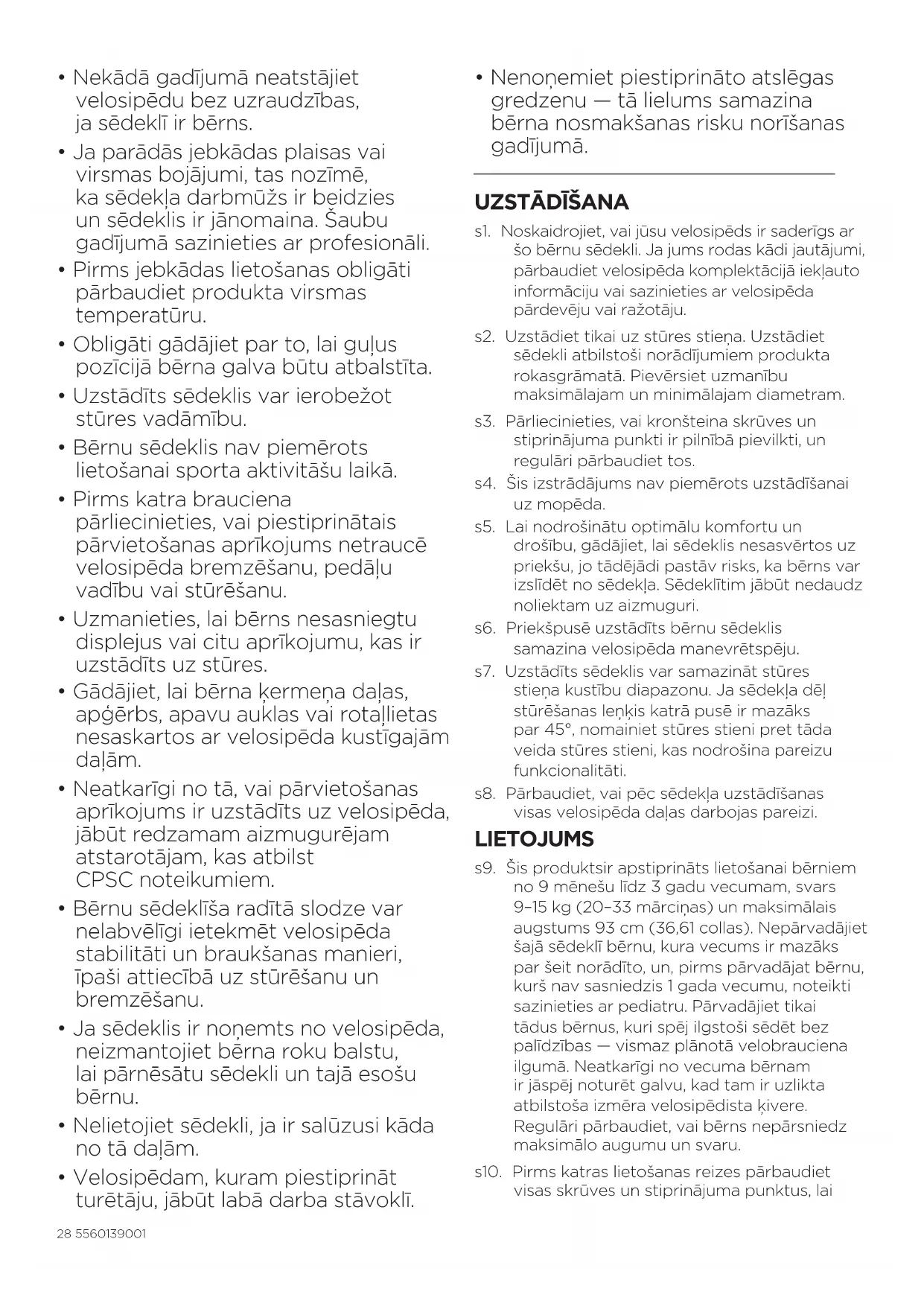s1. Noskaidrojiet, vai jūsu velosipēds ir saderīgs ar šo bērnu sēdekli. Ja jums rodas kādi jautājumi, pārbaudiet velosipēda komplektācijā iekļauto informāciju vai sazinieties ar velosipēda pārdevēju vai ražotāju. s2. Uzstādiet tikai uz stūres stieņa. Uzstādiet sēdekli atbilstoši norādījumiem produkta rokasgrāmatā. Pievērsiet uzmanību maksimālajam unminimālajam diametram. s3. Pārliecinieties, vai kronšteina skrūves un stiprinājuma punkti ir pilnībā pievilkti, un regulāri pārbaudiet tos. s4. Šis izstrādājums nav piemērots uzstādīšanai uz mopēda. s5. Lai nodrošinātu optimālu komfortu un drošību, gādājiet, lai sēdeklis nesasvērtos uz priekšu, jo tādējādi pastāv risks, ka bērns var izslīdēt no sēdekļa. Sēdeklītim jābūt nedaudz noliektam uz aizmuguri. s6. Priekšpusē uzstādīts bērnu sēdeklis samazina velosipēda manevrētspēju. s7. Uzstādīts sēdeklis var samazināt stūres stieņa kustību diapazonu. Ja sēdekļa dēļ stūrēšanas leņķis katrā pusē ir mazāks par 45°, nomainiet stūres stieni pret tāda veida stūres stieni, kas nodrošina pareizu funkcionalitāti. s8. Pārbaudiet, vai pēc sēdekļa uzstādīšanas visas velosipēda daļasdarbojas pareizi. LIETOJUMS s9. Šis produktsir apstiprināts lietošanai bērniem no 9mēnešu līdz 3gadu vecumam, svars 9–15kg (20–33mārciņas) un maksimālais augstums 93 cm (36,61 collas). Nepārvadājiet šajā sēdeklī bērnu, kura vecums ir mazāks par šeit norādīto, un, pirms pārvadājat bērnu, kurš nav sasniedzis 1gada vecumu, noteikti sazinieties ar pediatru. Pārvadājiet tikai tādus bērnus, kuri spēj ilgstoši sēdēt bez palīdzības— vismaz plānotā velobrauciena ilgumā. Neatkarīgi no vecuma bērnam ir jāspēj noturēt galvu, kad tam ir uzlikta atbilstoša izmēra velosipēdista ķivere. Regulāri pārbaudiet, vai bērns nepārsniedz maksimālo augumu un svaru. s10. Pirms katras lietošanas reizes pārbaudiet visas skrūves un stiprinājuma punktus, lai295560139001 nodrošinātu, ka bērnu sēdeklītis ir droši piestiprināts pie velosipēda. s11. Braucot pirmo reizi ar uzstādītu bērnu velosipēda sēdeklīti - pirms braukšanas uz ielas izmēģiniet velosipēdu drošā/klusā vidē. s12. Rūpīgi novērtējiet stabilitāti/līdzsvaru, kad ievietojat bērnu velosipēda sēdeklī. s13. Brauciena laikā gan jums, gan bērnam ir jālieto EN1078 standarta prasībām atbilstoša velosipēdista ķivere. s14. Pievērsiet uzmanību savam bērnam regulāri braucienu laikā. s15. Nekad neatstājiet bērnu bez uzraudzības bērnu sēdeklī. s16. Nekad neatstājiet velosipēdu bez uzraudzības, atbalstot to tikai uz atbalsta kājiņas, ja sēdeklī sēž bērns. s17. Nekādā gadījumā nebrauciet ar velosipēdu diennakts tumšajā laikā, ja nav uzstādīts piemērots apgaismojums. s18. Kad velosipēdam piestiprināsiet bērnu sēdekli, iespējams, būs jāmaina veids, kā uzkāpt un nokāpt no velosipēda. Pievērsiet tam papildus uzmanību. s19. Pirms katra brauciena pārliecinieties, vai piestiprinātais velosipēda sēdeklis netraucē bremzēt, mīties vai stūrēt. s20. Vienmēr lietojiet drošības jostas un pārliecinieties, vai bērnam tās ir nostiprinātas pareizi. Pārbaudiet, vai jostas un kāju siksnas nav kļuvušas vaļīgas un vai tām nepastāv risks tikt ierautām kustīgajās daļās, piemēram, riteņos. Tas attiecas arī uz gadījumiem, ja ritenim ir piestiprināts sēdeklis, bet bērns netiek pārvadāts. s21. Nodrošiniet, lai velosipēda kustīgajās daļās, piemēram, riteņos, vados un sēdekļa atsperēs, neiekļūtu bērna apģērbs, kurpes, rotaļlietas vai ķermeņa daļas. To regulāri pārbaudiet, bērnam kļūstot vecākam. Sēdekļa atsperes var nosegt ar atbilstošu atsperu aizsargu. s22. Gādājiet, lai bērnam nebūtu aizsniedzami asi priekšmeti, piemēram, vaļēji kabeļi. s23. Bērnam, kas sēž sēdeklī, bieži ir nepieciešams siltāks apģērbs nekā pašam braucējam. Lai aizsargātu gan sevi, gan bērnu no neparedzētas lietusgāzes, ir ieteicams valkāt ūdensizturīgu apģērbu. Nekad nebrauciet nelabvēlīgā vai bīstamā laikā, piemēram, aukstumā— bērns var iegūt apsaldējumus. s24. Pirms jūs sēdināt bērnu sēdeklī, pārbaudiet bērnu sēdekļa temperatūru, jo īpaši karstās, saulainās dienās. s25. Pirms velosipēda pārvadāšanas automašīnā noņemiet bērnu sēdekli. Automašīnas šūpošanās var sabojāt sēdekli vai padarīt vaļīgākus stiprinājumus, kas savukārt var izraisīt negadījumu. s26. Pirms lietošanas pārbaudiet, vai pastāv kādi valsts likumi vai noteikumi attiecībā uz bērna pārvadāšanu velosipēda bērnu sēdeklī. s27. Ražotājs neatbild par kaitējumu, ja tas radies tādas lietošanas dēļ, kas neatbilst šajā īpašnieka rokasgrāmatā aprakstītajai lietošanai. KOPŠANA s28. Bērnu sēdekļa tīrīšanai izmantojiet tikai remdenu ziepjūdeni. Lai notīrītu polsterējumu, skatiet uz tā sniegtos mazgāšanas norādījumus. s29. Ja kāda bērnu sēdekļa daļa ir bojāta vai salauzta, sazinieties ar tuvāko Thuletirgotāju.