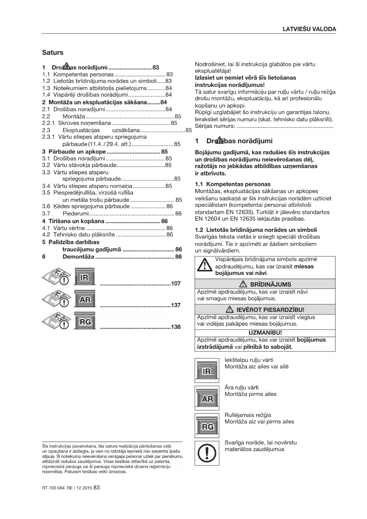 Iekštelpu ruļļu vārti (IR) Ruļļu vārtus iespējams uzstādīt no iekšpuses aiz ailes vai ailē (skat. 1. līdz 12. att.). Āra ruļļu vārti (ĀR) No ārpuses ruļļu vārti tiek uzstādīti pirms ailes (skat.20. līdz 30.att.). Ruļļu režģis (RR) Ruļļu režģi no iekšpuses var iebūvēt aiz ailes vainoārpuses – pirms ailes (skat. 20. līdz30.att.). Lai montāžu veiktu vienkārši un pareizi, rūpīgiizpildiet norādītās darbības! Visi dati attēlu sadaļā norādīti milimetros.