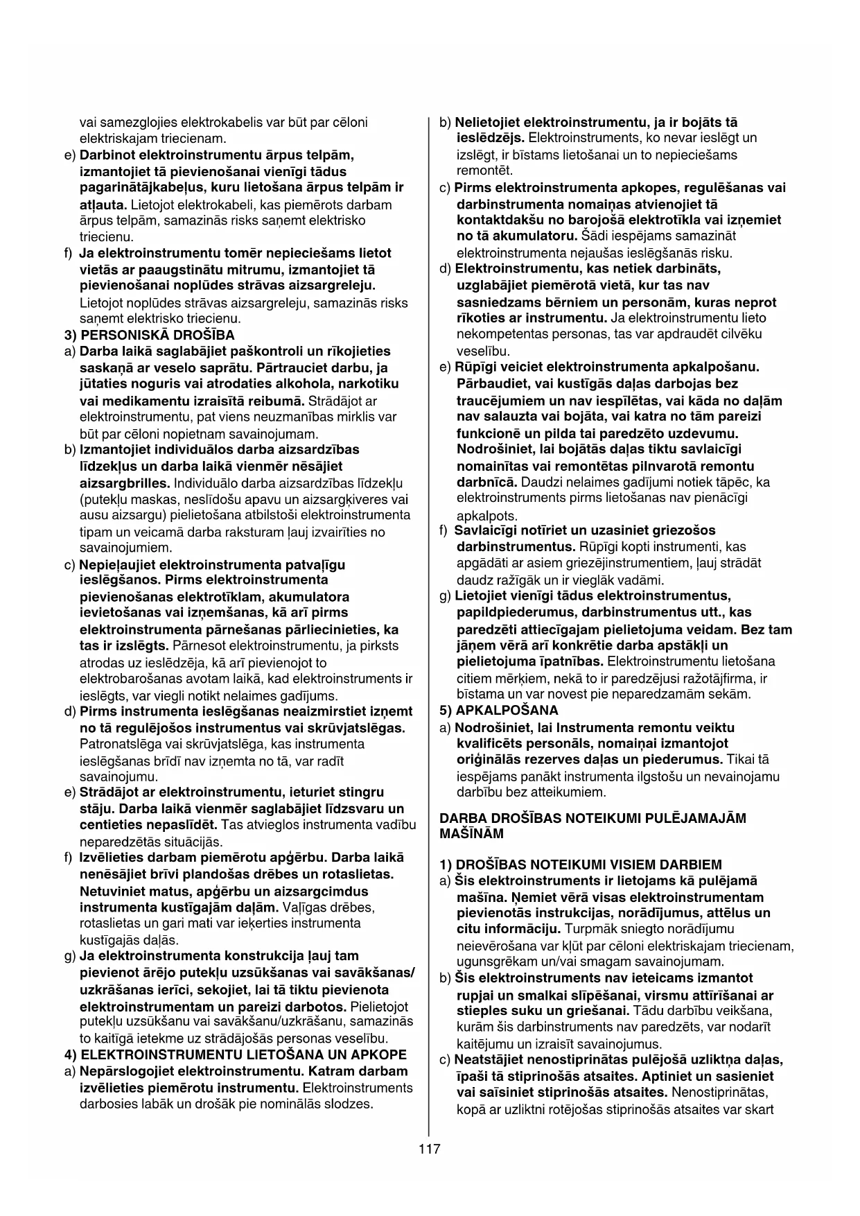 f) Izveliieties darbam piemero tu apgerbu. Darba laikana nenesajiet brivi plandoas drebes un rotaslietas. Netuviniet matus, apgerbu un aizsargcimdus instrumenta kustigajam calam. Valigas drebes, rotaslietas un gari mati var iekerties instrumenta kustigajas calam.