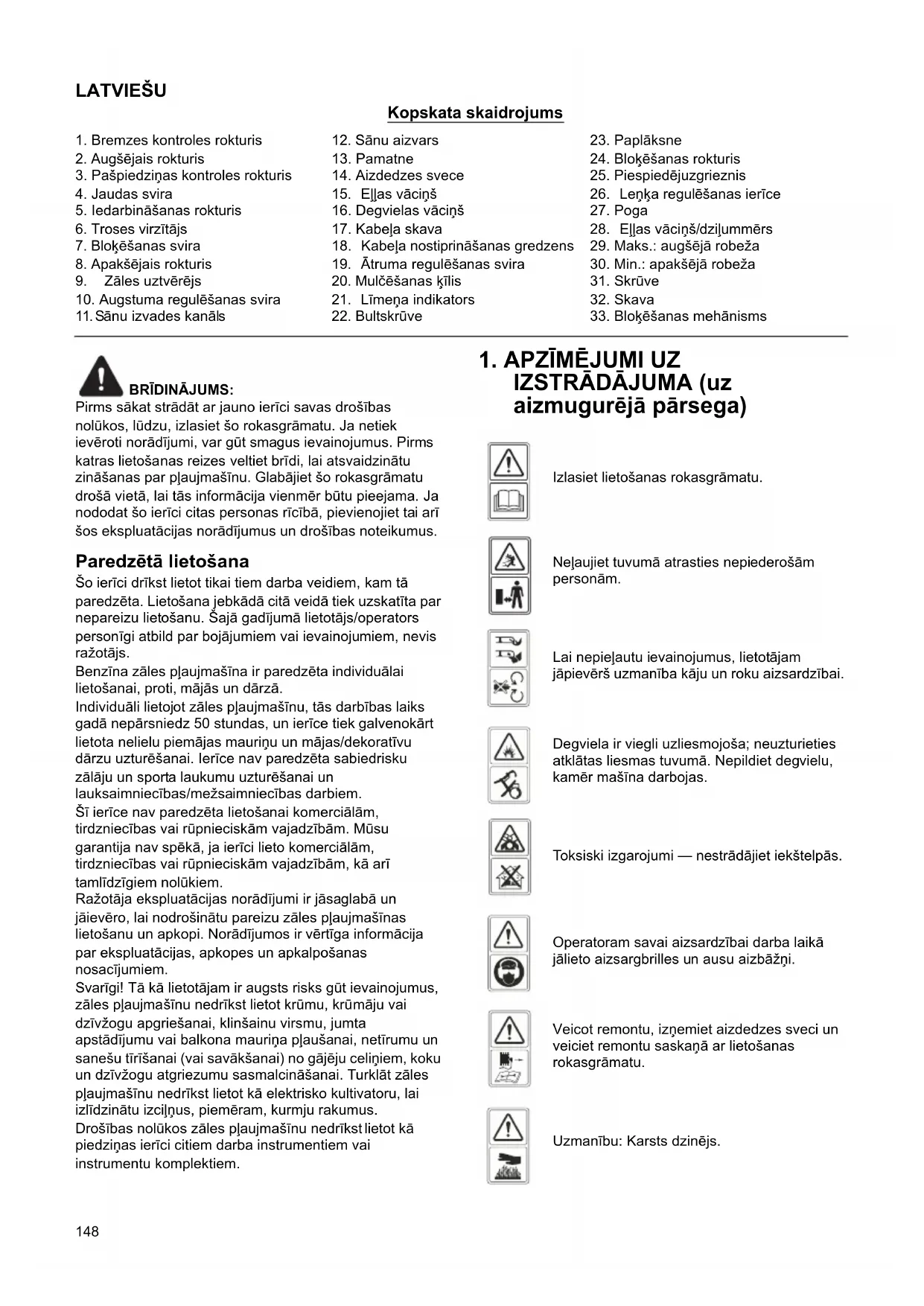 Izlasiet lietošanas rokasgrāmatu. Neļaujiet tuvumā atrasties nepiederošām personām. Lai nepieļautu ievainojumus, lietotājam jāpievērš uzmanība kāju un roku aizsardzībai. Degviela ir viegli uzliesmojoša; neuzturieties atklātas liesmas tuvumā. Nepildiet degvielu, kamēr mašīna darbojas. Toksiski izgarojumi — nestrādājiet iekštelpās. Operatoram savai aizsardzībai darba laikā jālieto aizsargbrilles un ausu aizbāžņi. Veicot remontu, izņemiet aizdedzes sveci un veiciet remontu saskaņā ar lietošanas rokasgrāmatu. Uzmanību: Karsts dzinējs.149