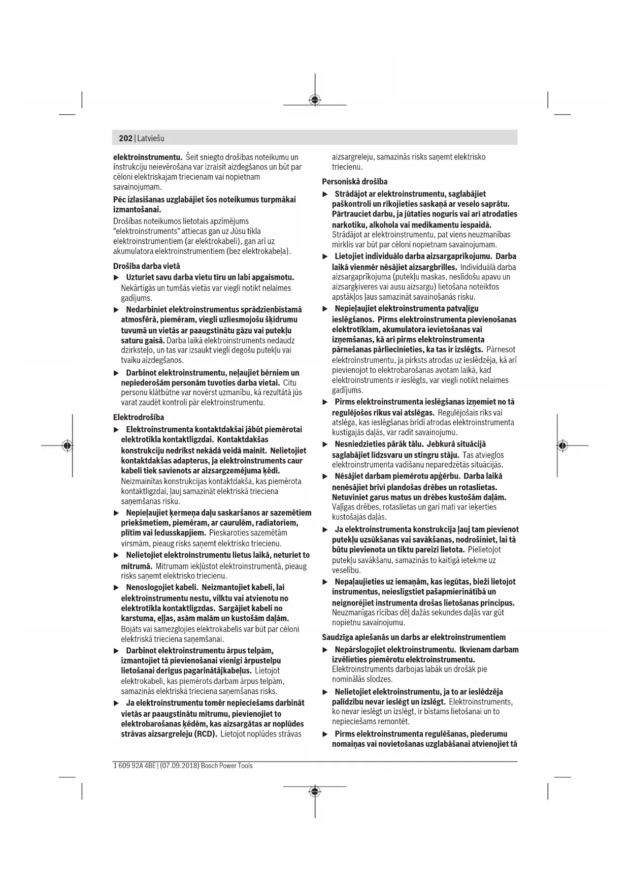 Izlasiet visus drošības noteikumus un instrukcijas, aplūkojiet ilustrācijas un iepazīstieties ar specifikācijām, kas tiek piegādātas kopā ar šo Latviešu | 201 Bosch Power Tools 1 609 92A 4BE | (07.09.2018)202 | Latviešu 1 609 92A 4BE | (07.09.2018) Bosch Power Tools elektroinstrumentu. Šeit sniegto drošības noteikumu un instrukciju neievērošana var izraisīt aizdegšanos un būt par cēloni elektriskajam triecienam vai nopietnam savainojumam. Pēc izlasīšanas uzglabājiet šos noteikumus turpmākai izmantošanai. Drošības noteikumos lietotais apzīmējums "elektroinstruments" attiecas gan uz Jūsu tīkla elektroinstrumentiem (ar elektrokabeli), gan arī uz akumulatora elektroinstrumentiem (bez elektrokabeļa). Drošība darba vietā u Uzturiet savu darba vietu tīru un labi apgaismotu. Nekārtīgās un tumšās vietās var viegli notikt nelaimes gadījums. u Nedarbiniet elektroinstrumentus sprādzienbīstamā atmosfērā, piemēram, viegli uzliesmojošu šķidrumu tuvumā un vietās ar paaugstinātu gāzu vai putekļu saturu gaisā. Darba laikā elektroinstruments nedaudz dzirksteļo, un tas var izsaukt viegli degošu putekļu vai tvaiku aizdegšanos. u Darbinot elektroinstrumentu, neļaujiet bērniem un nepiederošām personām tuvoties darba vietai. Citu personu klātbūtne var novērst uzmanību, kā rezultātā jūs varat zaudēt kontroli pār elektroinstrumentu. Elektrodrošība u Elektroinstrumenta kontaktdakšai jābūt piemērotai elektrotīkla kontaktligzdai. Kontaktdakšas konstrukciju nedrīkst nekādā veidā mainīt. Nelietojiet kontaktdakšas adapterus, ja elektroinstruments caur kabeli tiek savienots ar aizsargzemējuma ķēdi. Neizmainītas konstrukcijas kontaktdakša, kas piemērota kontaktligzdai, ļauj samazināt elektriskā trieciena saņemšanas risku. u Nepieļaujiet ķermeņa daļu saskaršanos ar sazemētiem priekšmetiem, piemēram, ar caurulēm, radiatoriem, plītīm vai ledusskapjiem. Pieskaroties sazemētām virsmām, pieaug risks saņemt elektrisko triecienu. u Nelietojiet elektroinstrumentu lietus laikā, neturiet to mitrumā. Mitrumam iekļūstot elektroinstrumentā, pieaug risks saņemt elektrisko triecienu. u Nenoslogojiet kabeli. Neizmantojiet kabeli, lai elektroinstrumentu nestu, vilktu vai atvienotu no elektrotīkla kontaktligzdas. Sargājiet kabeli no karstuma, eļļas, asām malām un kustošām daļām. Bojāts vai samezglojies elektrokabelis var būt par cēloni elektriskā trieciena saņemšanai. u Darbinot elektroinstrumentu ārpus telpām, izmantojiet tā pievienošanai vienīgi ārpustelpu lietošanai derīgus pagarinātājkabeļus. Lietojot elektrokabeli, kas piemērots darbam ārpus telpām, samazinās elektriskā trieciena saņemšanas risks. u Ja elektroinstrumentu tomēr nepieciešams darbināt vietās ar paaugstinātu mitrumu, pievienojiet to elektrobarošanas ķēdēm, kas aizsargātas ar noplūdes strāvas aizsargreleju (RCD). Lietojot noplūdes strāvas aizsargreleju, samazinās risks saņemt elektrisko triecienu. Personiskā drošība u Strādājot ar elektroinstrumentu, saglabājiet paškontroli un rīkojieties saskaņā ar veselo saprātu. Pārtrauciet darbu, ja jūtaties noguris vai arī atrodaties narkotiku, alkohola vai medikamentu iespaidā. Strādājot ar elektroinstrumentu, pat viens neuzmanības mirklis var būt par cēloni nopietnam savainojumam. u Lietojiet individuālo darba aizsargaprīkojumu. Darba laikā vienmēr nēsājiet aizsargbrilles. Individuālā darba aizsargaprīkojuma (putekļu maskas, neslīdošu apavu un aizsargķiveres vai ausu aizsargu) lietošana noteiktos apstākļos ļaus samazināt savainošanās risku. u Nepieļaujiet elektroinstrumenta patvaļīgu ieslēgšanos. Pirms elektroinstrumenta pievienošanas elektrotīklam, akumulatora ievietošanas vai izņemšanas, kā arī pirms elektroinstrumenta pārnešanas pārliecinieties, ka tas ir izslēgts. Pārnesot elektroinstrumentu, ja pirksts atrodas uz ieslēdzēja, kā arī pievienojot to elektrobarošanas avotam laikā, kad elektroinstruments ir ieslēgts, var viegli notikt nelaimes gadījums. u Pirms elektroinstrumenta ieslēgšanas izņemiet no tā regulējošos rīkus vai atslēgas. Regulējošais rīks vai atslēga, kas ieslēgšanas brīdī atrodas elektroinstrumenta kustīgajās daļās, var radīt savainojumu. u Nesniedzieties pārāk tālu. Jebkurā situācijā saglabājiet līdzsvaru un stingru stāju. Tas atvieglos elektroinstrumenta vadīšanu neparedzētās situācijās. u Nēsājiet darbam piemērotu apģērbu. Darba laikā nenēsājiet brīvi plandošas drēbes un rotaslietas. Netuviniet garus matus un drēbes kustošām daļām. Vaļīgas drēbes, rotaslietas un gari mati var ieķerties kustošajās daļās. u Ja elektroinstrumenta konstrukcija ļauj tam pievienot putekļu uzsūkšanas vai savākšanas, nodrošiniet, lai tā būtu pievienota un tiktu pareizi lietota. Pielietojot putekļu savākšanu, samazinās to kaitīgā ietekme uz veselību. u Nepaļaujieties uz iemaņām, kas iegūtas, bieži lietojot instrumentus, neieslīgstiet pašapmierinātībā un neignorējiet instrumenta drošas lietošanas principus. Neuzmanīgas rīcības dēļ dažās sekundes daļās var gūt nopietnu savainojumu. Saudzīga apiešanās un darbs ar elektroinstrumentiem u Nepārslogojiet elektroinstrumentu. Ikvienam darbam izvēlieties piemērotu elektroinstrumentu. Elektroinstruments darbojas labāk un drošāk pie nominālās slodzes. u Nelietojiet elektroinstrumentu, ja to ar ieslēdzēja palīdzību nevar ieslēgt un izslēgt. Elektroinstruments, ko nevar ieslēgt un izslēgt, ir bīstams lietošanai un to nepieciešams remontēt. u Pirms elektroinstrumenta regulēšanas, piederumu nomaiņas vai novietošanas uzglabāšanai atvienojiet tāelektrokabeļa kontaktdakšu no barojošā elektrotīkla vai izņemiet no tā akumulatoru, ja tas ir izņemams. Šādi iespējams novērst elektroinstrumenta nejaušu ieslēgšanos. u Ja elektroinst