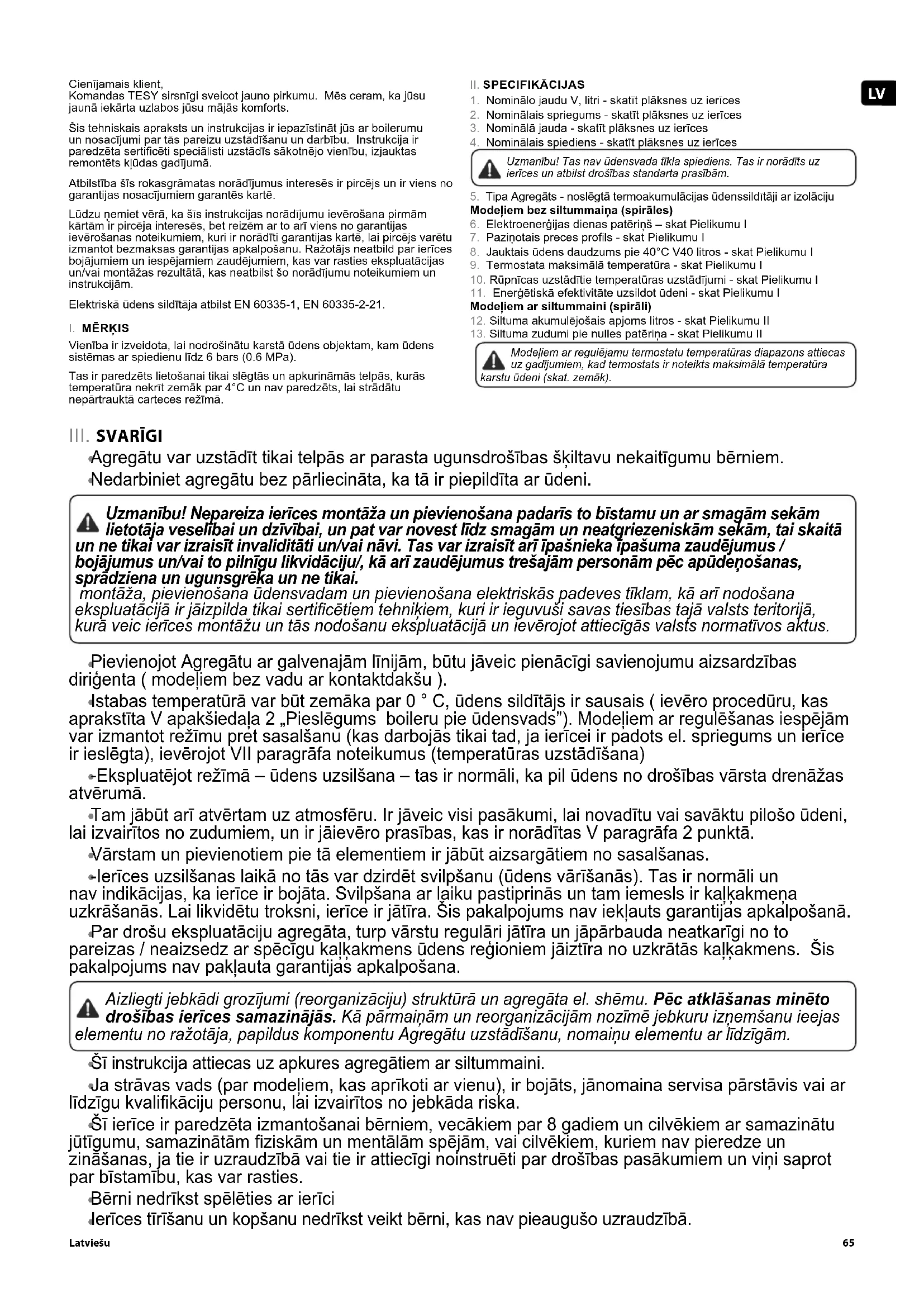 Cienījamais klient, Komandas TESY sirsnīgi sveicot jauno pirkumu. Mēs ceram, ka jūsu jaunā iekārta uzlabos jūsu mājās komforts. Šis tehniskais apraksts un instrukcijas ir iepazīstināt jūs ar boilerumu un nosacījumi par tās pareizu uzstādīšanu un darbību. Instrukcija ir paredzēta serticēti speciālisti uzstādīs sākotnējo vienību, izjauktas remontēts kļūdas gadījumā. Atbilstība šīs rokasgrāmatas norādījumus interesēs ir pircējs un ir viens no garantijas nosacījumiem garantēs kartē. Lūdzu ņemiet vērā, ka šīs instrukcijas norādījumu ievērošana pirmām kārtām ir pircēja interesēs, bet reizēm ar to arī viens no garantijas ievērošanas noteikumiem, kuri ir norādīti garantijas kartē, lai pircējs varētu izmantot bezmaksas garantijas apkalpošanu. Ražotājs neatbild par ierīces bojājumiem un iespējamiem zaudējumiem, kas var rasties ekspluatācijas un/vai montāžas rezultātā, kas neatbilst šo norādījumu noteikumiem un instrukcijām. Elektriskā ūdens sildītāja atbilst EN 60335-1, EN 60335-2-21.