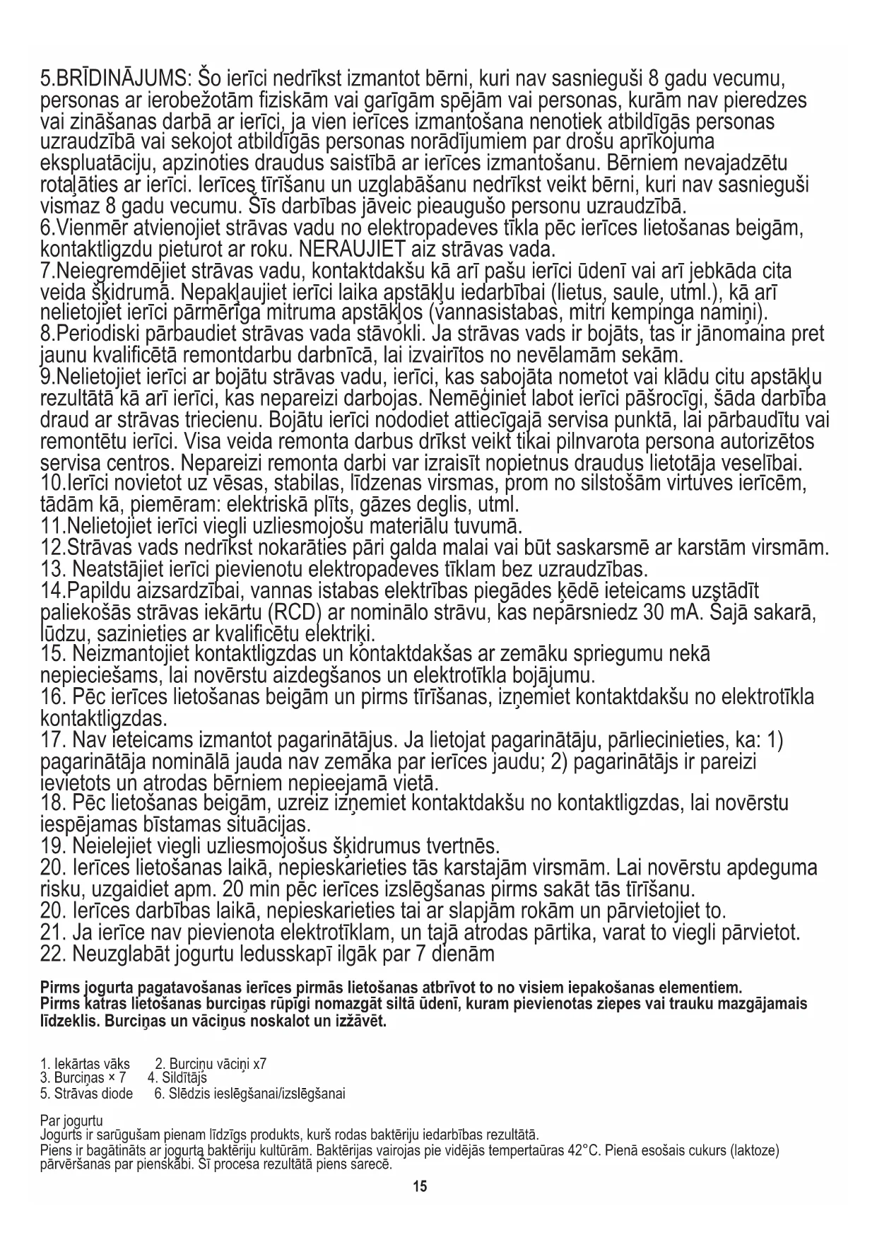 risku, uzgaidiet apm. 20 min pēc ierīces izslēgšanas pirms sakāt tās tīrīšanu. 10.Ierīci novietot uz vēsas, stabilas, līdzenas virsmas, prom no silstošām virtuves ierīcēm, tādām kā, piemēram: elektriskā plīts, gāzes deglis, utml. Pirms jogurta pagatavošanas ierīces pirmās lietošanas atbrīvot to no visiem iepakošanas elementiem. 9.Nelietojiet ierīci ar bojātu strāvas vadu, ierīci, kas sabojāta nometot vai klādu citu apstākļu rezultātā kā arī ierīci, kas nepareizi darbojas. Nemēģiniet labot ierīci pāšrocīgi, šāda darbība draud ar strāvas triecienu. Bojātu ierīci nododiet attiecīgajā servisa punktā, lai pārbaudītu vai remontētu ierīci. Visa veida remonta darbus drīkst veikt tikai pilnvarota persona autorizētos servisa centros. Nepareizi remonta darbi var izraisīt nopietnus draudus lietotāja veselībai.