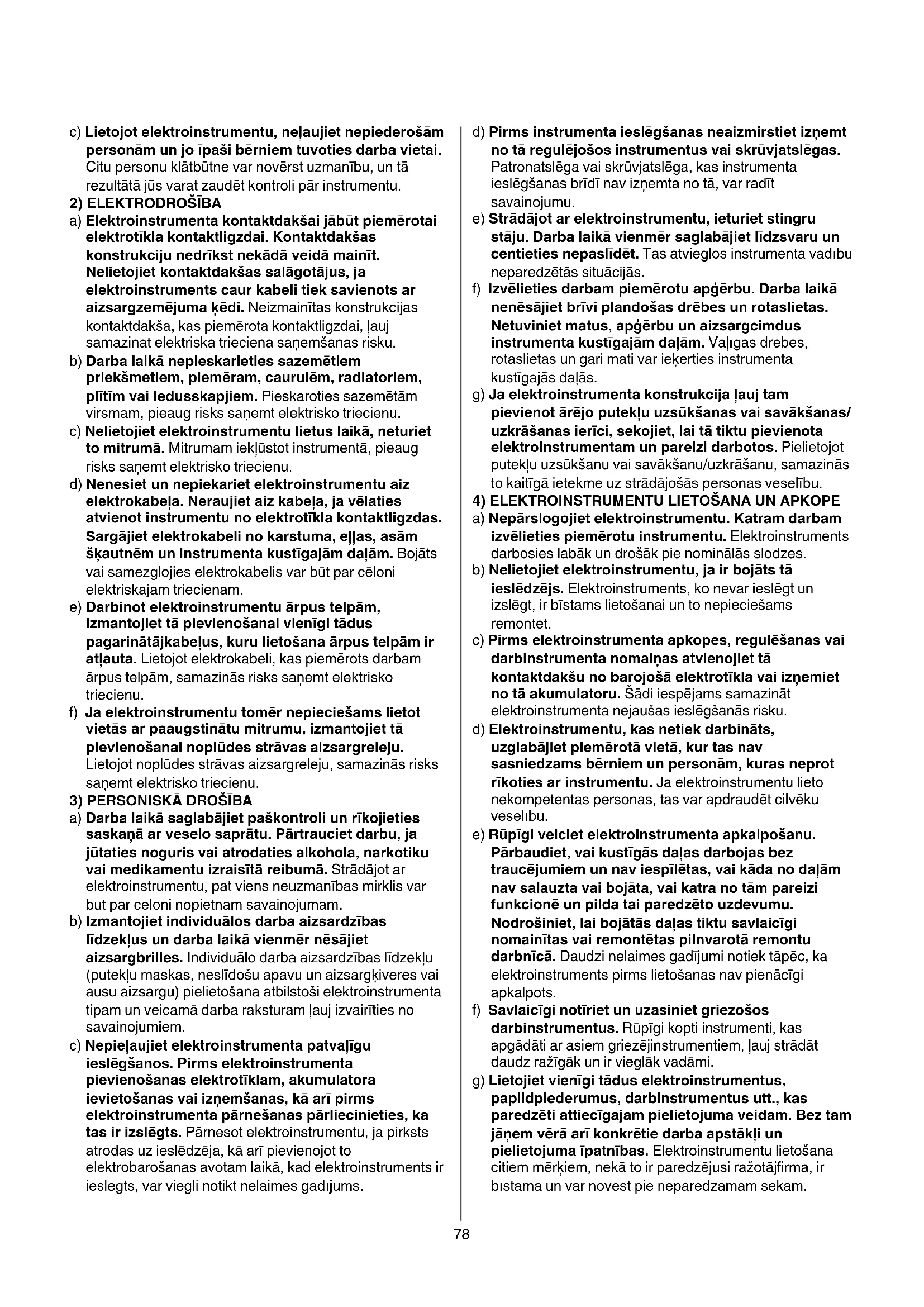 a) Nepārslogojietelektroinstrumentu.Katramdarbam izvēlietiespiemērotuinstrumentu. Elektroinstruments darbosies labāk un drošāk pie nominālās slodzes. b) Nelietojietelektroinstrumentu,jairbojātstā ieslēdzējs. Elektroinstruments, ko nevar ieslēgt un izslēgt, ir bīstams lietošanai un to nepieciešams remontēt. c) Pirmselektroinstrumentaapkopes,regulēšanasvai darbinstrumentanomaiņasatvienojiettā kontaktdakšunobarojošāelektrotīklavaiizņemiet notāakumulatoru. Šādi iespējams samazināt elektroinstrumenta nejaušas ieslēgšanās risku. d) Elektroinstrumentu,kasnetiekdarbināts, uzglabājietpiemērotāvietā,kurtasnav sasniedzamsbērniemunpersonām,kurasneprot rīkotiesarinstrumentu. Ja elektroinstrumentu lieto nekompetentas personas, tas var apdraudēt cilvēku veselību. e) Rūpīgiveicietelektroinstrumentaapkalpošanu. Pārbaudiet,vaikustīgāsdaļasdarbojasbez traucējumiemunnaviespīlētas,vaikādanodaļām navsalauztavaibojāta,vaikatranotāmpareizi funkcionēunpildataiparedzētouzdevumu. Nodrošiniet,laibojātāsdaļastiktusavlaicīgi nomainītasvairemontētaspilnvarotāremontu darbnīcā. Daudzi nelaimes gadījumi notiek tāpēc, ka elektroinstruments pirms lietošanas nav pienācīgi apkalpots. f) Savlaicīginotīrietunuzasinietgriezošos darbinstrumentus. Rūpīgi kopti instrumenti, kas apgādāti ar asiem griezējinstrumentiem, ļauj strādāt daudz ražīgāk un ir vieglāk vadāmi. g) Lietojietvienīgitāduselektroinstrumentus, papildpiederumus, darbinstrumentus utt., kas paredzētiattiecīgajampielietojumaveidam.Beztam jāņemvērāarīkonkrētiedarbaapstākļiun pielietojumaīpatnības. Elektroinstrumentu lietošana citiem mērķiem, nekā to ir paredzējusi ražotājfirma, ir bīstama un var novest pie neparedzamām sekām.79