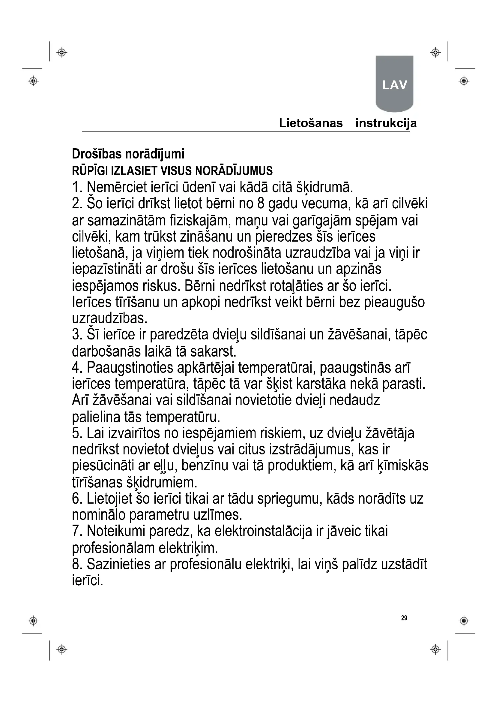 ar samazinātām fiziskajām, maņu vai garīgajām spējam vai cilvēki, kam trūkst zināšanu un pieredzes šīs ierīces lietošanā, ja viņiem tiek nodrošināta uzraudzība vai ja viņi ir iepazīstināti ar drošu šīs ierīces lietošanu un apzinās iespējamos riskus. Bērni nedrīkst rotaļāties ar šo ierīci. Ierīces tīrīšanu un apkopi nedrīkst veikt bērni bez pieaugušo uzraudzības.