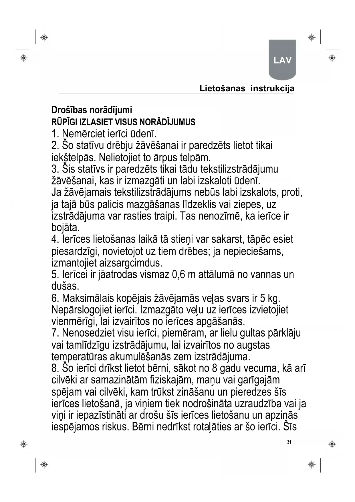 18. Izmantojiet šo statīvu drēbju žāvēšanai tikai tā, kā