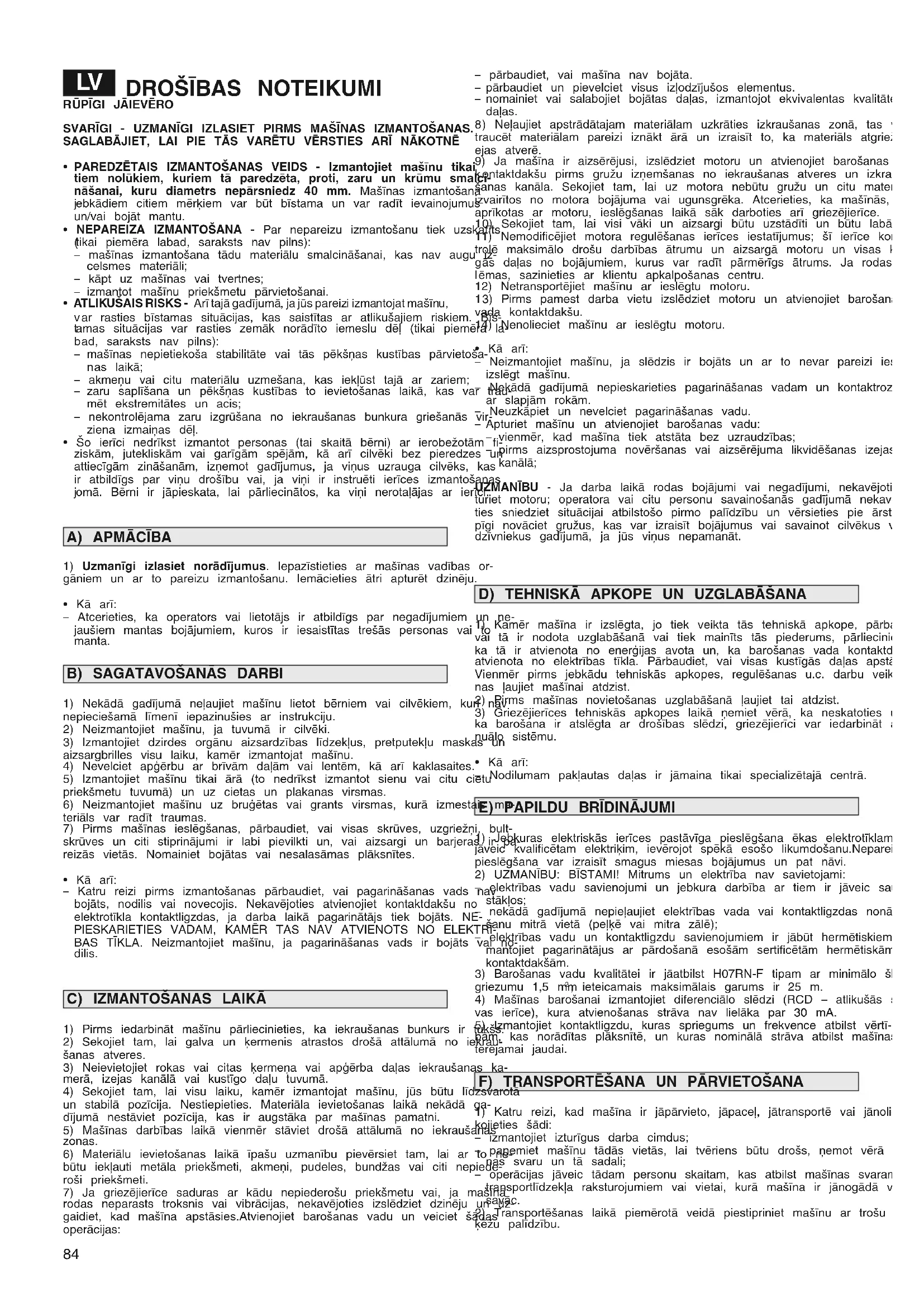 DROŠĪBAS NOTEIKUMI - Jūsu mašīna jālieto piesardzīgi. Ar šo nolūku uz mašīnas ir izvietotas piktogrammas, kas atgādinās jums par galvenajiem pie- sardzības pasākumiem lietošanas laikā. To nozīme ir izskaidrota tālāk tekstā. Turklāt iesakām jums uzmanīgi izlasīt drošības noteikumus, kas ir izklāstīti šīs rokasgrāmatas attiecīgajā sadaļā. Nomainiet bojātas vai nesalasāmas plāksnītes.