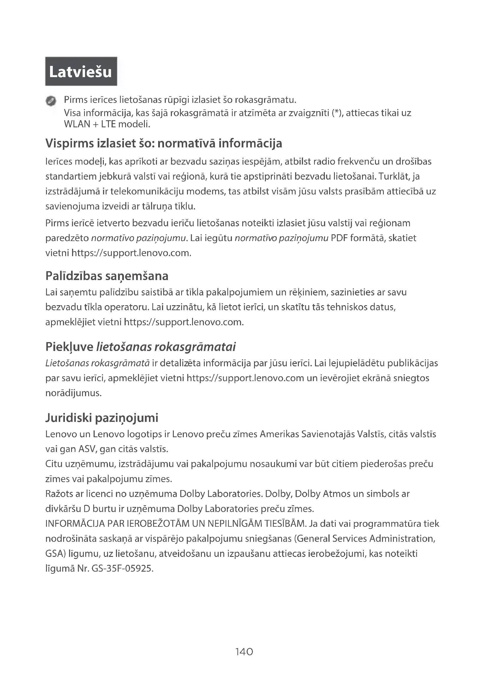 Vispirms izlasiet šo: normatīvā informācija Ierīces modeļi, kas aprīkoti ar bezvadu saziņas iespējām, atbilst radio frekvenču un drošības standartiem jebkurā valstī vai reģionā, kurā tie apstiprināti bezvadu lietošanai. Turklāt, ja izstrādājumā ir telekomunikāciju modems, tas atbilst visām jūsu valsts prasībām attiecībā uz savienojuma izveidi ar tālruņa tīklu. Pirms ierīcē ietverto bezvadu ierīču lietošanas noteikti izlasiet jūsu valstij vai reģionam paredzēto normatīvo paziņojumu. Lai iegūtu normatīvo paziņojumu PDFformātā, skatiet vietni https://support.lenovo.com. Palīdzības saņemšana Lai saņemtu palīdzību saistībā ar tīkla pakalpojumiem un rēķiniem, sazinieties ar savu bezvadu tīkla operatoru. Lai uzzinātu, kā lietot ierīci, un skatītu tās tehniskos datus, apmeklējiet vietni https://support.lenovo.com. Piekļuve lietošanas rokasgrāmatai Lietošanas rokasgrāmatā ir detalizēta informācija par jūsu ierīci. Lai lejupielādētu publikācijas par savu ierīci, apmeklējiet vietni https://support.lenovo.com un ievērojiet ekrānā sniegtos norādījumus. Juridiski paziņojumi Lenovo un Lenovo logotips ir Lenovo preču zīmes Amerikas Savienotajās Valstīs, citās valstīs vai gan ASV, gan citās valstīs. Citu uzņēmumu, izstrādājumu vai pakalpojumu nosaukumi var būt citiem piederošas preču zīmes vai pakalpojumu zīmes. Ražots ar licenci no uzņēmuma Dolby Laboratories. Dolby, DolbyAtmos un simbols ar divkāršu Dburtu ir uzņēmuma DolbyLaboratories preču zīmes. INFORMĀCIJA PAR IEROBEŽOTĀM UN NEPILNĪGĀM TIESĪBĀM. Ja dati vai programmatūra tiek nodrošināta saskaņā ar vispārējo pakalpojumu sniegšanas (General Services Administration, GSA) līgumu, uz lietošanu, atveidošanu un izpaušanu attiecas ierobežojumi, kas noteikti līgumā Nr.GS-35F-05925. Latviešu141 Ierīces pārskats Modelis Versija LenovoYT-X705F WLAN LenovoYT-X705L LTE LenovoYT-X705X LTE+balss