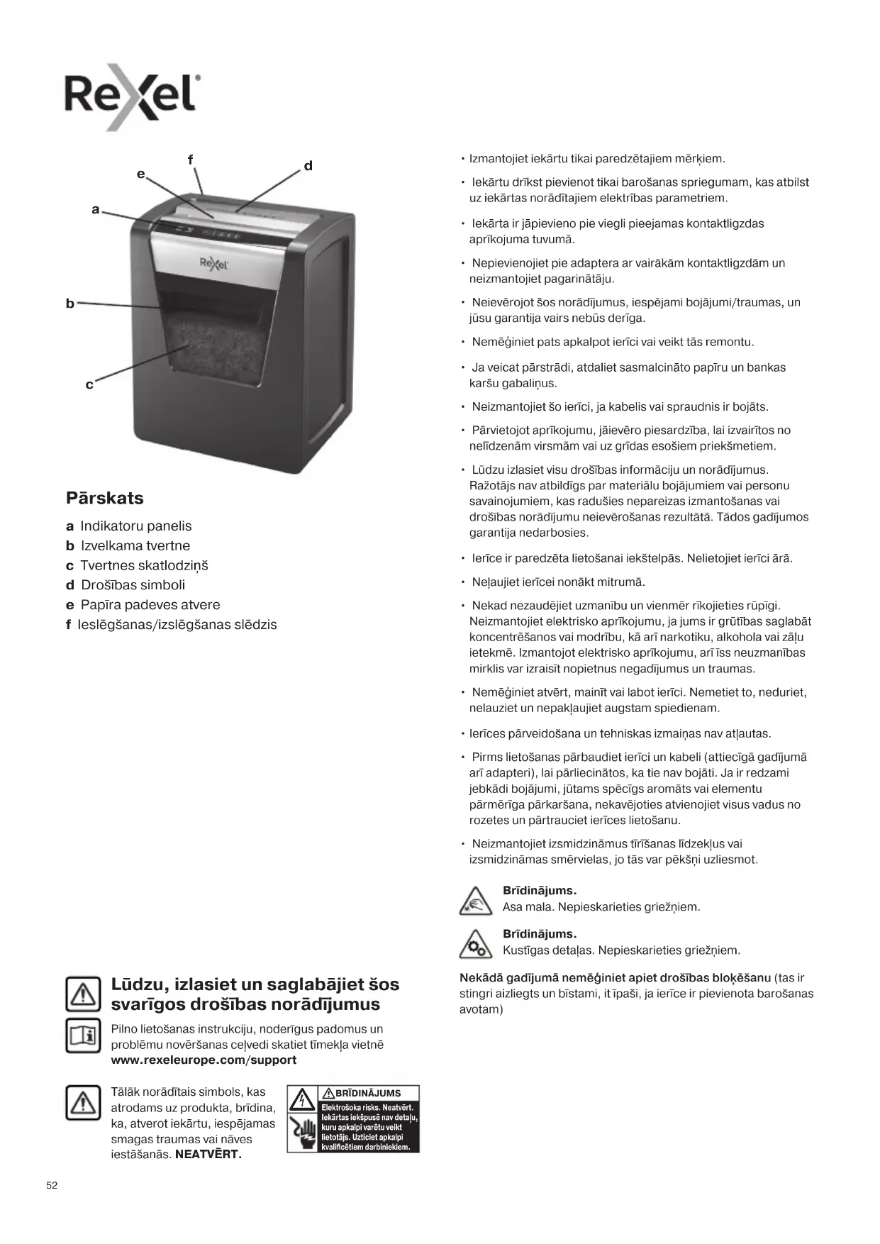 Lūdzu, izlasiet un saglabājiet šos svarīgos drošības norādījumus Pilno lietošanas instrukciju, noderīgus padomus un problēmu novēršanas ceļvedi skatiet tīmekļa vietnē www.rexeleurope.com/support Nekādā gadījumā nemēģiniet apiet drošības bloķēšanu (tas ir stingri aizliegts un bīstami, it īpaši, ja ierīce ir pievienota barošanas avotam) Brīdinājums. Asa mala. Nepieskarieties griežņiem. Brīdinājums. Kustīgas detaļas. Nepieskarieties griežņiem. Pārskats a Indikatoru panelis b Izvelkama tvertne c Tvertnes skatlodziņš d Drošības simboli e Papīra padeves atvere f Ieslēgšanas/izslēgšanas slēdzis