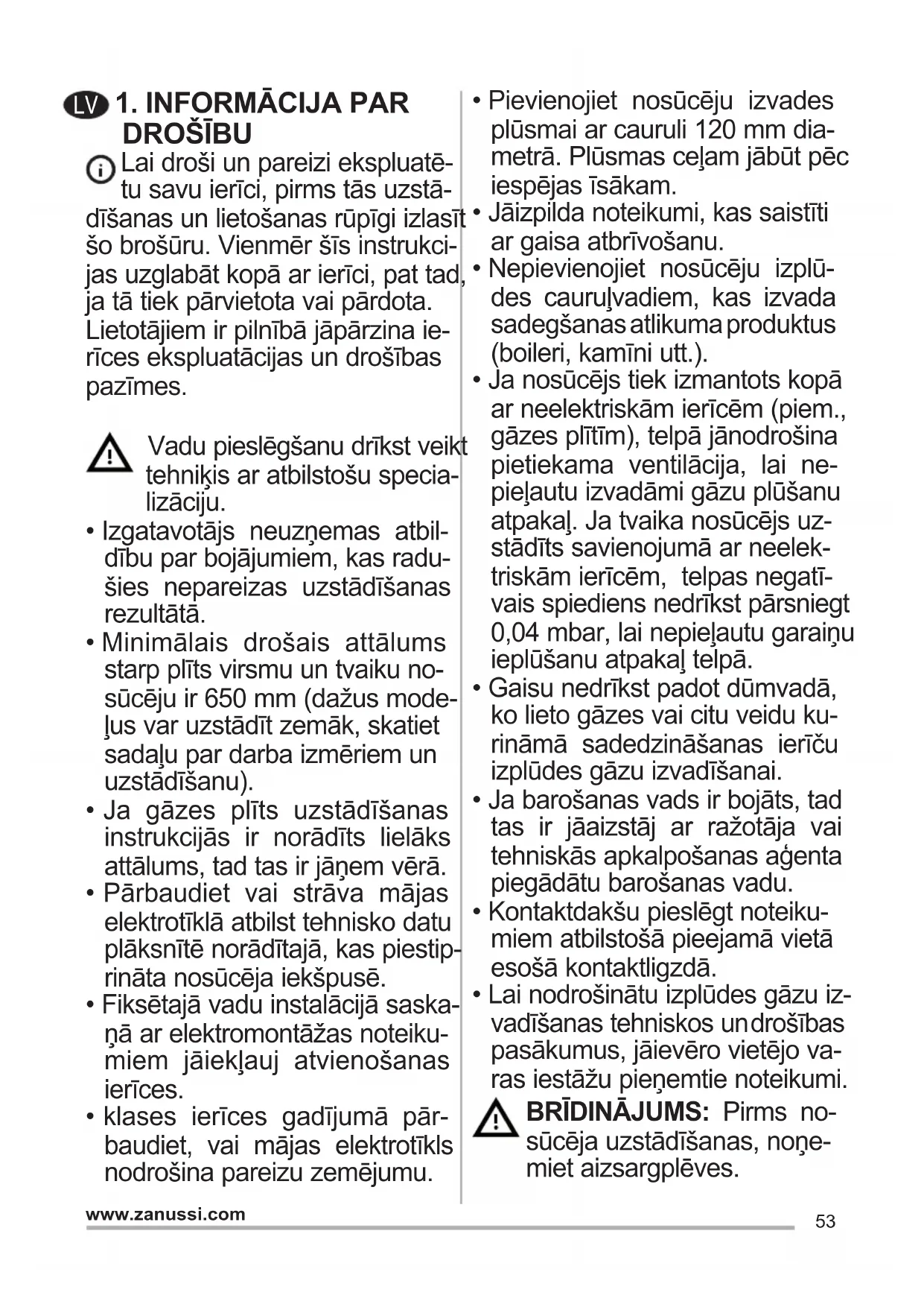 - Lai nodrošinātu izplūdes gāzu iz- vadīšanas tehniskos un drošības pasākumus, jāievēro vietējo va- ras iestāžu pieņemtie noteikumi. BRĪDINĀJUMS: Pirms no- sūcēja uzstādīšanas, noņe- miet aizsargplēves. LV54 www.zanussi.com