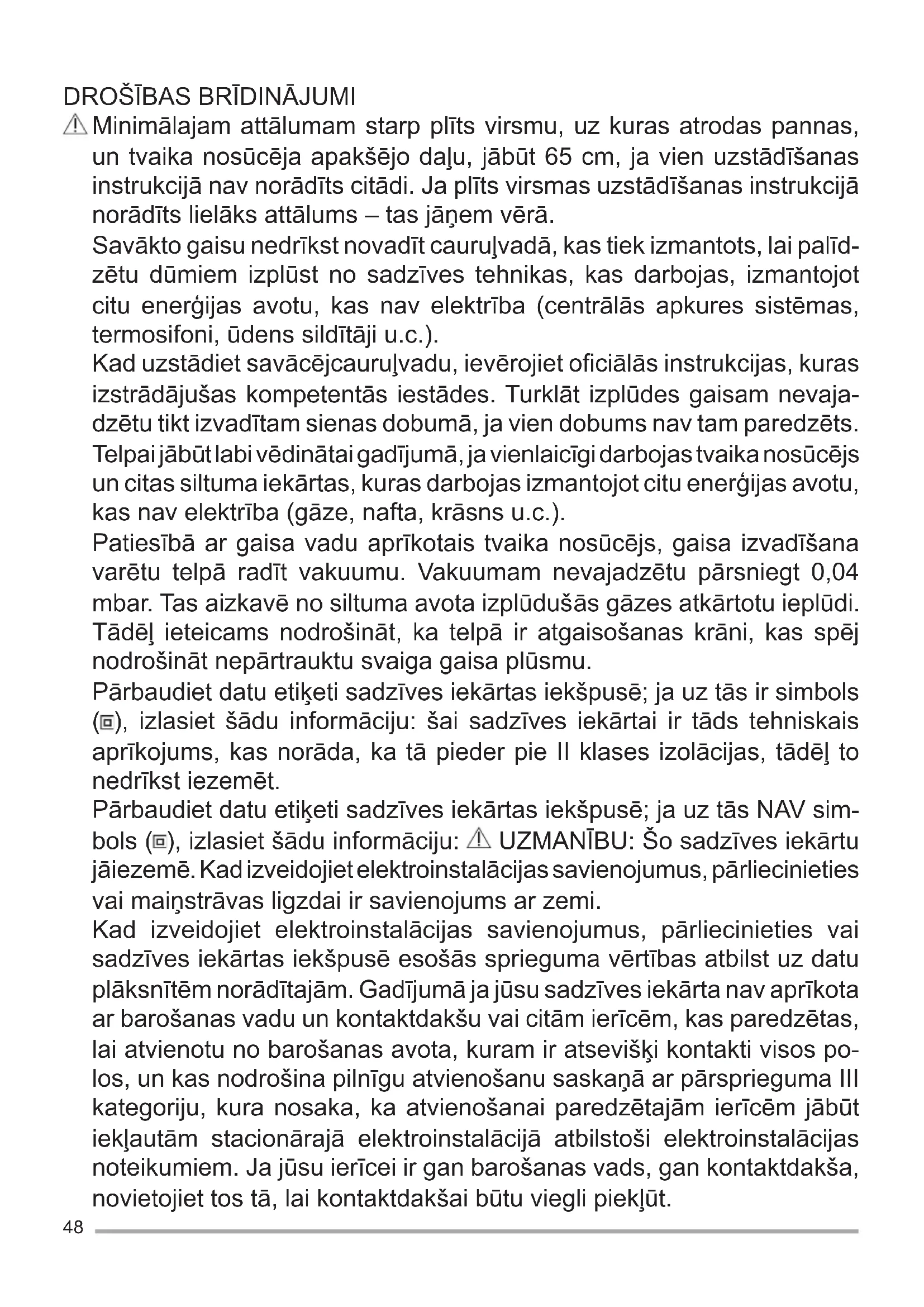 Minimālajam attālumam starp plīts virsmu, uz kuras atrodas pannas, un tvaika nosūcēja apakšējo daļu, jābūt 65 cm, ja vien uzstādīšanas instrukcijā nav norādīts citādi. Ja plīts virsmas uzstādīšanas instrukcijā norādīts lielāks attālums – tas jāņem vērā. Savākto gaisu nedrīkst novadīt cauruļvadā, kas tiek izmantots, lai palīd- zētu dūmiem izplūst no sadzīves tehnikas, kas darbojas, izmantojot citu enerģijas avotu, kas nav elektrība (centrālās apkures sistēmas, termosifoni, ūdens sildīt āji u.c.). Kad uzstādiet savācējcauruļvadu, ievērojiet ofi ciālās instrukcijas, kuras izstrādājušas kompetentās iestādes. Turklāt izplūdes gaisam nevaja- dzētu tikt izvadītam sienas dobumā, ja vien dobums nav tam paredzēts. Telpai jābūt labi vēdinātai gadījumā, ja vienlaicīgi darbojas tvaika nosūcējs un citas siltuma iekārtas, kuras darbojas izmantojot citu enerģijas avotu, kas nav elektrība (gāze, nafta, krāsns u.c.). Patiesībā ar gaisa vadu aprīkotais tvaika nosūcējs, gaisa izvadīšana varētu telpā radīt vakuumu. Vakuumam nevajadzētu pārsniegt 0,04 mbar. Tas aizkavē no siltuma avota izplūduš ās gāzes atkārtotu ieplūdi. Tādēļ ieteicams nodrošināt, ka telpā ir atgaisošanas krāni, kas spēj nodrošināt nepārtrauktu svaiga gaisa plūsmu. Pārbaudiet datu etiķeti sadzīves iekārtas iekšpusē; ja uz tās ir simbols ( ), izlasiet šādu informāciju: šai sadzīves iekārtai ir tāds tehniskais aprīkojums, kas norāda, ka tā pieder pie II klases izolācijas, tādēļ to nedrīkst iezemēt. Pārbaudiet datu etiķeti sadzīves iekārtas iekšpusē; ja uz tās NAV sim- bols ( ), izlasiet šādu informāciju: UZMANĪBU: Šo sadzīves iekārtu jāiezemē. Kad izveidojiet elektroinstalācijas savienojumus, pārliecinieties vai maiņstrāvas ligzdai ir savienojums ar zemi. Kad izveidojiet elektroinstalācijas savienojumus, pārliecinieties vai sadzīves iekārtas iekšpusē esošās sprieguma vērtības atbilst uz datu plāksnītēm norādītajām. Gadījumā ja jūsu sadzīves iekārta nav aprīkota ar barošanas vadu un kontaktdakšu vai citām ierīcēm, kas paredzētas, lai atvienotu no barošanas avota, kuram ir atsevišķi kontakti visos po- los, un kas nodrošina pilnīgu atvienošanu saskaņā ar pārsprieguma III kategoriju, kura nosaka, ka atvienošanai paredzētajām ierīcēm jābūt iekļautām stacionārajā elektroinstalācijā atbilstoši elektroinstalācijas noteikumiem. Ja jūsu ierīcei ir gan barošanas vads, gan kontaktdakša, novietojiet tos tā, lai kontaktdakšai būtu viegli piekļūt.49 Vienmēr atvienojiet elektrības padevi pirms veiciet tīrīšanas vai apkopes darbus uz sadzīves iekārtas. Ja barošanas vads ir bojāts, lai izvairītos no riska, tas jānomaina ražotājam, tā pakalpojumu sniedzējam vai līdzīgi kvalifi cētām personām. Brīdinājums: Neveiksmīgs mēģinājums ieskrūvēt skrūves vai uzstādīt fi ksējošo ierīci saskaņā ar šīm instrukcijām, var radīt elektrodrošības draudus. Sadzīves iekārta jāuzstāda kvalifi cētai personai saskaņā ar norādītajām instrukcijā