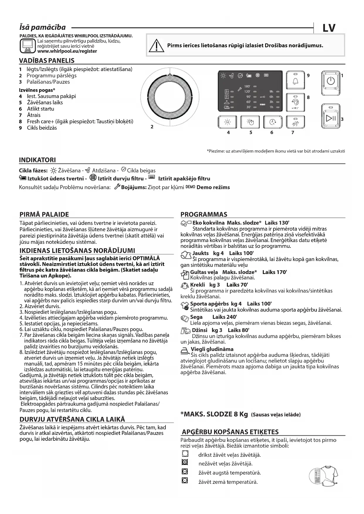 - Vai arī sazinieties ar mūsu pēcpārdošanas apkopes dienestu (telefona numurs norādīts garantijas grāmatiņā). Sazinoties ar mūsu pēcpārdošanas apkopes dienestu, lūdzu, nosauciet kodus, kas redzami izstrādājuma datu plāksnītē. PALDIES, KA IEGĀDĀJĀTIES WHIRLPOOL IZSTRĀDĀJUMU.Lai saņemtu pilnvērtīgu palīdzību, lūdzu, reģistrējiet savu ierīci vietnēwww.whirlpool.eu/register