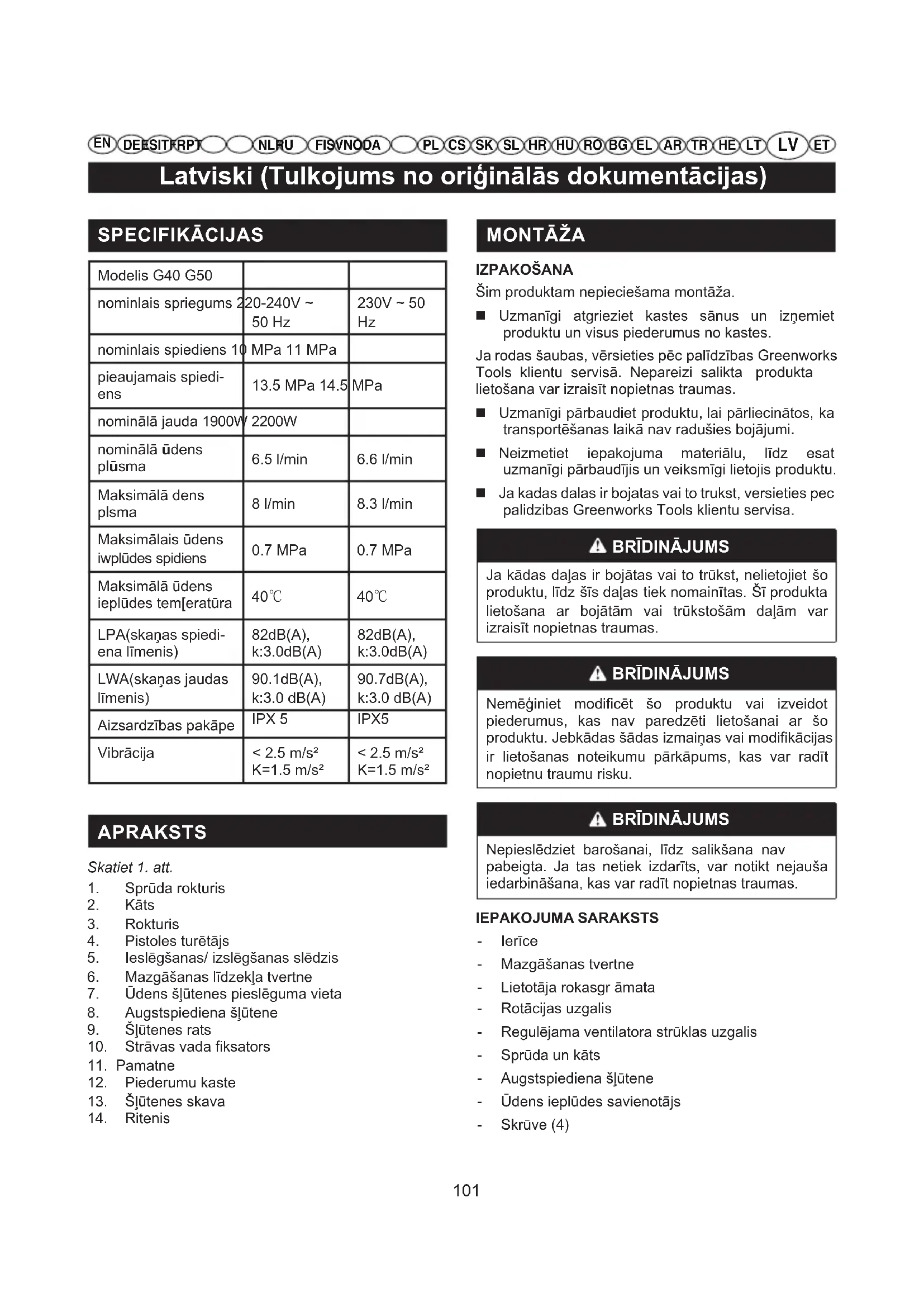 Nepieslēdziet barošanai, līdz salikšana nav pabeigta. Ja tas netiek izdarīts, var notikt nejauša iedarbināšana, kas var radīt nopietnas traumas. IEPAKOJUMA SARAKSTS - Ierīce - Mazgāšanas tvertne - Lietotāja rokasgr āmata - Rotācijas uzgalis - Regulējama ventilatora strūklas uzgalis - Sprūda un kāts - Augstspiediena šļūtene - Ūdens ieplūdes savienotājs - Skrūve (4)102 Latviski (Tulkojums no oriģinālās dokumentācijas)