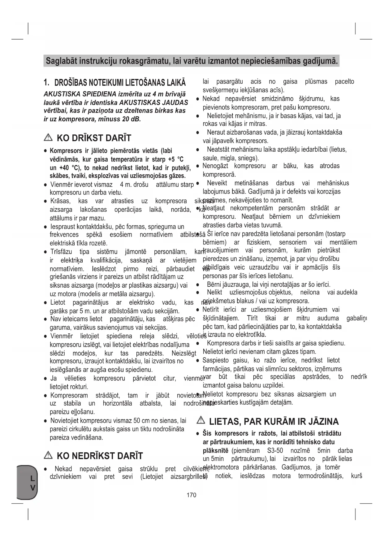 ● Nekad nepavērsiet gaisa strūklu pret cilvēkiem, dzīvniekiem vai pret sevi (Lietojiet aizsargbrilles, lai pasargātu acis no gaisa plūsmas pacelto svešķermeņuiekļūšanasacīs). ● Nekad nepavērsiet smidzināmo šķidrumu, kas pievienotskompresoram,pretpašukompresoru. ● Nelietojietmehānismu,jairbasaskājas,vaitad,ja rokasvaikājasirmitras. ● Nerautaizbarošanasvada,jajāizraujkontaktdakša vaijāpavelkkompresors. ● Neatstātmehānismulaikaapstākļuiedarbībai(lietus, saule,migla,sniegs). ● Nenogāzt kompresoru ar bāku, kas atrodas kompresorā. ● Neveikt metināšanas darbus vai mehāniskus labojumusbākā.Gadījumājairdefektsvaikorozijas pazīmes,nekavējotiestonomanīt. ● Neatļaut nekompetentām personām strādāt ar kompresoru. Neatļaut bērniem un dzīvniekiem atrastiesdarbavietastuvumā. ● Šīierīcenavparedzētalietošanaipersonām(tostarp bērniem) ar fiziskiem, sensoriem vai mentāliem traucējumiem vai personām, kurām pietrūkst pieredzesunzināšanu,izņemot,japarviņudrošību atbildīgais veic uzraudzību vai ir apmācījis šīs personasparšīsierīceslietošanu. ● Bērnijāuzrauga,laiviņinerotaļājasaršoierīci. ● Nelikt uzliesmojošusobjektus, neilona vaiaudekla priekšmetusblakus/vaiuzkompresora. ● Netīrīt ierīci ar uzliesmojošiem šķidrumiem vai šķīdinātajiem. Tīrīt tikai ar mitru auduma gabaliņu pēctam,kadpārliecinājātiesparto,kakontaktdakša irizrautanoelektrotīkla. ● Kompresoradarbsirtiešisaistītsargaisaspiedienu. Nelietotierīcinevienamcitamgāzestipam. ● Saspiesto gaisu, ko ražo ierīce, nedrīkst lietot farmācijas,pārtikasvaislimnīcusektoros,izņēmums var būt tikai pēc speciālas apstrādes, to nedrīkst izmantotgaisabalonuuzpildei. ● Nelietot kompresoru bez siksnas aizsargiem un nepieskartieskustīgajāmdetaļām.