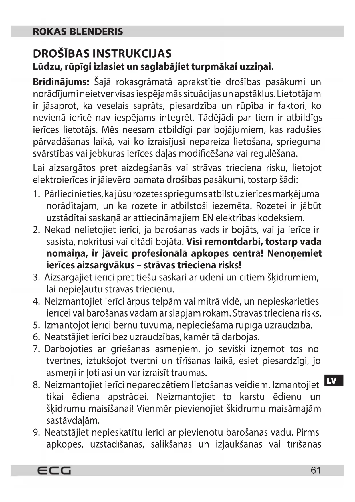 sasista, nokritusi vai citādi bojāta. Visi remontdarbi, tostarp vada nomaiņa, ir jāveic profesionālā apkopes centrā! Nenoņemiet ierīces aizsargvākus – strāvas trieciena risks!