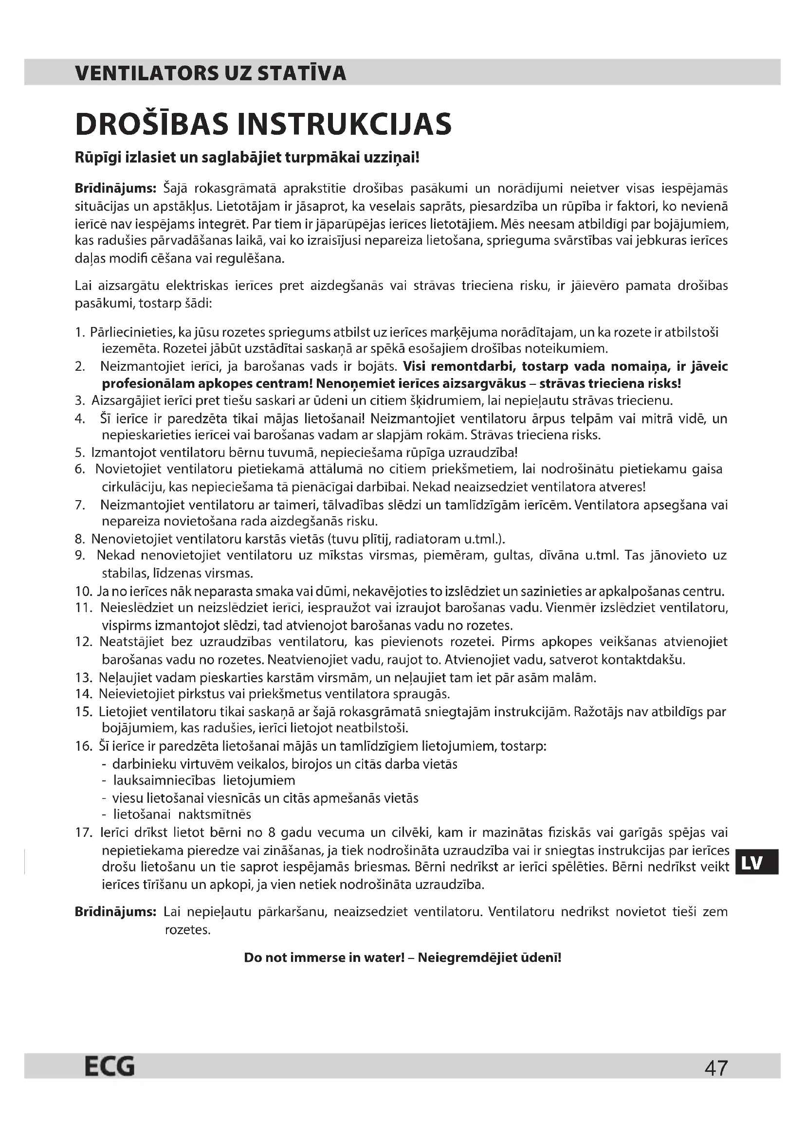nepietiekama pieredze vai zināšanas, ja tiek nodrošināta uzraudzība vai ir sniegtas instrukcijas par ierīces drošu lietošanu un tie saprot iespējamās briesmas. Bērni nedrīkst ar ierīci spēlēties. Bērni nedrīkst veikt ierīces tīrīšanu un apkopi, ja vien netiek nodrošināta uzraudzība. Brīdinājums: Lai nepieļautu pārkaršanu, neaizsedziet ventilatoru. Ventilatoru nedrīkst novietot tieši zem rozetes. Do not immerse in water! – Neiegremdējiet ūdenī!LV