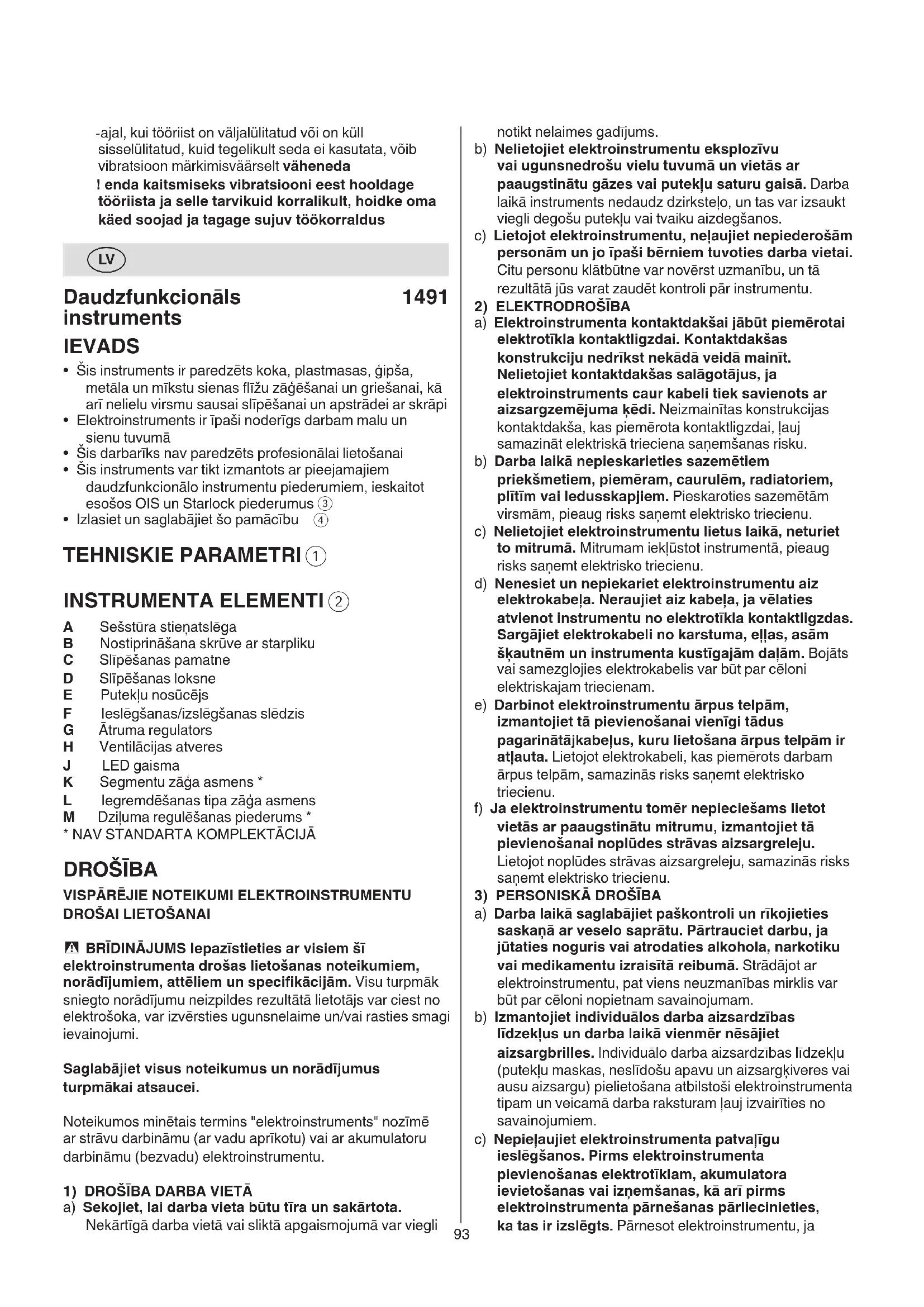 - LED-märgutuli J süttib lüliti F aktiveerimisel automaatselt93 notikt nelaimes gadījums. b) Nelietojiet elektroinstrumentu eksplozīvu vai ugunsnedrošu vielu tuvumā un vietās ar paaugstinātu gāzes vai putekļu saturu gaisā. Darba laikā instruments nedaudz dzirksteļo, un tas var izsaukt viegli degošu putekļu vai tvaiku aizdegšanos. c) Lietojot elektroinstrumentu, neļaujiet nepiederošām personām un jo īpaši bērniem tuvoties darba vietai. Citu personu klātbūtne var novērst uzmanību, un tā rezultātā jūs varat zaudēt kontroli pār instrumentu.
